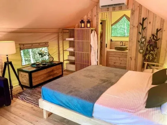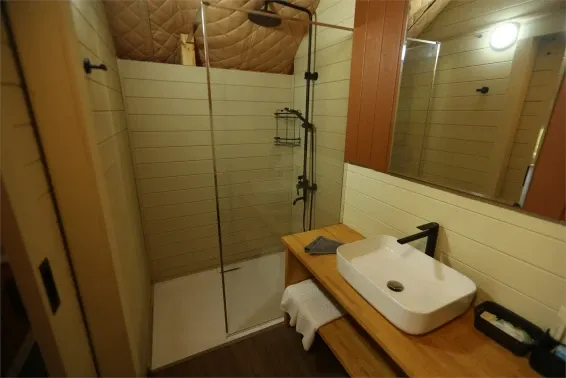 Современный сафари лодж с кондиционером и купелью-фурако на веранде (подготовка фурако оплачивается отдельно)! Отдыхайте в гармонии с природой, не жертвуя уютом и современными удобствами. В сафари лодже всё создано для вашего максимального комфорта: — одна двуспальная или две односпальные кровати на выбор; — просторный раскладной диван для отдыха днём; — кондиционер для комфортного проживания в любую погоду; — современный санузел с душем и набором косметики; — чайная станция и вместительный холодильник для ваших любимых продуктов; — система «Умный дом» для управления освещением и температурой; — тёплый пол для уюта даже в прохладные дни; — личная терраса с уютной зоной отдыха и собственной купелью-фурако — понежьтесь в горячей воде, любуясь природой и ощущая полное расслабление. Просыпайтесь под пение птиц и встречайте новый день с видом на озеро — здесь вы сможете по-настоящему отдохнуть и зарядиться энергией.