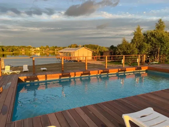 Лодж Озерный Простор с фуракоВместимость до 5 мест. Один ребёнок до 6 лет — можно без отдельного спального места.