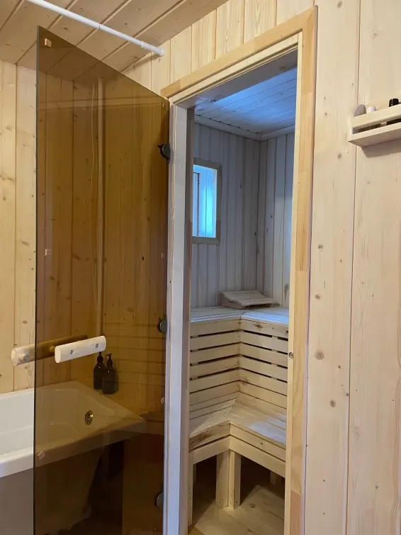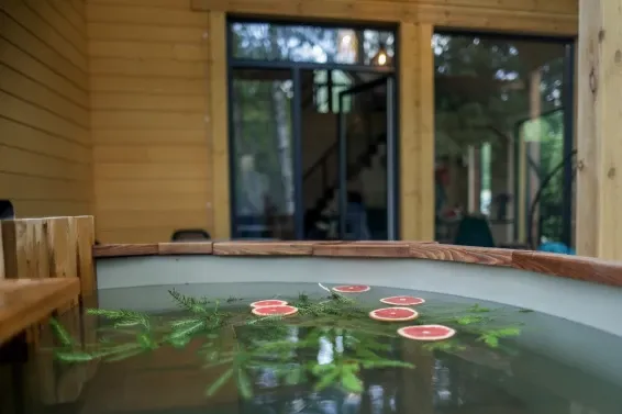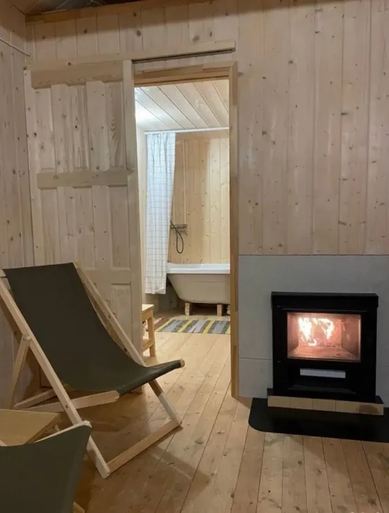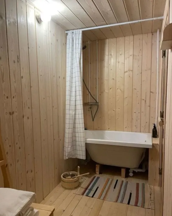 В баньке есть парная, помывочное отделение с горячей и холодной водой, ванной, комната отдыха со столом, камином и шезлонгами.