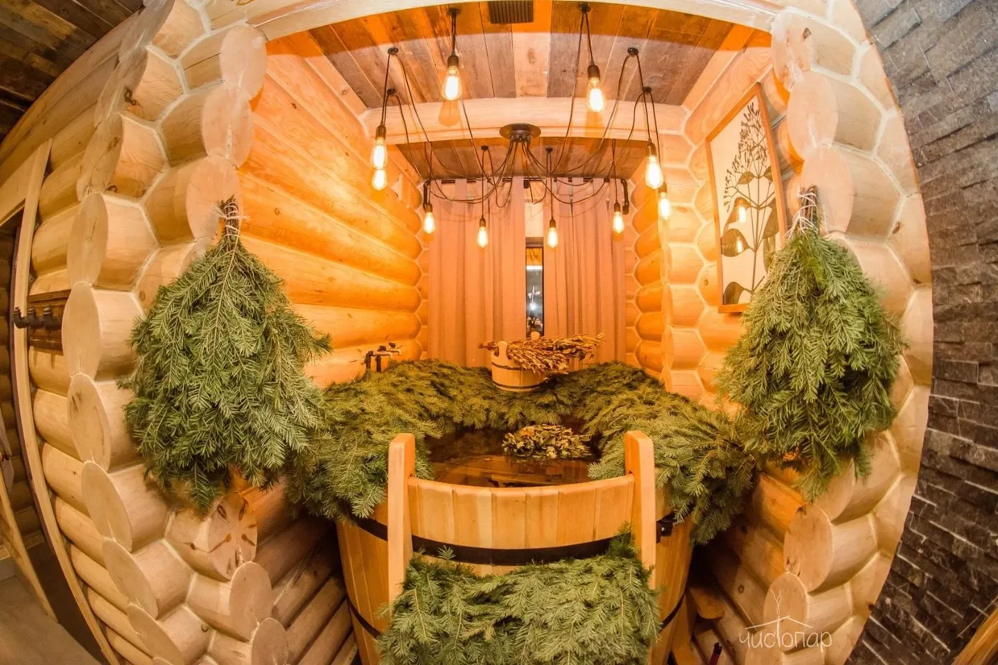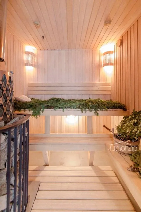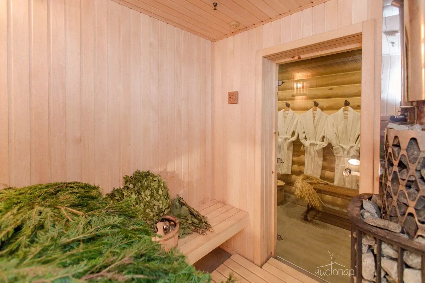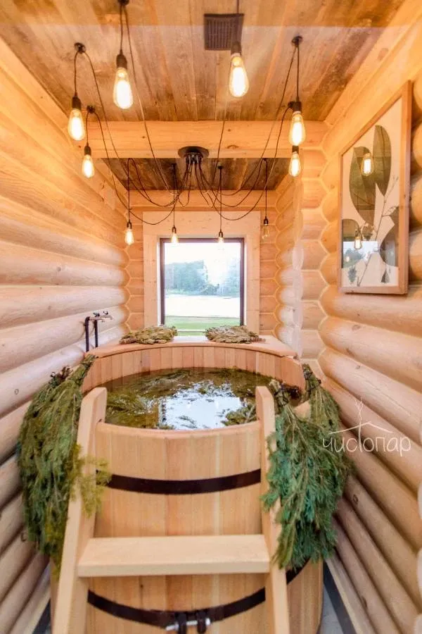 Парная, изготовленная из липы, с русской печью на березовых дровах. Купель на первом этаже, из которой открывается вид на лужайку из панорамного окна.