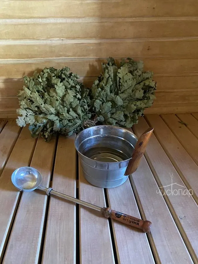 В бане легкий пар и можно выбирать веники себе по душе - дубовые, березовые, липовые, пихтовые, можжевеловые, дающие аромат и тепло телу.
