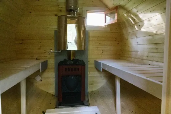 Гости могут попариться в бане-бочке, расслабляясь после активного дня.