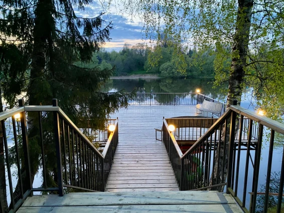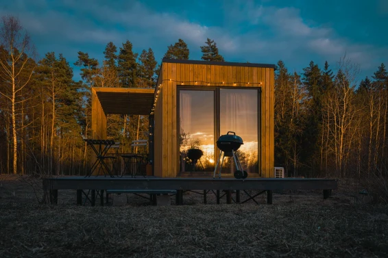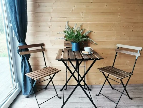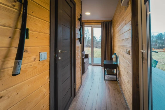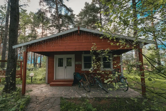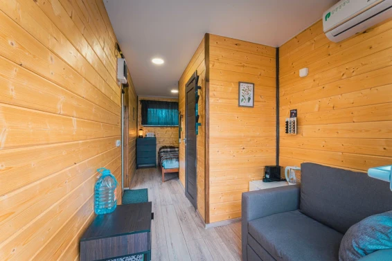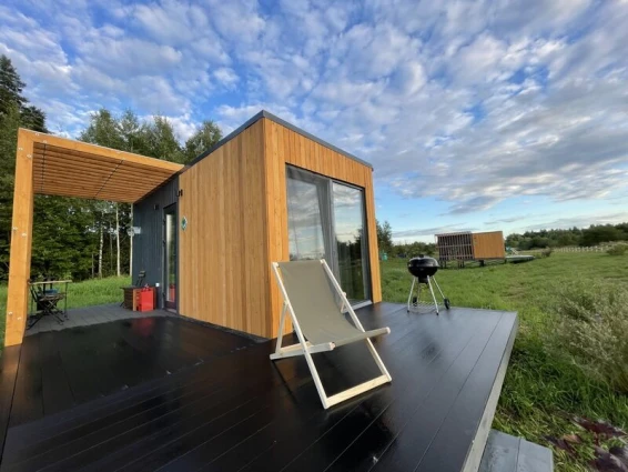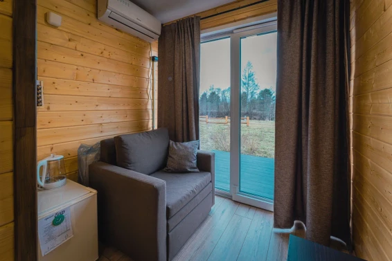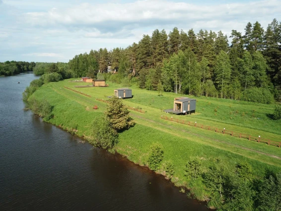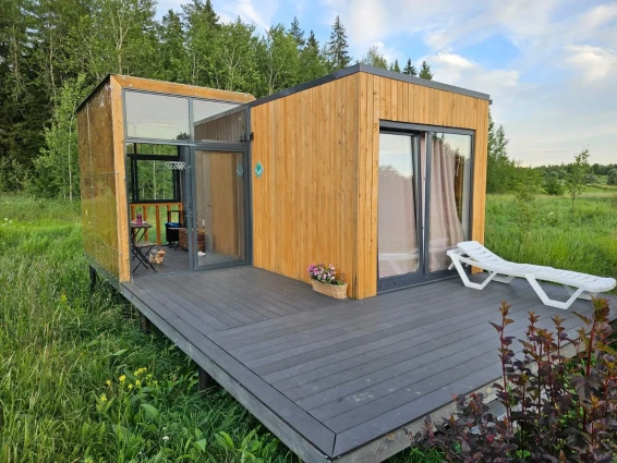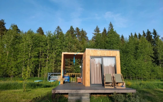 Отдельно стоящий компактный двухместный Глэмп-домик с двуспальной кроватью и собственной верандой с панорамными окнами в 10 метрах от реки. Возможно размещение втроем - гостиная оборудована раздвижным креслом. Санузел оборудован душевой кабиной и феном. Домик укомплектован садовой мебелью, барбекю и играми. Из панорамных окон открывается шикарный вид на речку и закат. Идеально подходит для рыбаков и семейных пар с одним ребенком.