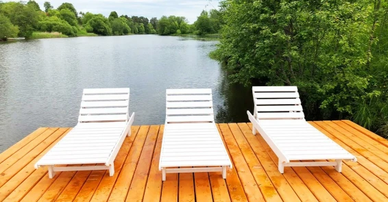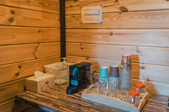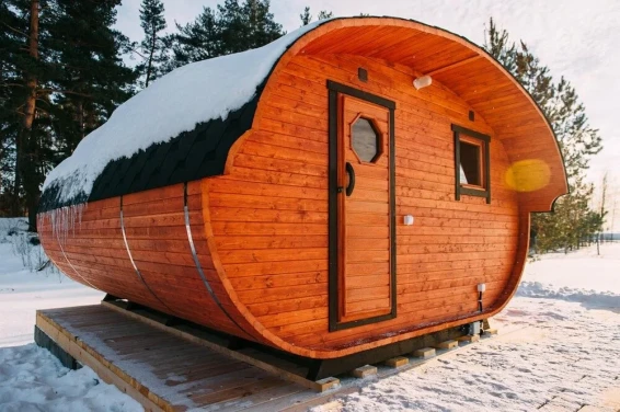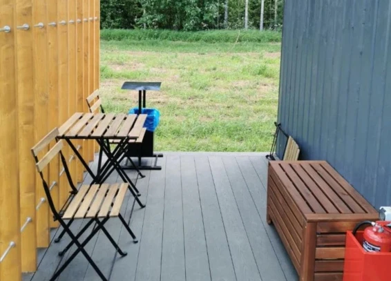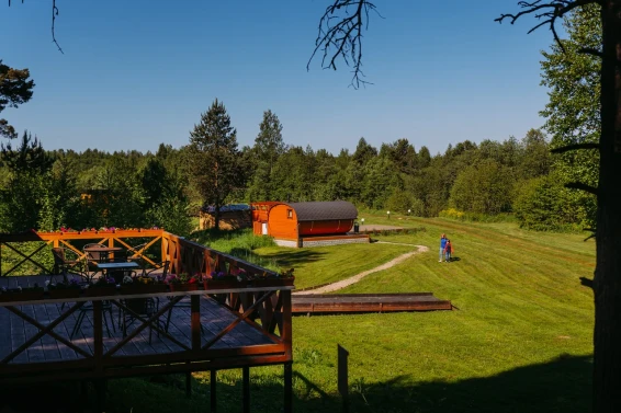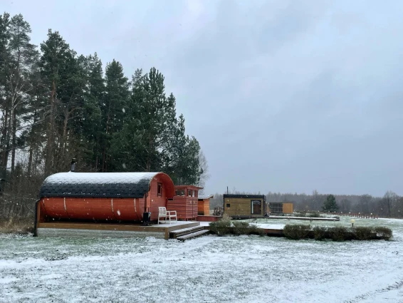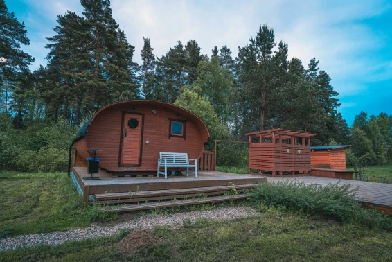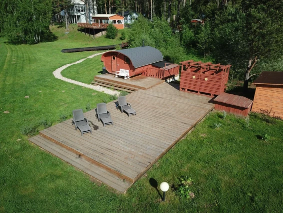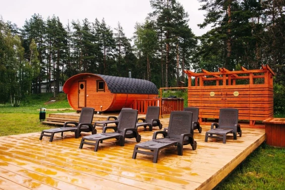 На территории глэмпинга есть баня-бочка с просторной террасой и шезлонгами.
