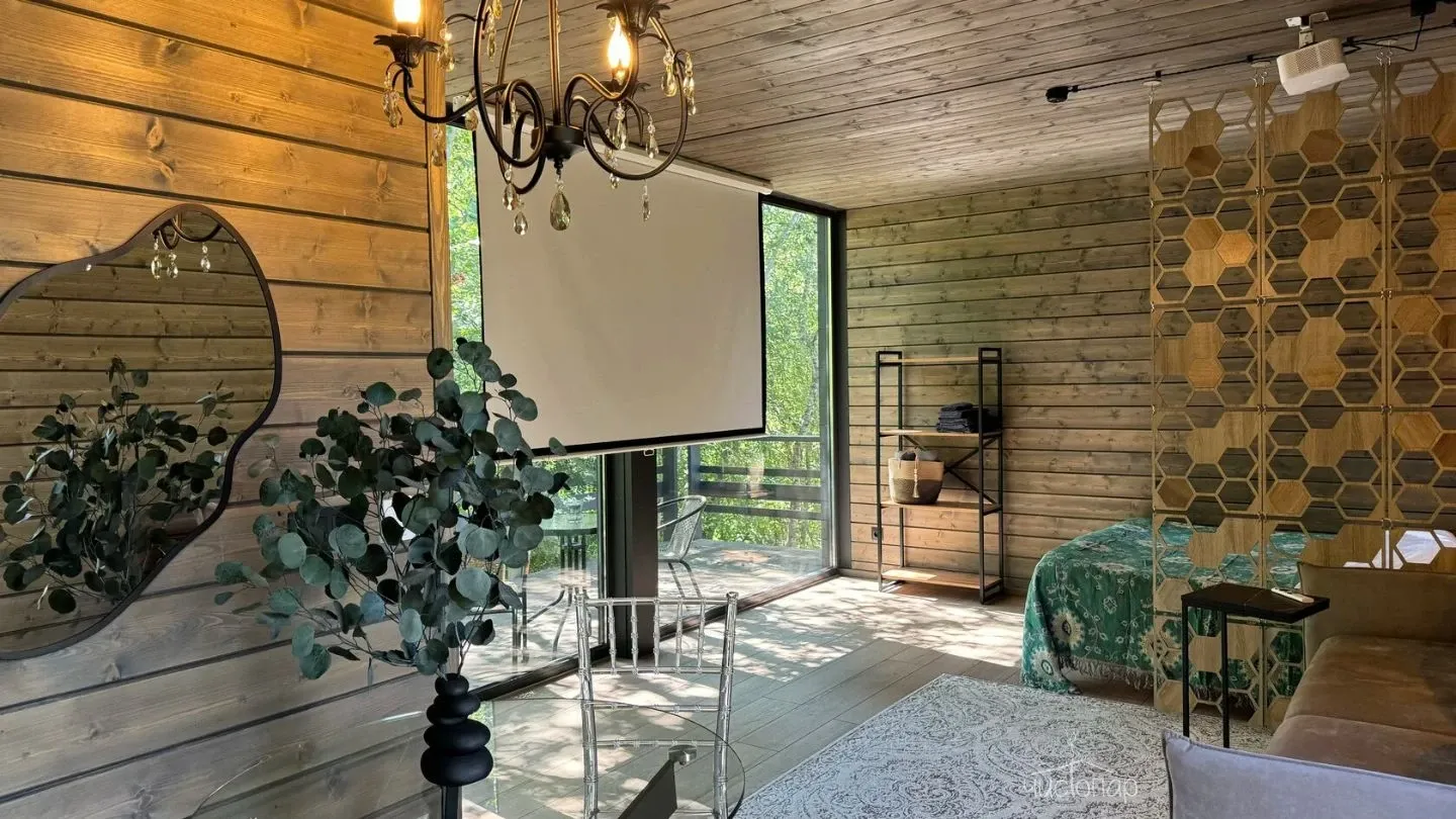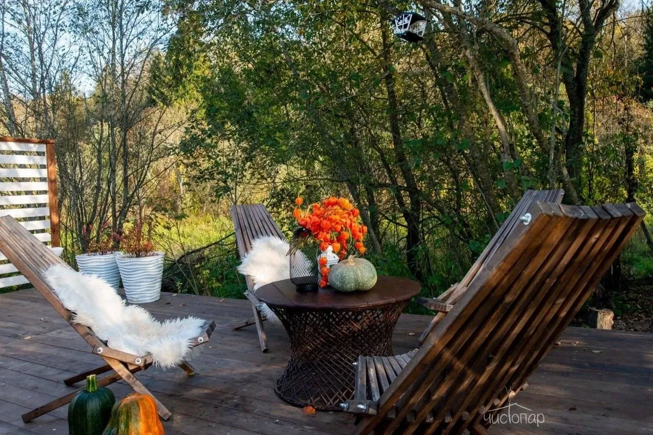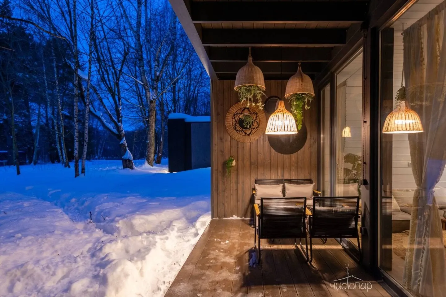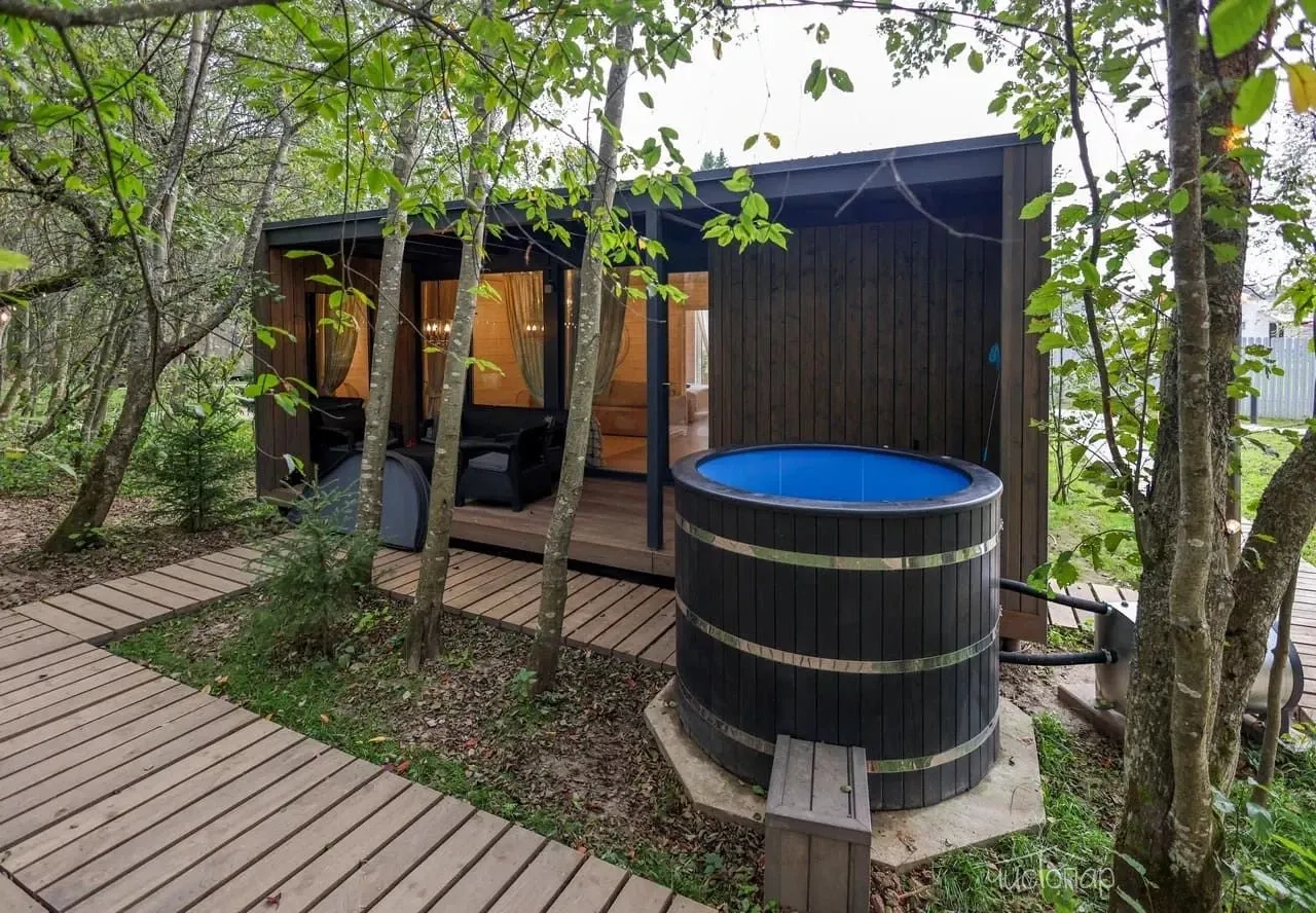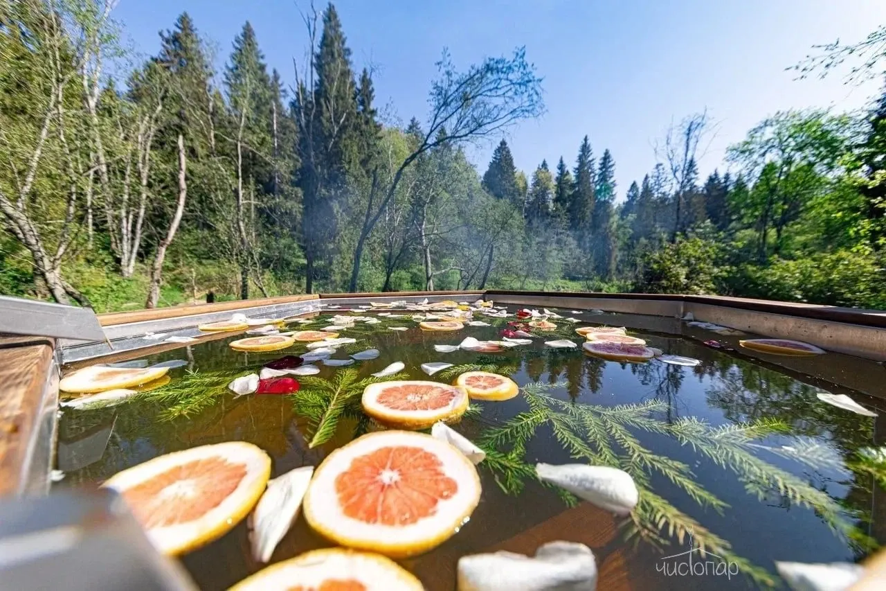 Здесь можно пожарить шашлыки, попариться в бане, искупаться в горячем чане, посмотреть кино на проекторе, покататься на катке и заказать готовый завтрак и продукты из местных ресторанов.