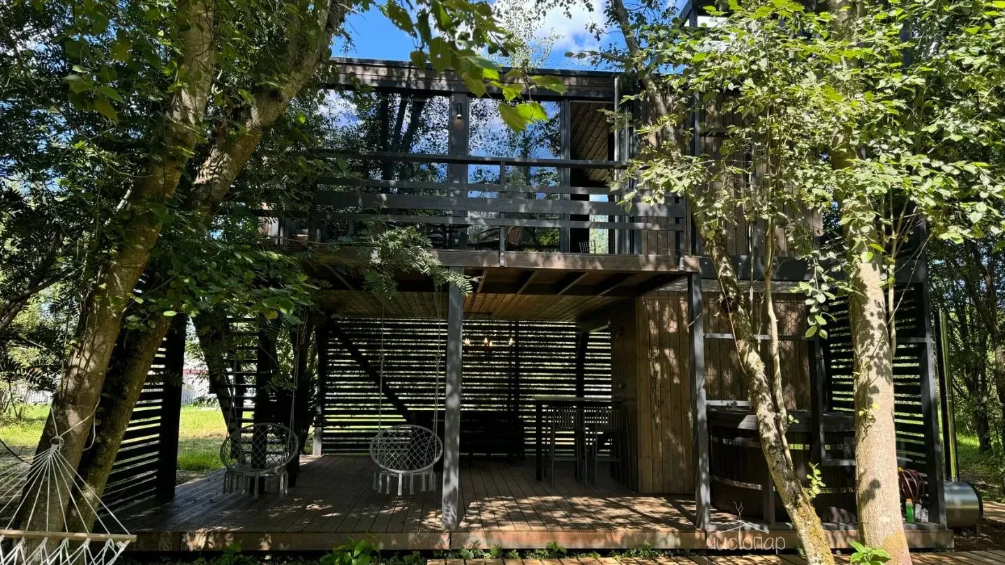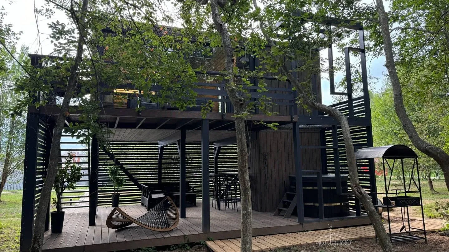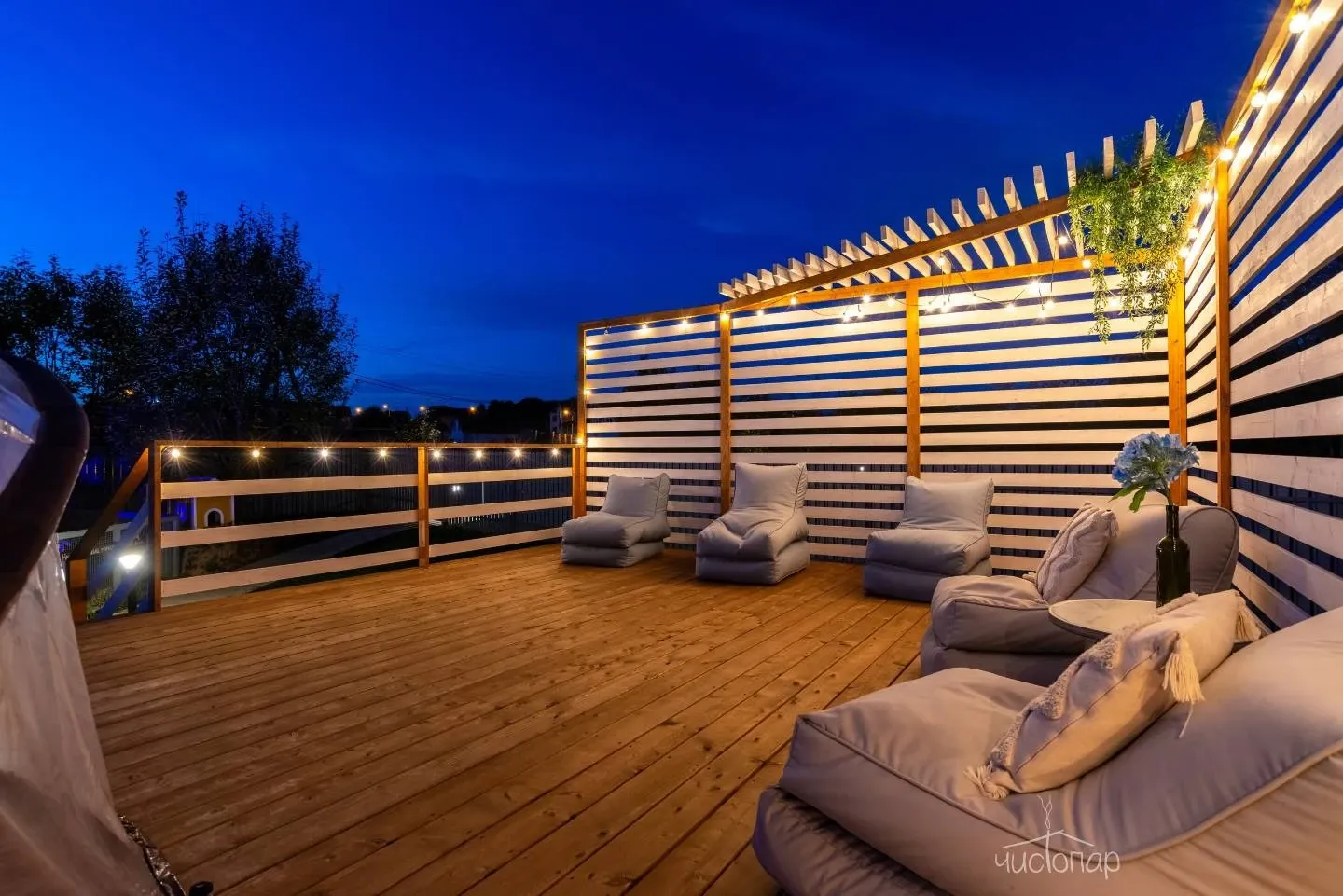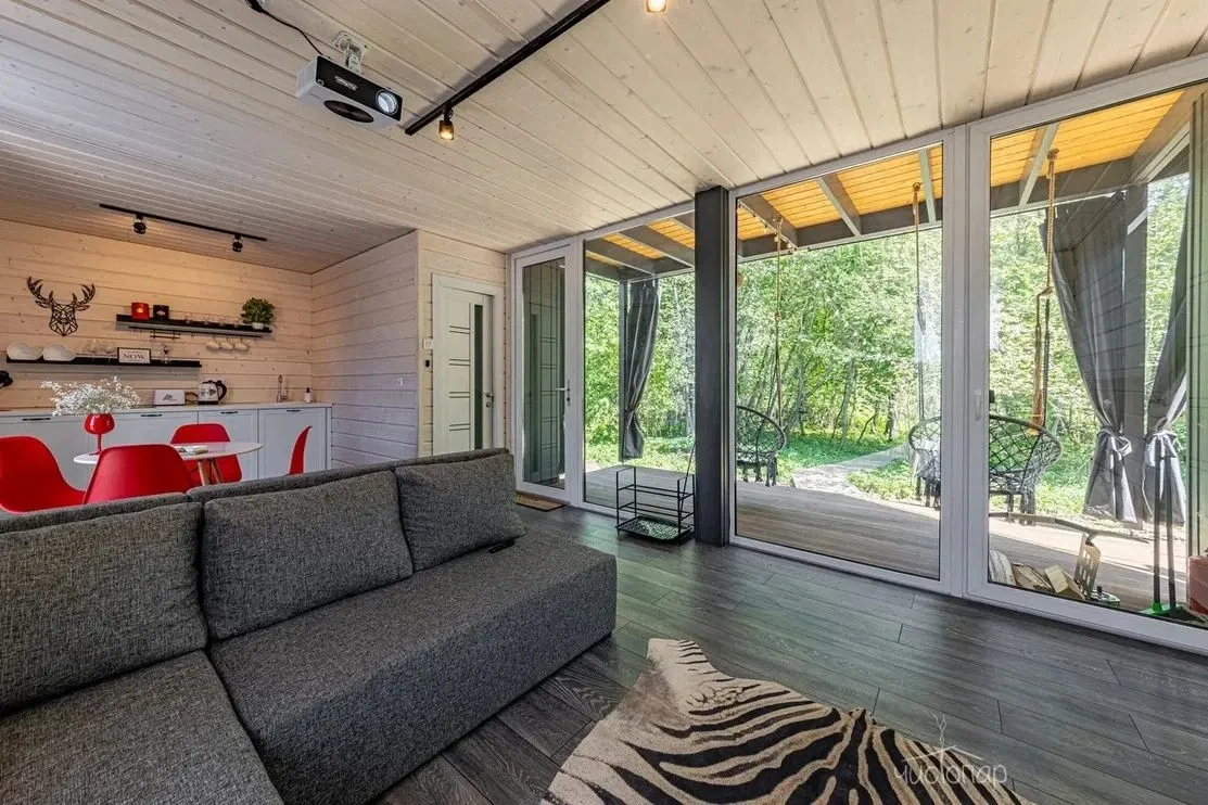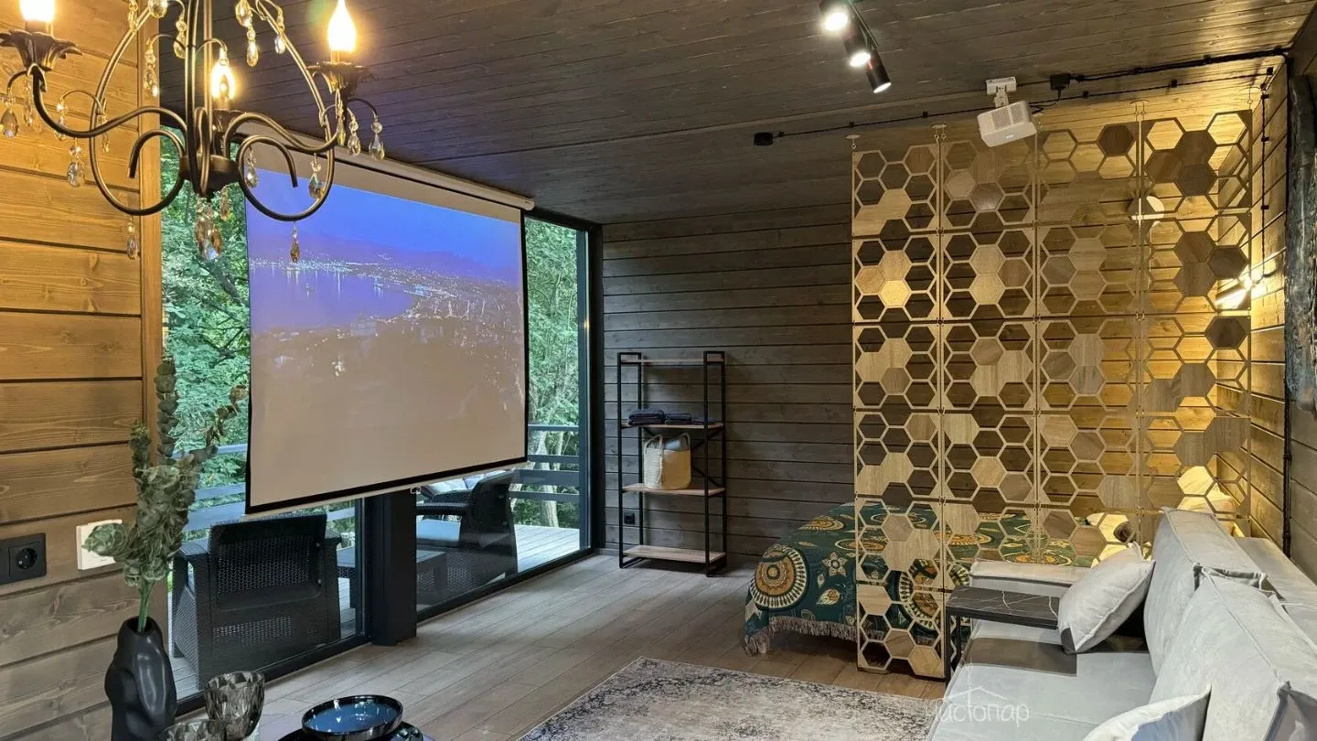 Здесь можно пожарить шашлыки, попариться в бане, искупаться в горячем чане, посмотреть кино на проекторе, покататься на катке и заказать готовый завтрак и продукты из местных ресторанов.