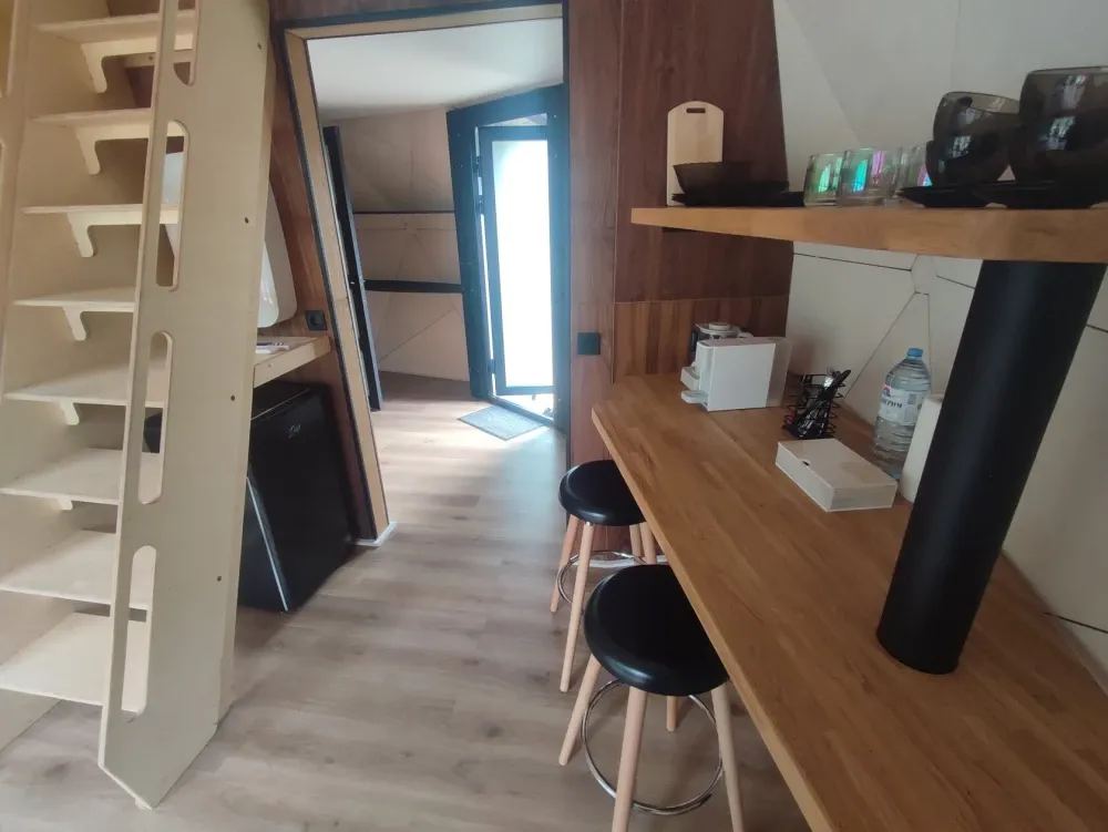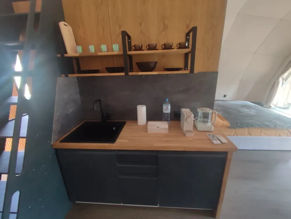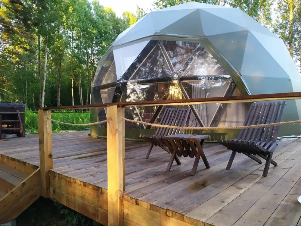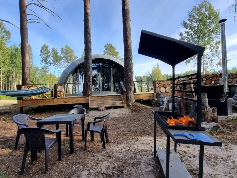 Гостей ждут комфортабельные домики – сферы с купелью фурако на террасе и со всеми удобствами. Здесь можно насладиться прекрасным видом на озеро прямо из номера. Внутри есть все необходимое: кондиционер, бризер-ионизатор воздуха, теплый пол, а также небольшая кухня с чайником, капсульной кофе-машиной и необходимой посудой. Всего пара шагов отделяют от собственной террасы, где можно расслабиться на удобной уличной мебели и приготовить вкусный ужин на мангале.