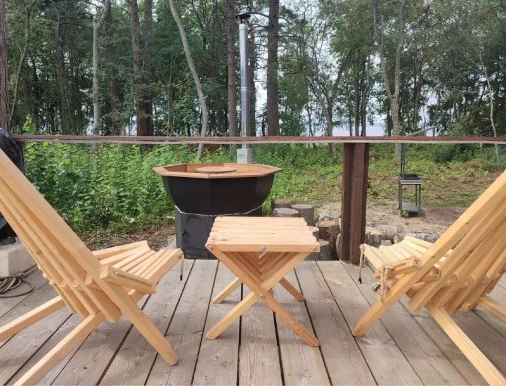 В номере есть кондиционер, бризер-ионизатор воздуха, тёплый пол, а также небольшая кухня с чайником, капсульной кофе-машиной и необходимой посудой, чтобы ощутить полноценный комфорт от проживания. В то же время, сделав пару шагов на собственную террасу вы насладитесь комфортной уличной мебелью для релакса и мангалом с отдельным обеденным столом. Горячий чан-купель создаст неповторимую атмосферу вечером.