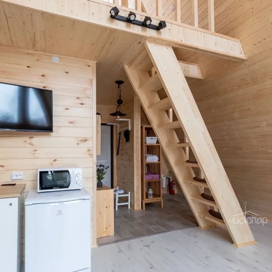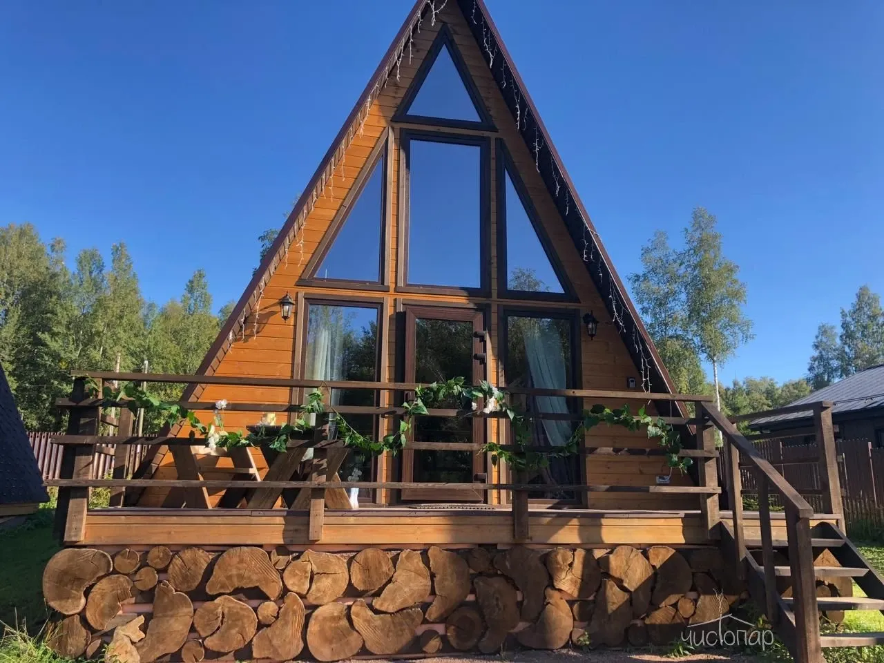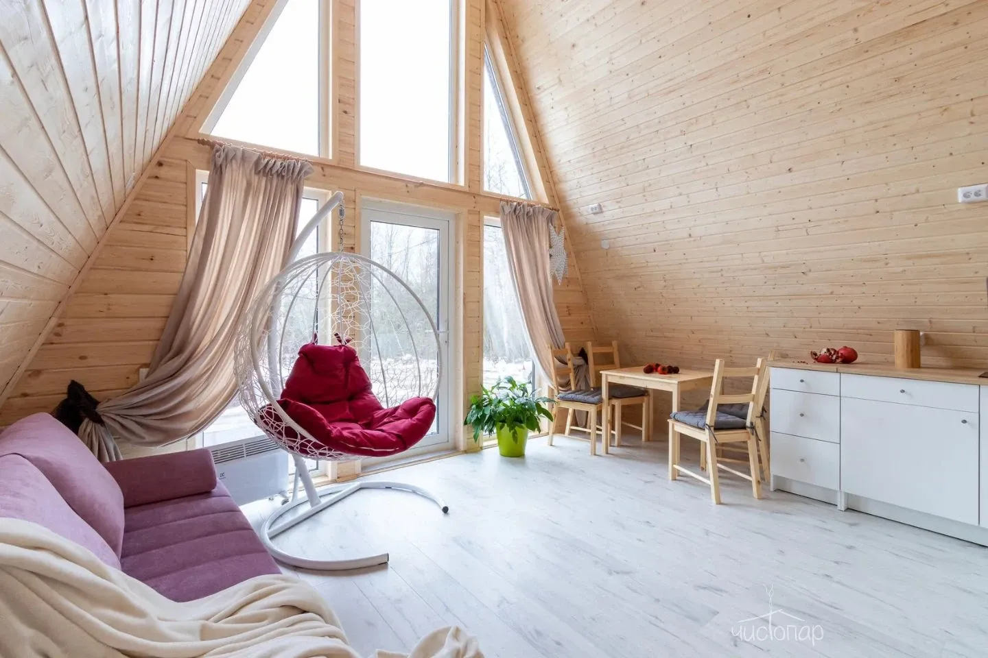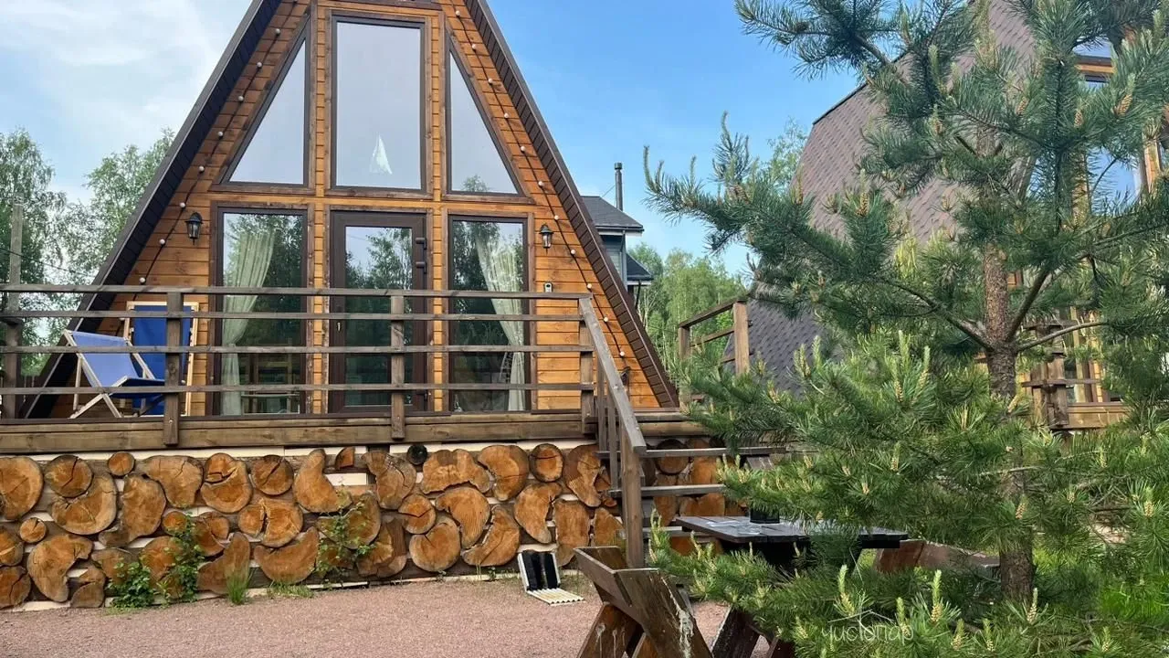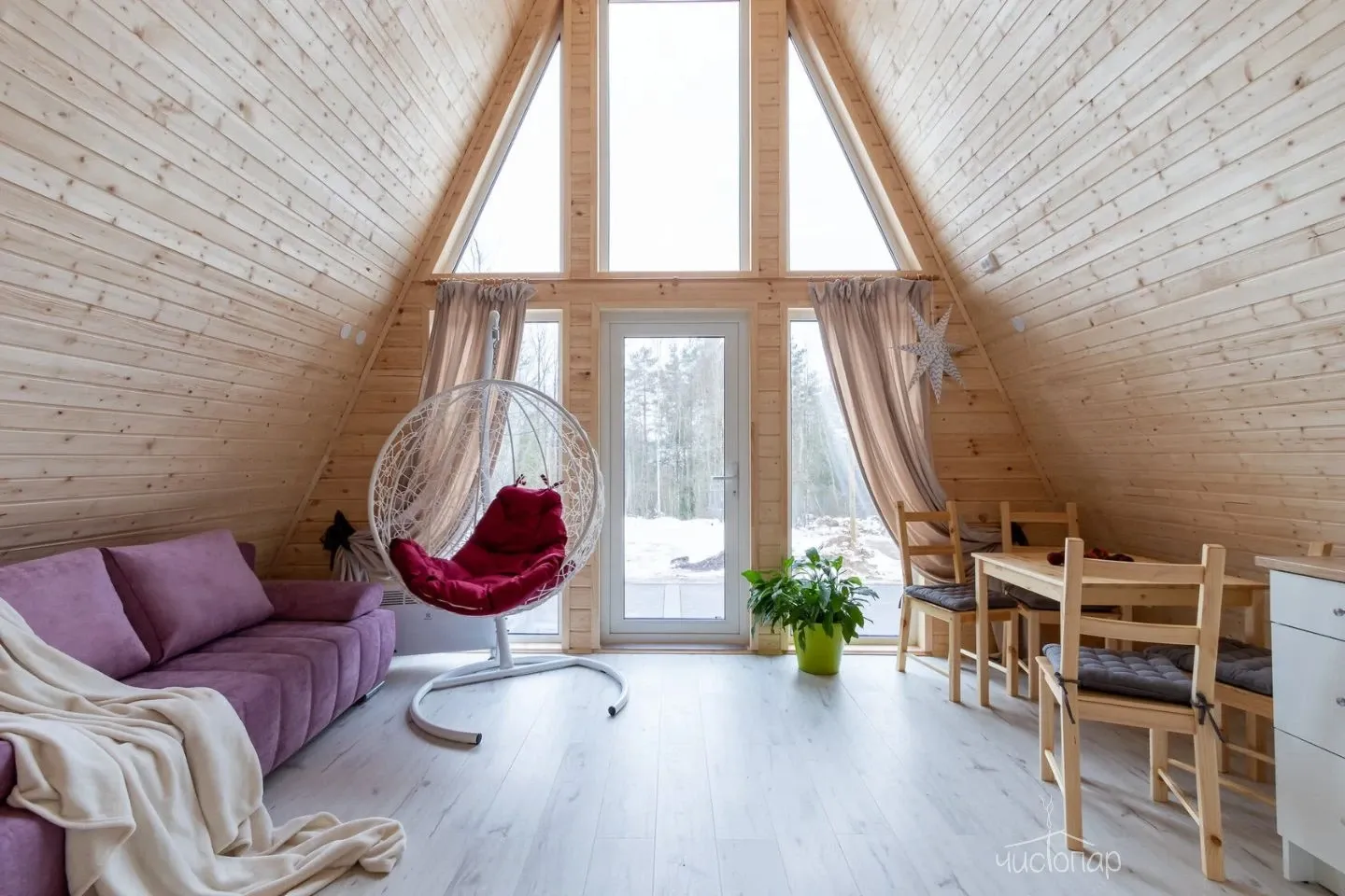 Треугольный дизайнерский домик— шале с балконом (вместимость до 10 человек), общая площадь 72 кв.м. Дом для отдыха полностью выполнен из дерева и оборудован для комфортного отдыха. В доме теплые водяные полы с датчиком регулировки температуры, настенный кварцевый обогреватель, вентилятор, установлен бойлер, современный экологический септик.