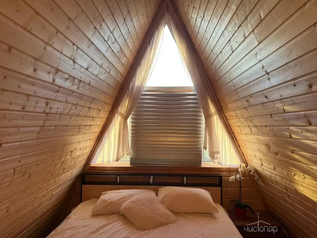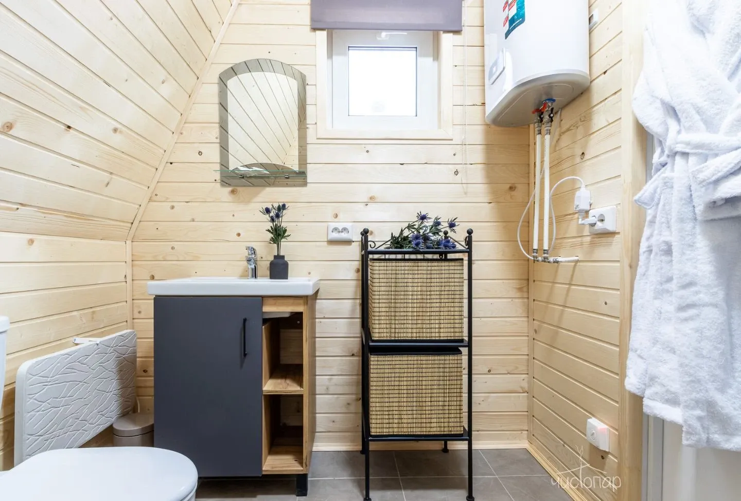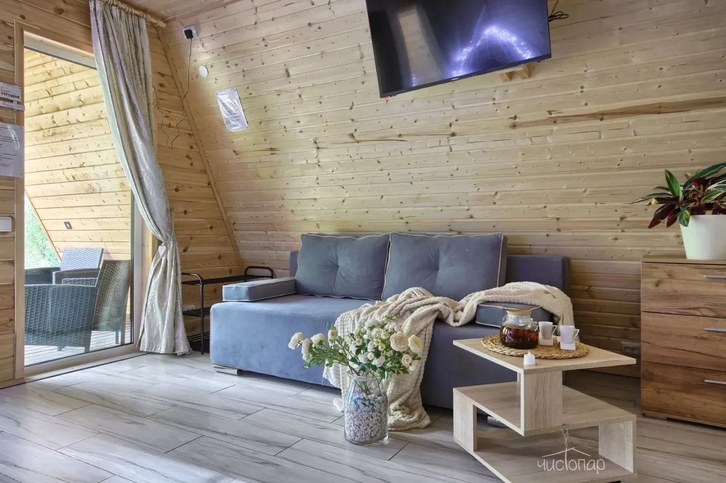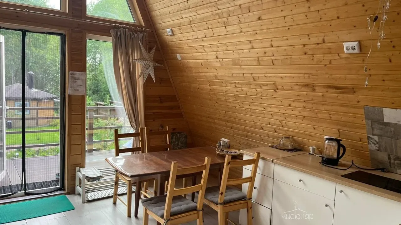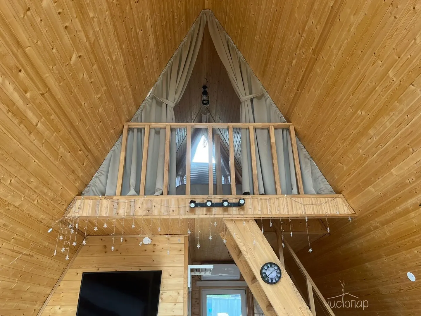 Треугольный дизайнерский домик— шале с балконом (вместимость до 10 человек), общая площадь 72 кв.м. Дом для отдыха полностью выполнен из дерева и оборудован для комфортного отдыха. В доме теплые водяные полы с датчиком регулировки температуры, настенный кварцевый обогреватель, вентилятор, установлен бойлер, современный экологический септик.