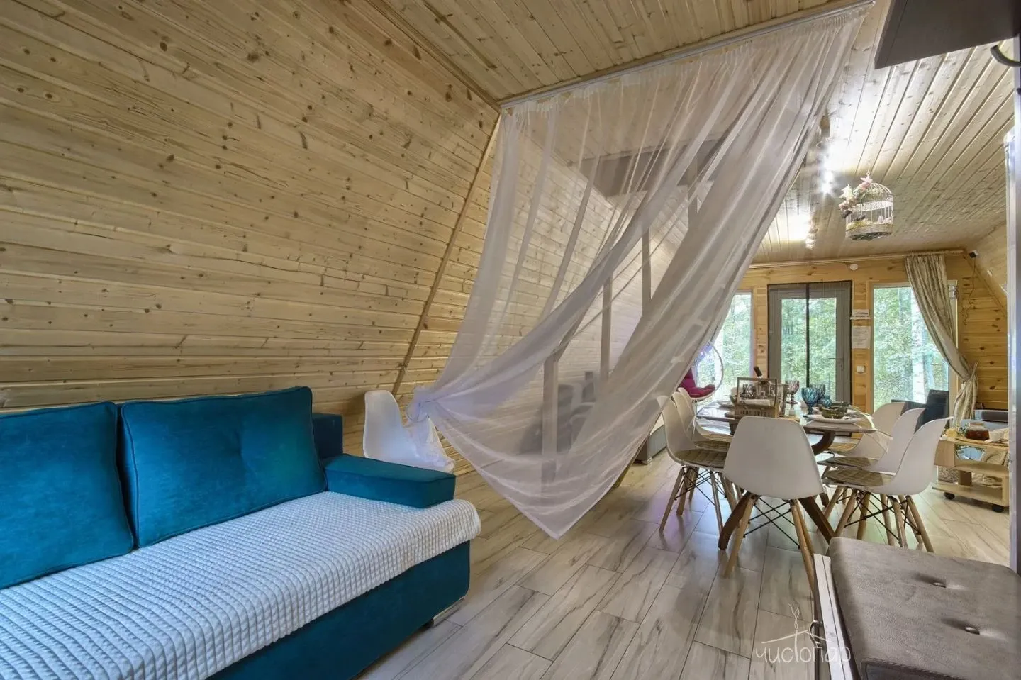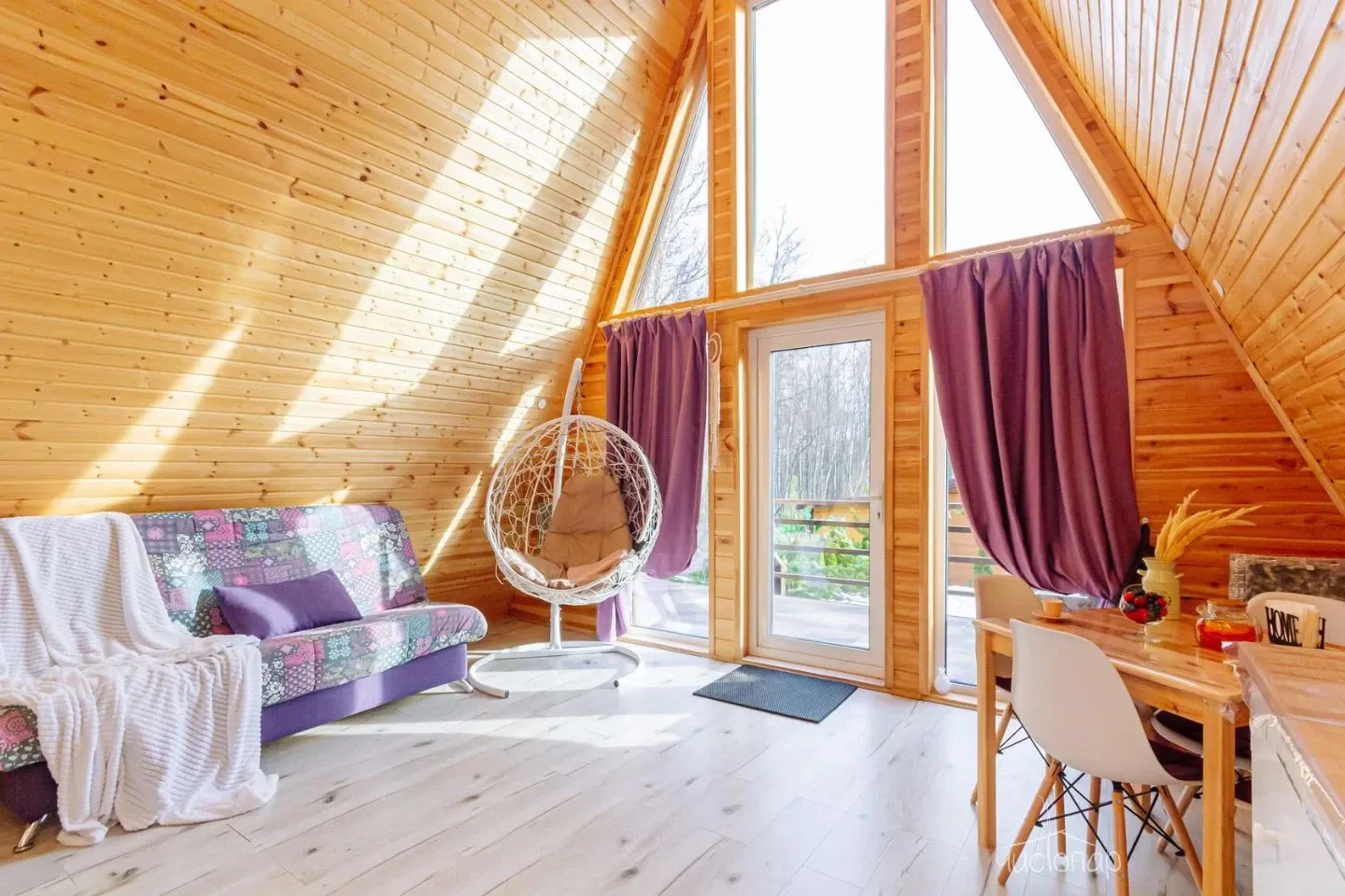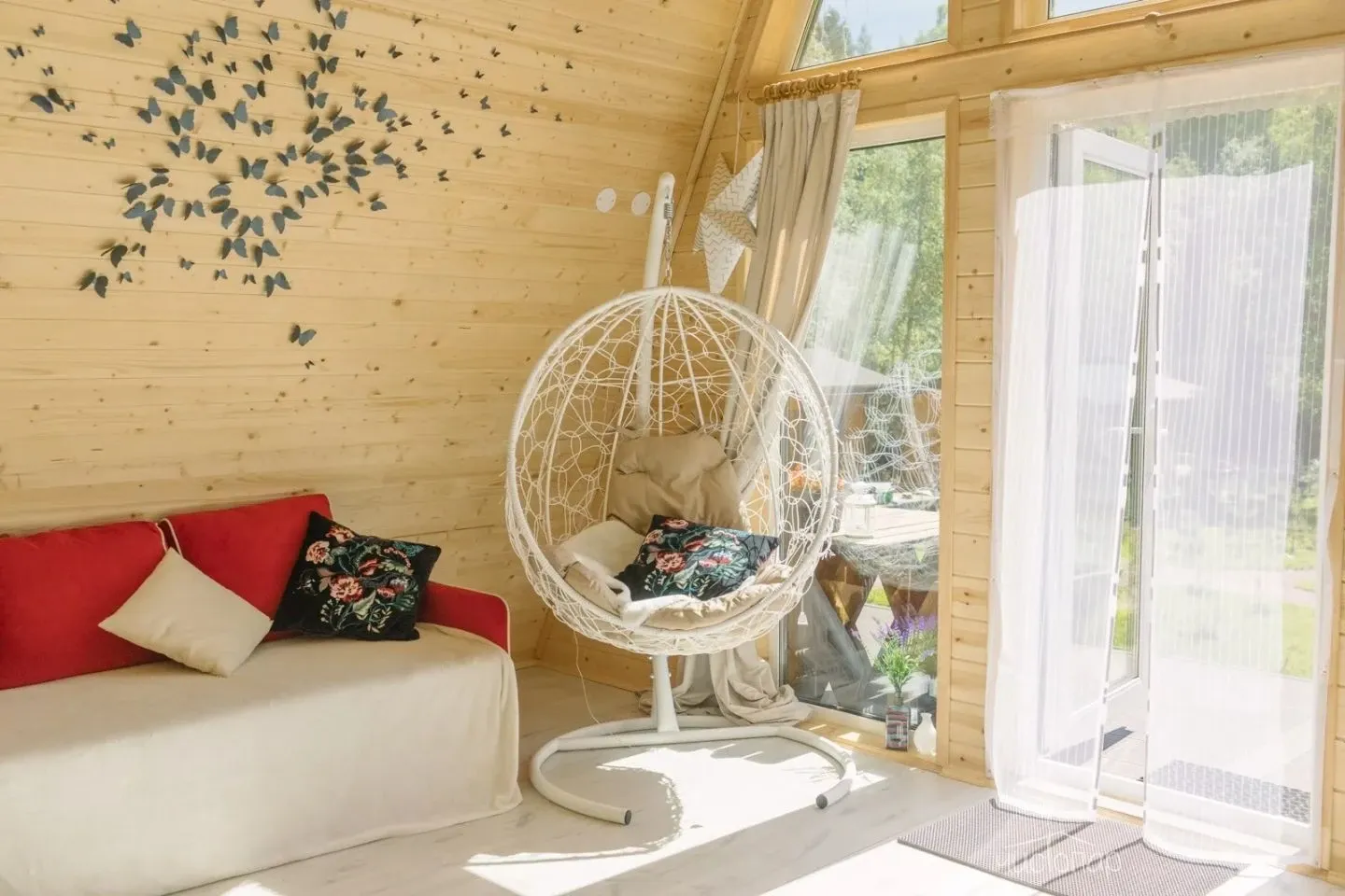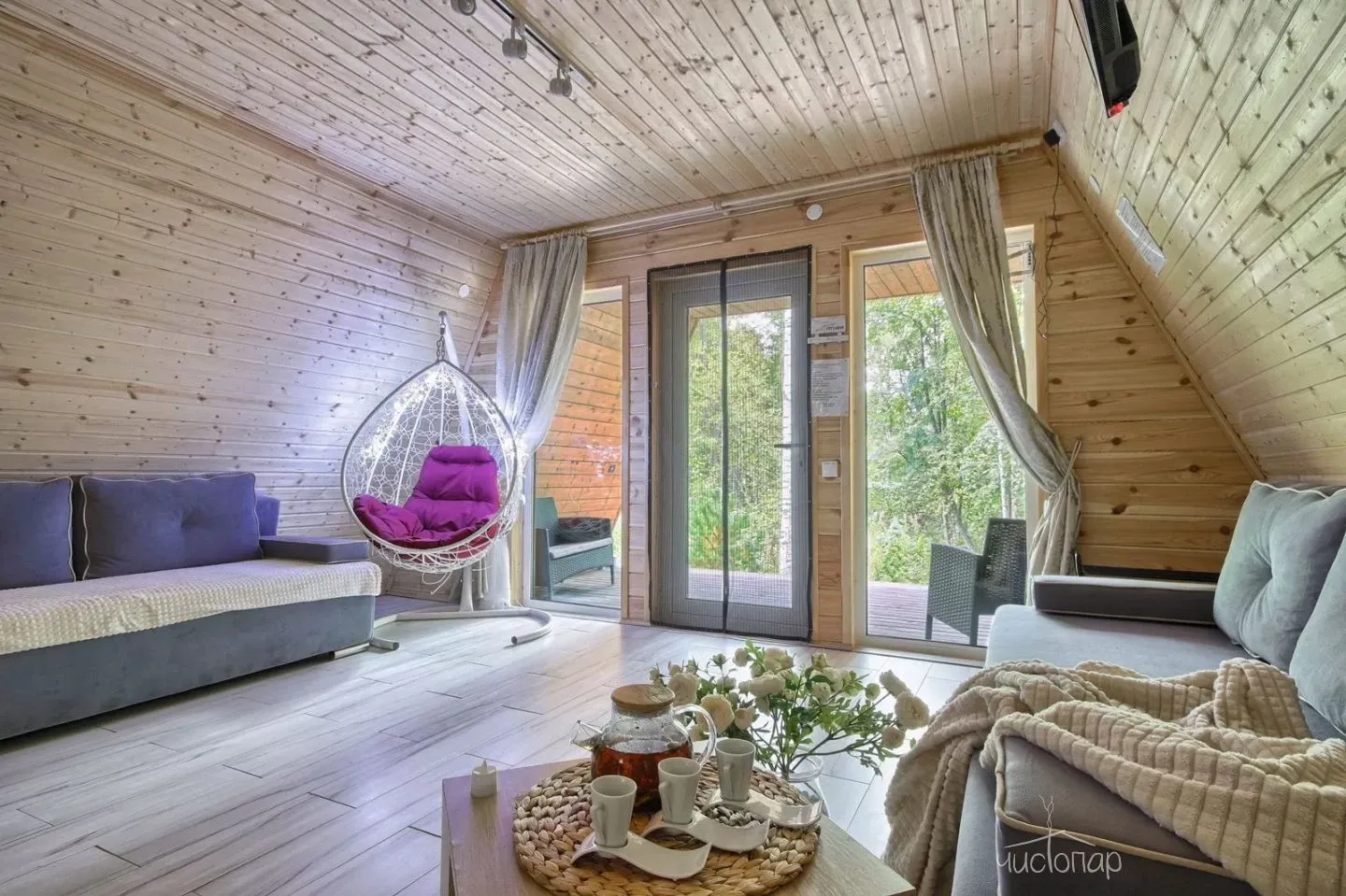 - Гостиная с панорамными окнами в пол с видом на лес (в гостиной: ЖК телевизор, подвесное кресло/кокон с подсветкой, три дивана/кровати с независимыми пружинными блоками и ортопедическим основанием,