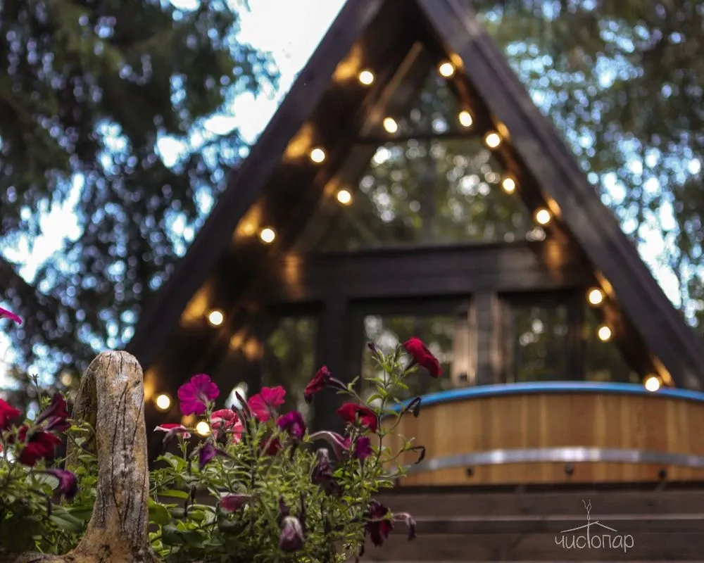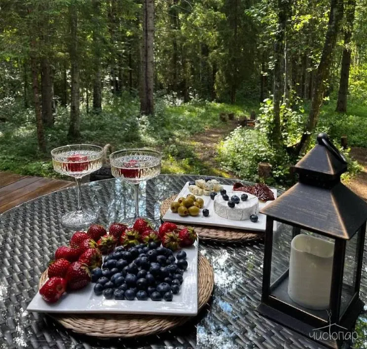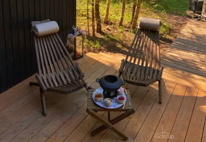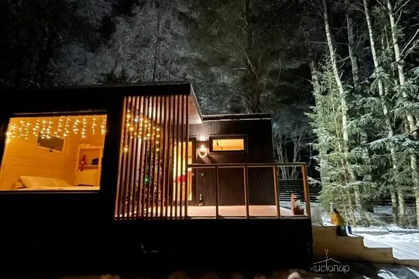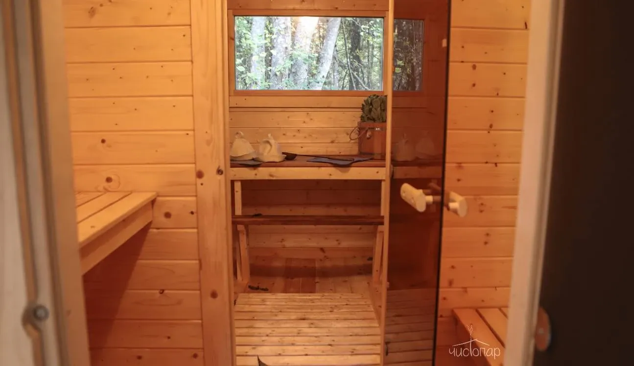 В еловом лесу Ленобласти для гостей предоставляются домики с финскими названиями MÖKKI и MÄNTY. Рядом с каждым домиком есть горячая купель, на территории расположены мангальная зона, баня на дровах с тремя секциями: парной, помывочной и комнатой отдыха. Баня построена в форме огромной деревянной бочки, в парной открывается вид на высокие ели.