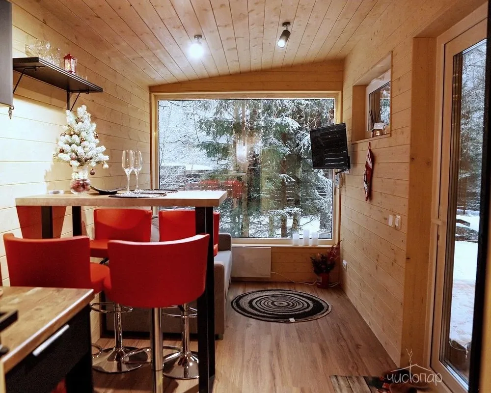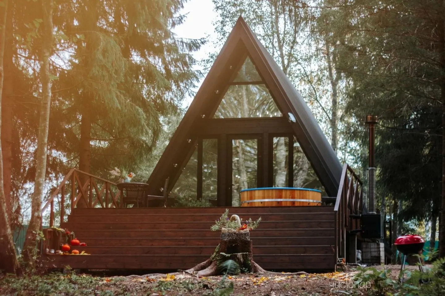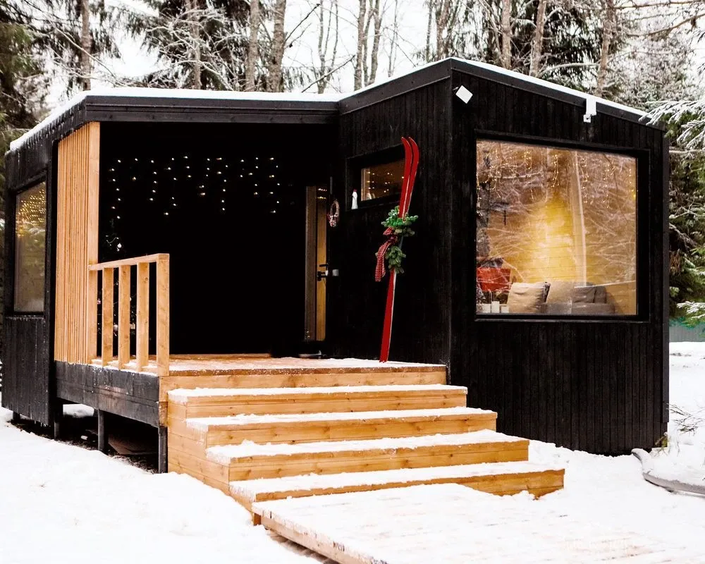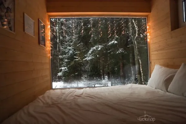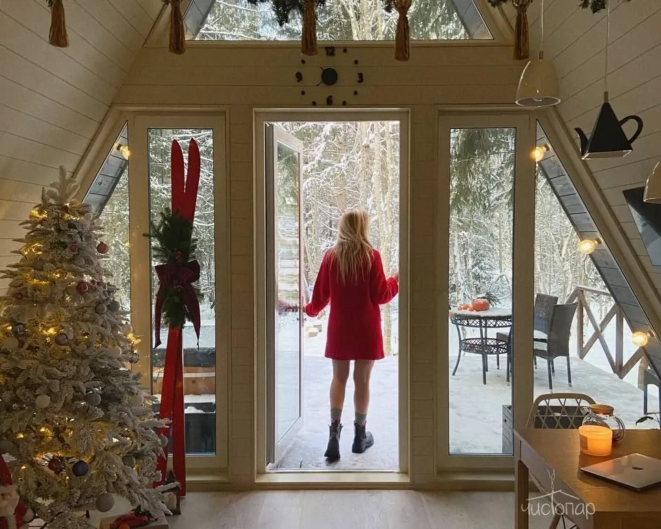 Домики рассчитаны до 6 человек, в них есть все для комфортного отдыха вдвоем или с детьми: кухня, гостиная с диваном, душевые, спальни с панорамными окнами, книги и настольные игры.