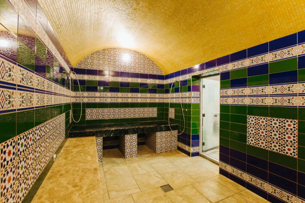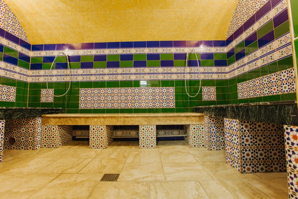 В хамаме умеренный жар и влажность воздуха близкая к 100% способствуют глубочайшему расслаблению организма, активизируют работу всех систем и благоприятно влияют на кожу и волосы.