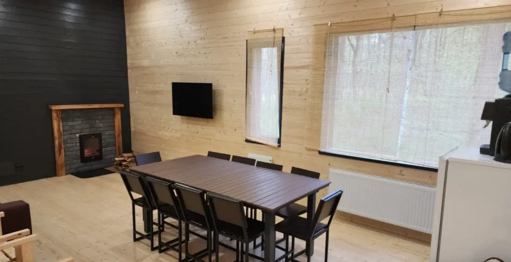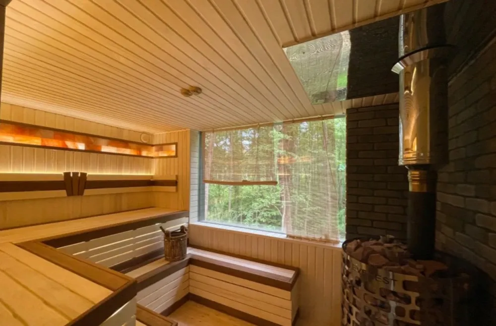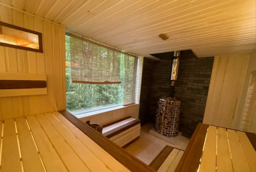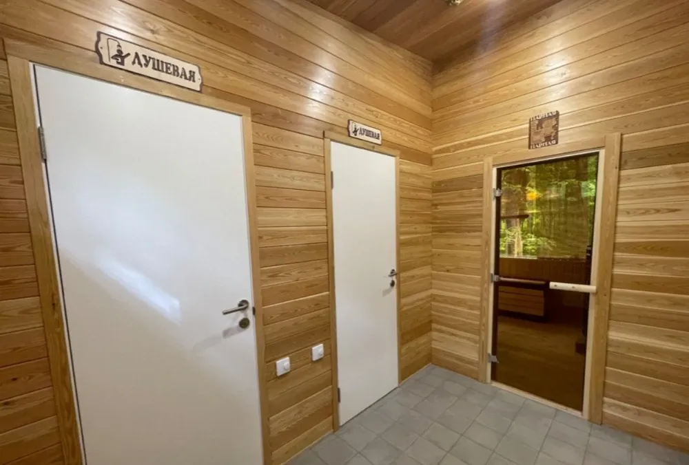 Дровяная Большая баняДровяная баня площадью 80,6м2 в лесной части территории. В бане просторная комната отдыха с мягкой мебелью и столом, раздевалка, санузел, 2 душевых, одна из которых с обливочным ведром, парная с панорамным остеклением, дровяной топкой и светильниками с гималайской солью. В бане большая просторная веранда с мебелью. На улице установлен мангал.