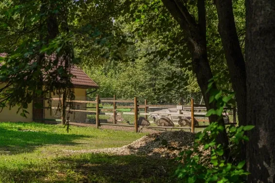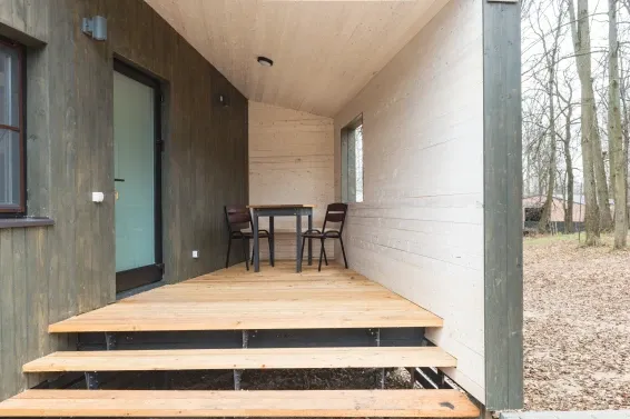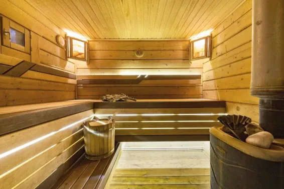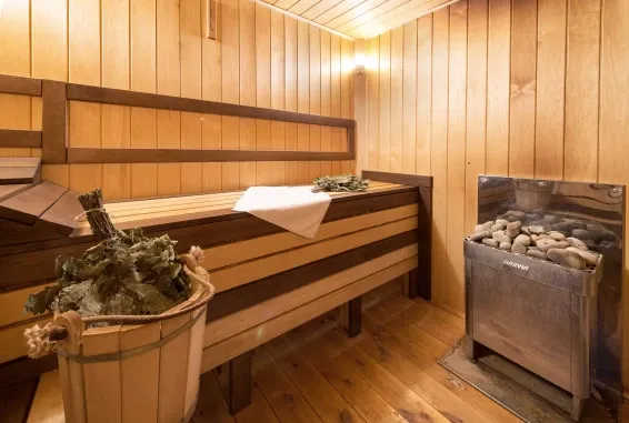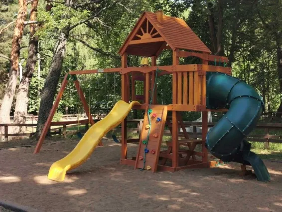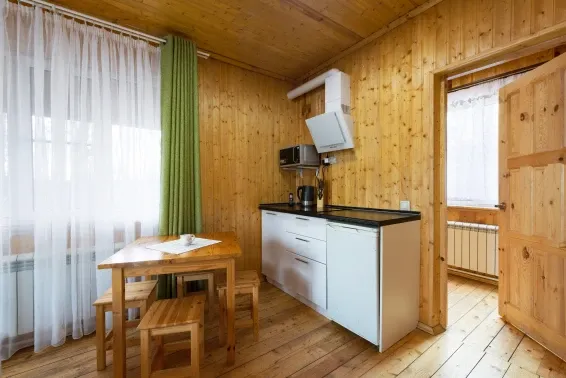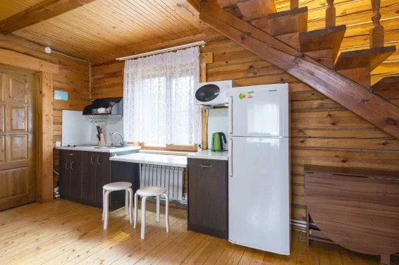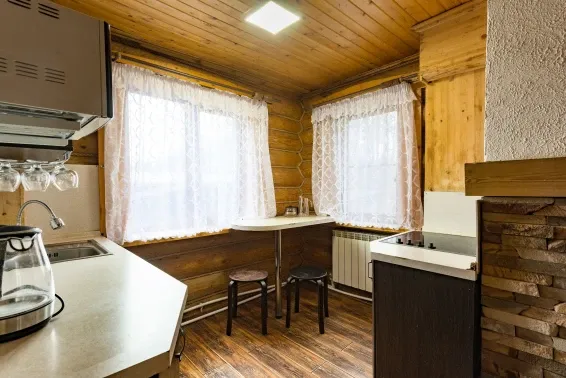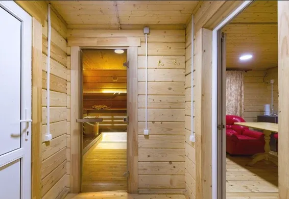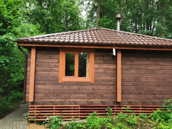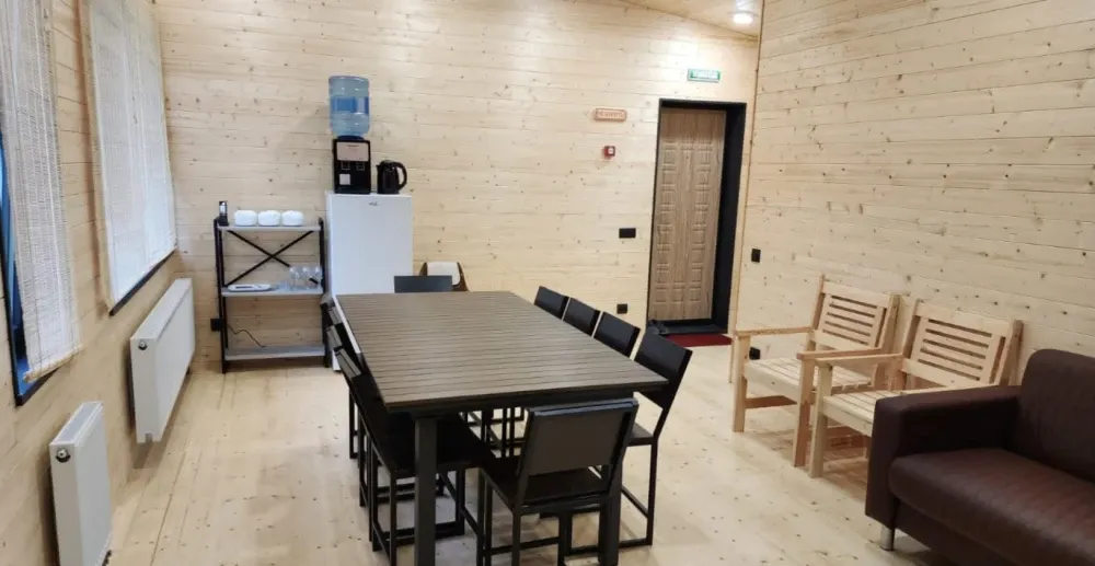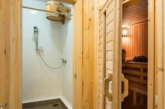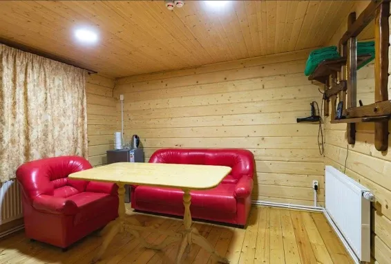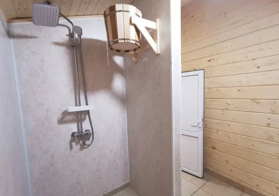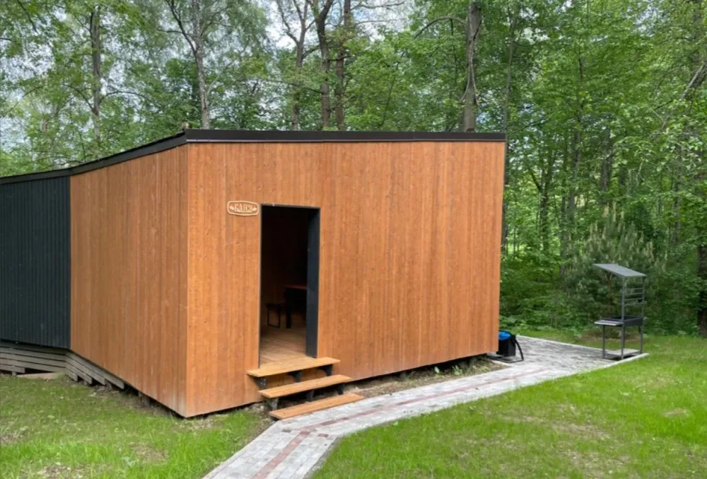 Дровяная Малая баняДровяная баня площадью 36м2 в лесной части территории. В бане комната отдыха с мягкой мебелью и столом, санузел, душевая с обливочным ведром, парная с дровяной топкой и светильниками с гималайской солью. Также в бане есть уличная веранда под навесом с мебелью и мангал. Вместимость бани до 6 человек.