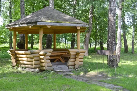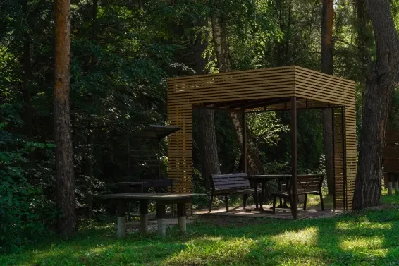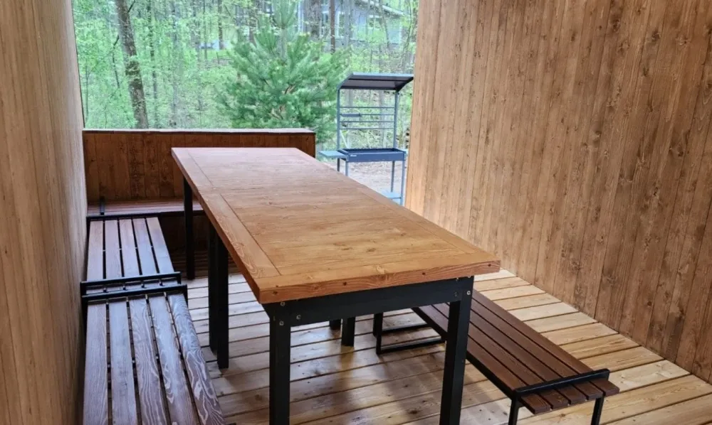 Около коттеджа освещаемая беседка со столом и лавочками, мангал.