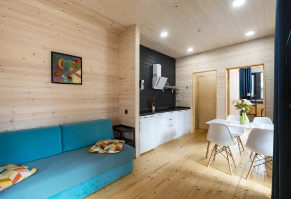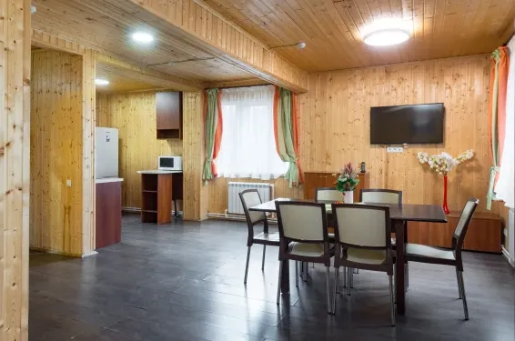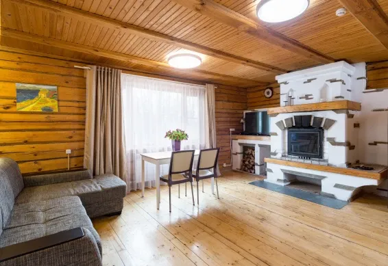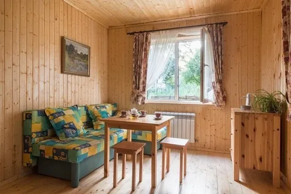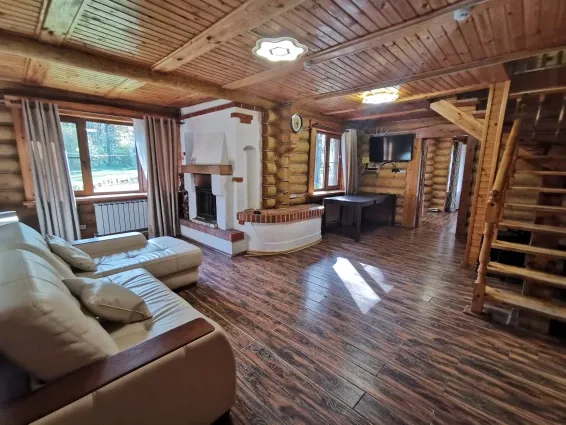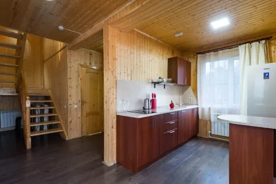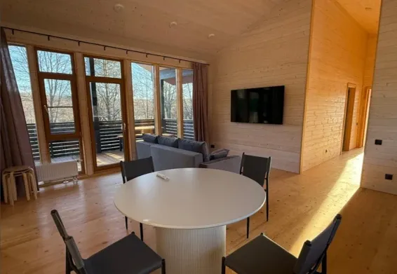 Коттедж имеет большую гостиную и кухню, три санузла, на втором этаже расположены две изолированные спальни. В гостиной 43" телевизор.