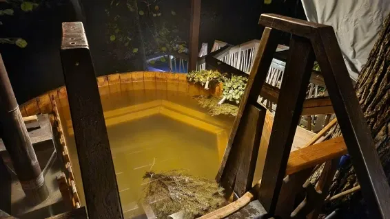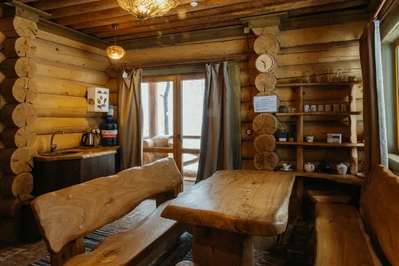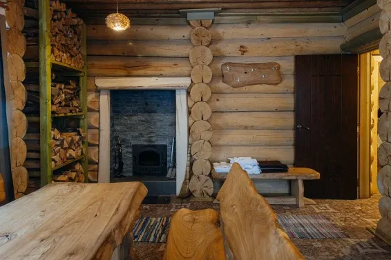 Внутри бани есть зона отдыха, парная, санузел и горячая купель снаружи.