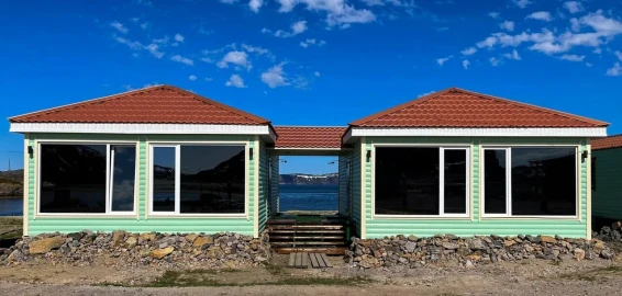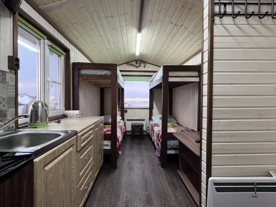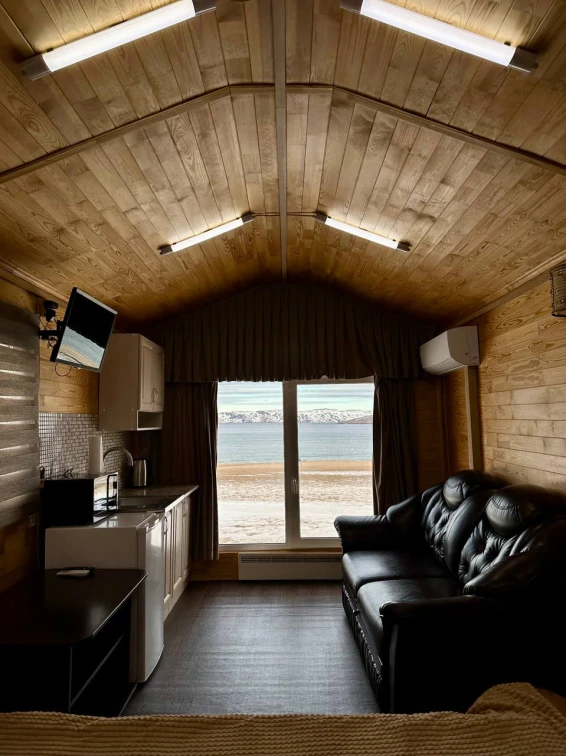 Для размещения гостям предлагаются домики на берегу моря. Из окон домов открывается шикарный вид на арктический песочный пляж. Домики оснащены всем необходимым: бытовой техникой, душевыми кабинами, отоплением, горячей водой и санузлами.