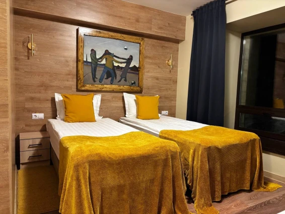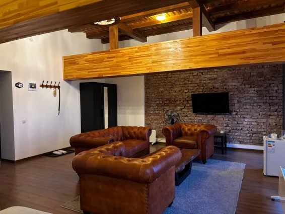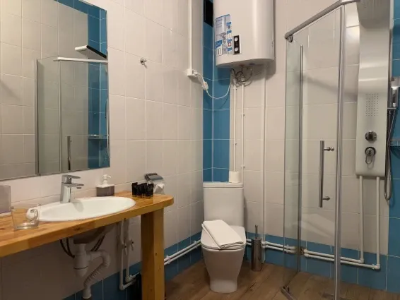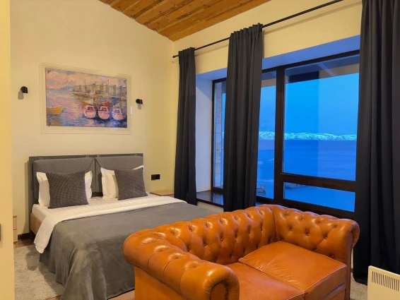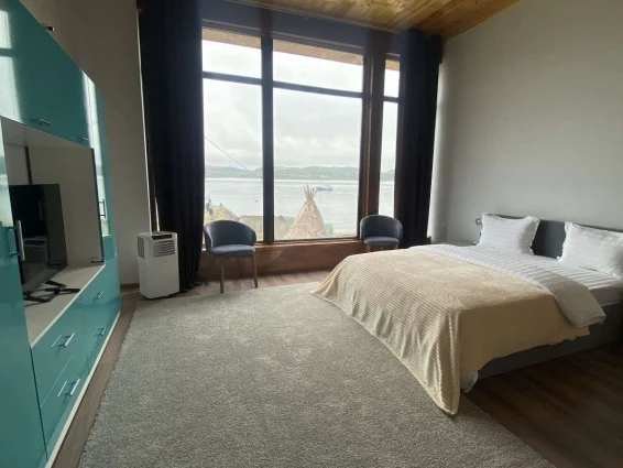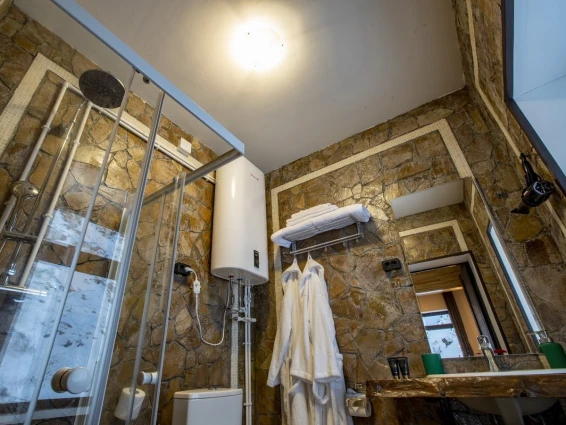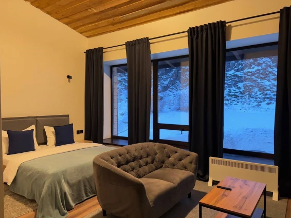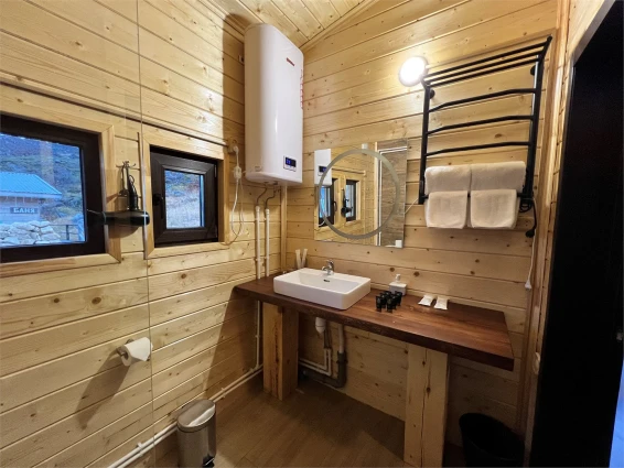 Отдельно стоящий коттедж с двумя спальнями и гостинной зоной. Каждая спальня оснащена своим туалетом с душем. Большая общая комната позволит комфортно разместиться и отдохнуть всем вместе. На заезд гостям предлагается бутилированная вода, чайный набор. В номерах имеются тёплые тапочки и халаты.