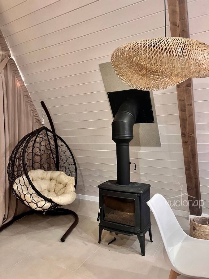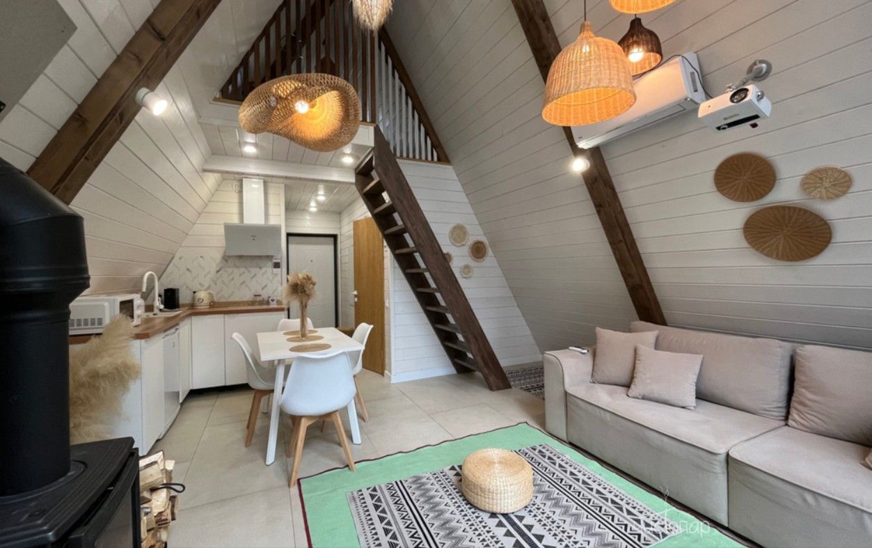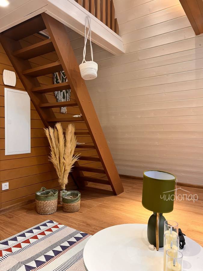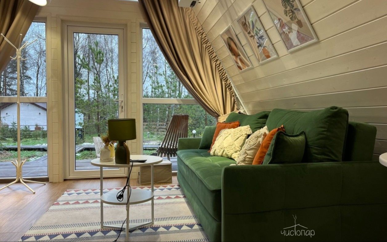 Дом Гармония на 5х гостейДом Гармония - это двухэтажный домик в стиле А-Фрейм площадью 60 кв.м. на берегу озера. Дом построен в светлых тонах в стиле бохо, имеет второй свет и панорамное остекление. На первом этаже находится гостиная с кухней, санузел с душевой и спальная комната, на втором этаже располагается комфортная двуспальная кровать. Спальня на первом этаже открывается в случае бронирования на 5-х гостей. Для уютных зимних вечеров в домике установлена дровяная печка, на первом этаже во всем доме установлены теплые полы. Для просмотра фильма на первом этаже есть проектор с записанными фильмами. В санузле есть фен, зубной набор и набор для душа: мыло, гель, шампунь, ватные диски, палочки. На каждого гостя предоставляется халат и два полотенца. В доме установлен бойлер для горячей воды, просьба это учитывать при приеме душа. Постельное белье входит в стоимость. Гармония рассчитана на 5 гостей, для этого на втором этаже есть двуспальная кровать, на первом этаже в гостиной двуспальный диван со спальным местом 160*200. В спальне на первом этаже есть диван, рассчитанный на одного взрослого. Кухня оборудована индукционной варочной панелью, холодильником, микроволновой печью, вытяжкой и набором посуды на 5-х гостей.