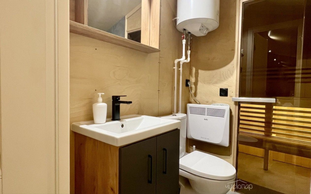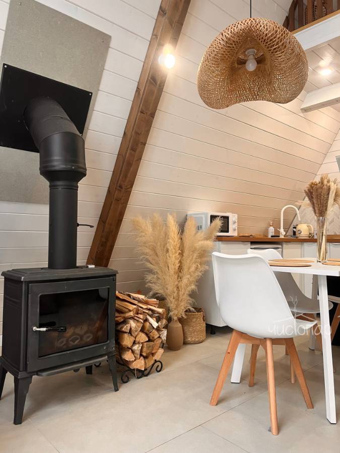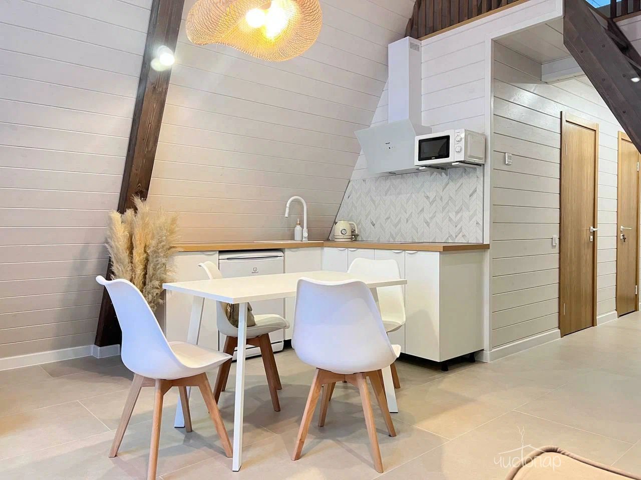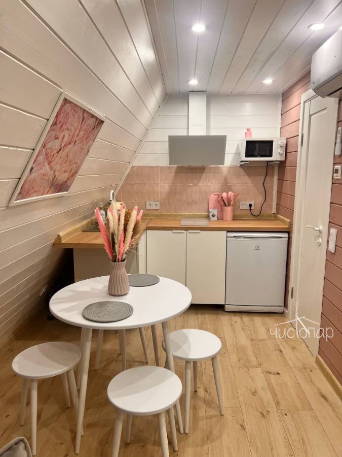 Дом Гармония на 5х гостейДом Гармония - это двухэтажный домик в стиле А-Фрейм площадью 60 кв.м. на берегу озера. Дом построен в светлых тонах в стиле бохо, имеет второй свет и панорамное остекление. На первом этаже находится гостиная с кухней, санузел с душевой и спальная комната, на втором этаже располагается комфортная двуспальная кровать. Спальня на первом этаже открывается в случае бронирования на 5-х гостей. Для уютных зимних вечеров в домике установлена дровяная печка, на первом этаже во всем доме установлены теплые полы. Для просмотра фильма на первом этаже есть проектор с записанными фильмами. В санузле есть фен, зубной набор и набор для душа: мыло, гель, шампунь, ватные диски, палочки. На каждого гостя предоставляется халат и два полотенца. В доме установлен бойлер для горячей воды, просьба это учитывать при приеме душа. Постельное белье входит в стоимость. Гармония рассчитана на 5 гостей, для этого на втором этаже есть двуспальная кровать, на первом этаже в гостиной двуспальный диван со спальным местом 160*200. В спальне на первом этаже есть диван, рассчитанный на одного взрослого. Кухня оборудована индукционной варочной панелью, холодильником, микроволновой печью, вытяжкой и набором посуды на 5-х гостей.