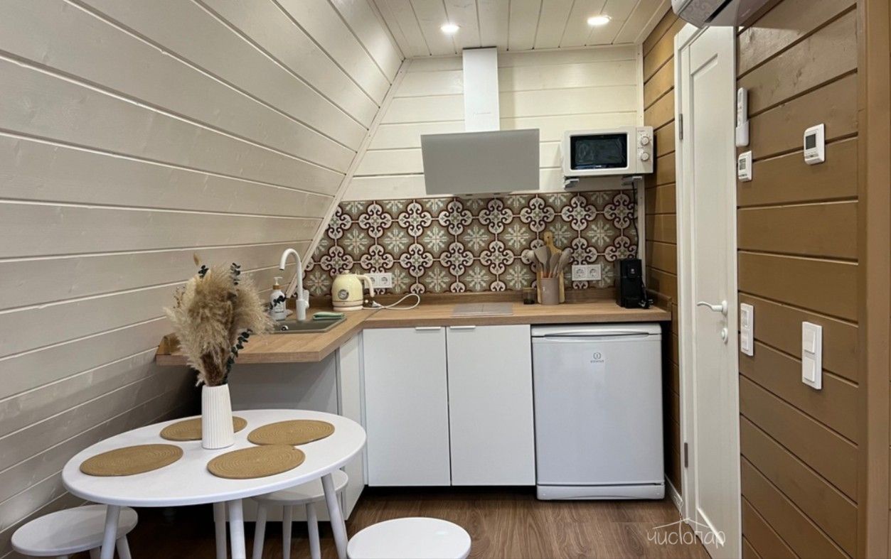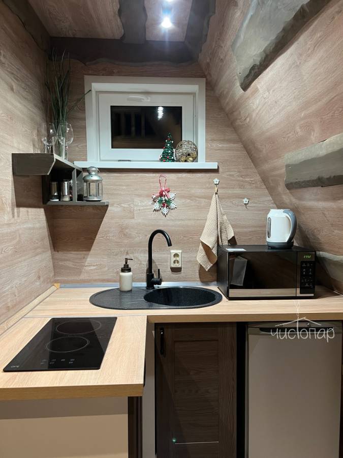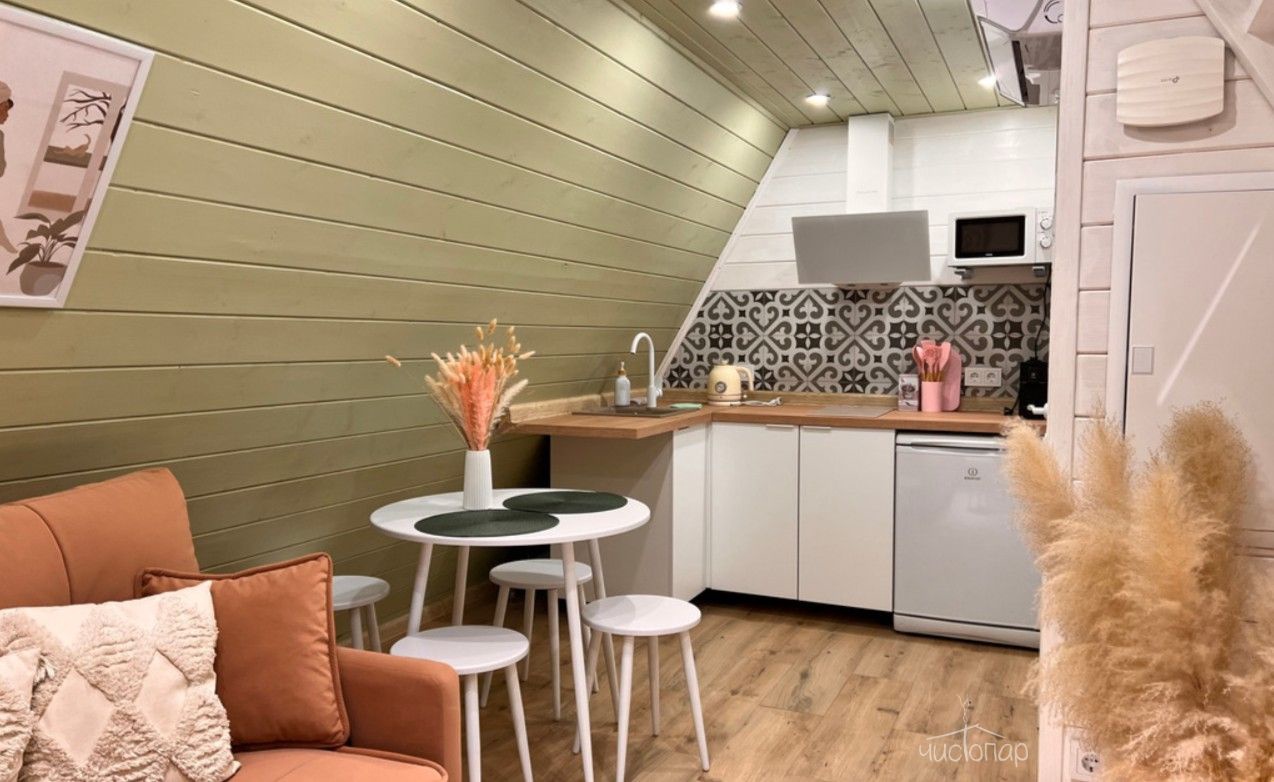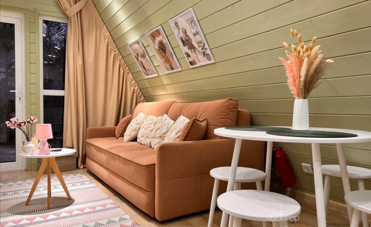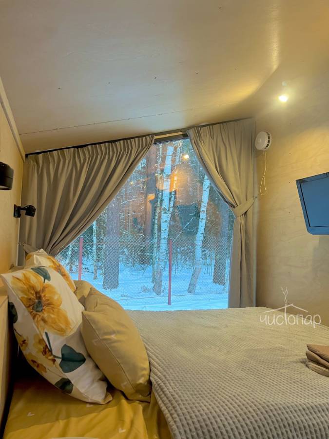 Дом Фауна с горячим чаномДом Фауна - это двухэтажный домик в стиле А-Фрейм площадью 46 кв.м. на берегу озера. Дом имеет второй свет и панорамное остекление. На первом этаже находится гостиная с кухней, санузел с душевой, на втором этаже располагается комфортная двуспальная кровать. Для уютных зимних вечеров в домике установлены теплые полы. Для просмотра фильма на первом этаже есть проектор с записанными фильмами. В санузле есть фен, зубной набор и набор для душа: мыло, гель, шампунь, ватные диски, палочки. На каждого гостя предоставляется халат и два полотенца. В доме установлен бойлер для горячей воды, просьба это учитывать при приеме душа. Постельное белье входит в стоимость. Фауна рассчитан на 4 гостей, для этого на втором этаже есть двуспальная кровать, на первом этаже в гостиной двуспальный диван со спальным местом 160*200. Кухня оборудована индукционной варочной панелью, холодильником, микроволновой печью, вытяжкой и набором посуды на 4-х гостей.