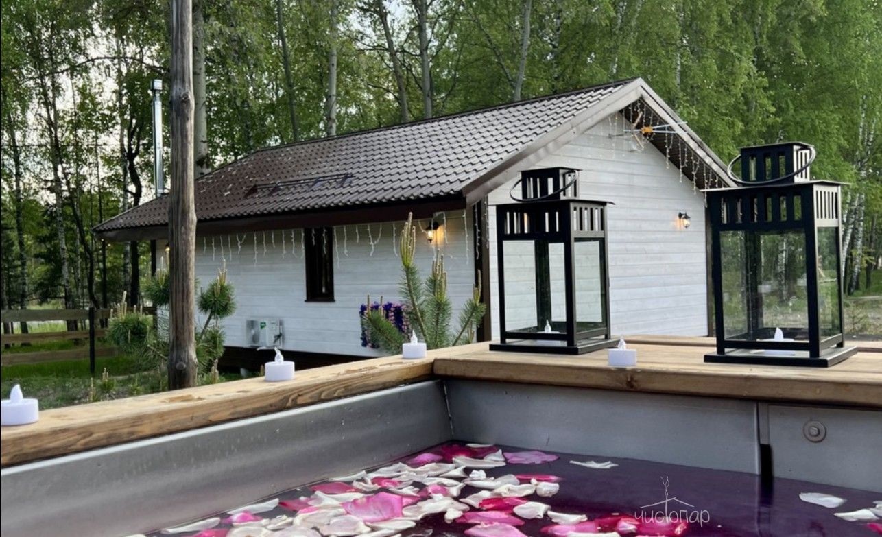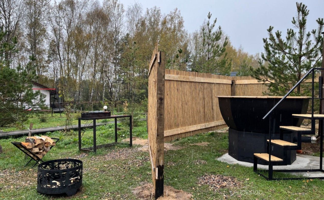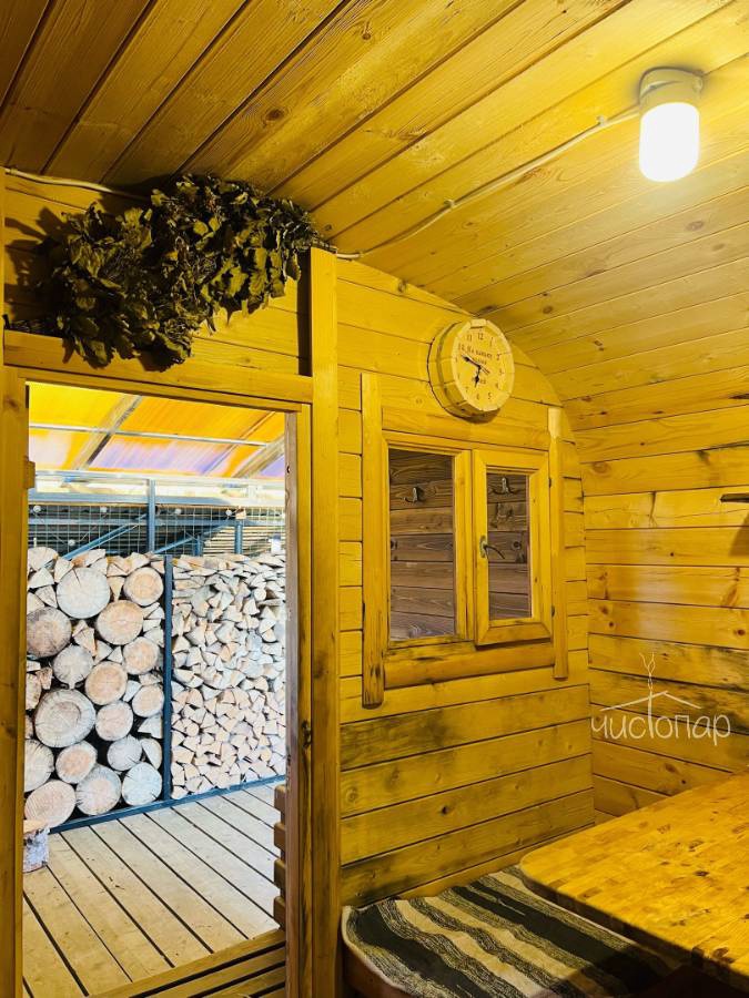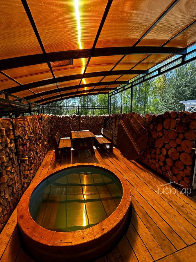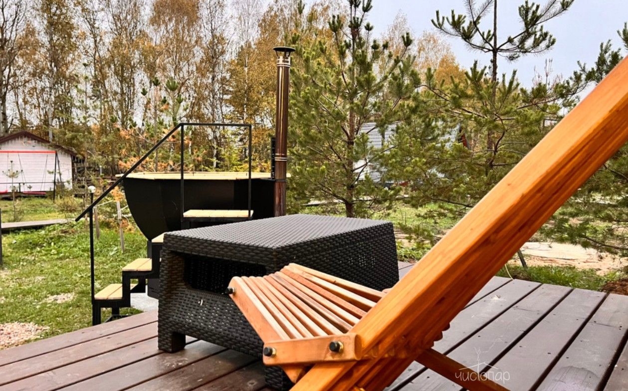 Рядом с домом есть банный чан, который мы греем до 40-42 градусов. В банный чан можно добавить пихтовые веники или заказать романтическое оформление. Чан оплачивается отдельно. Также рядом с домом есть мангал с крышей, решетка для шашлыка и костровая зона.