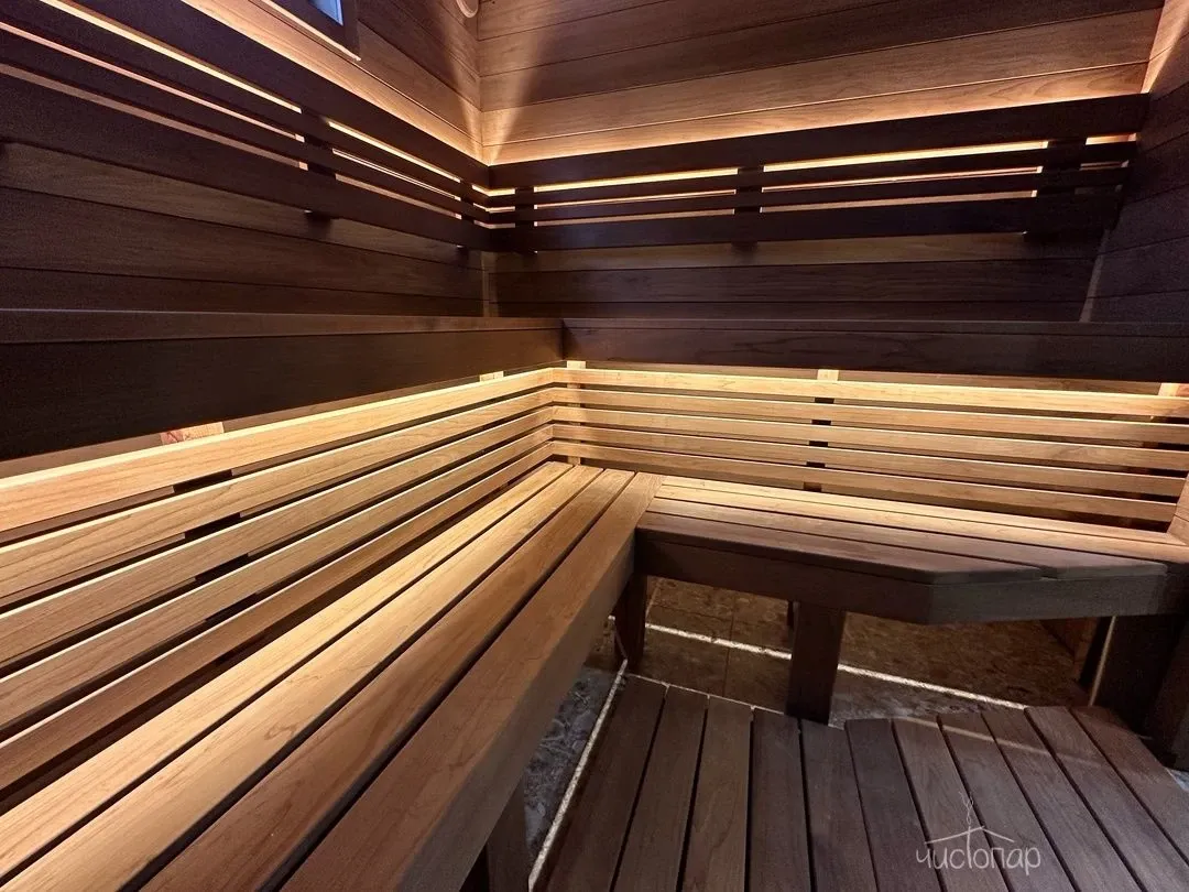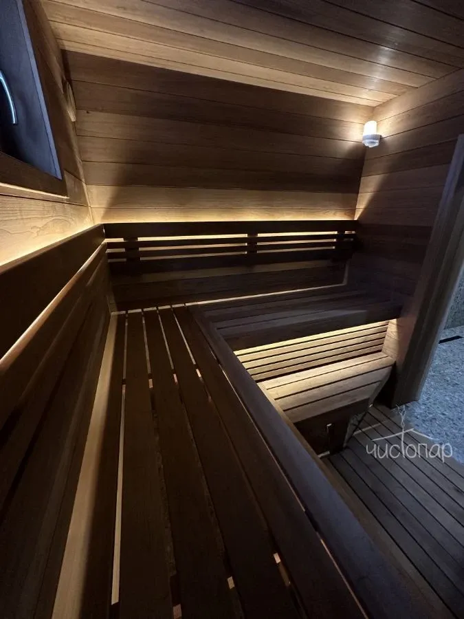На территории построена финская сауна с комнатой отдыха и душевой.