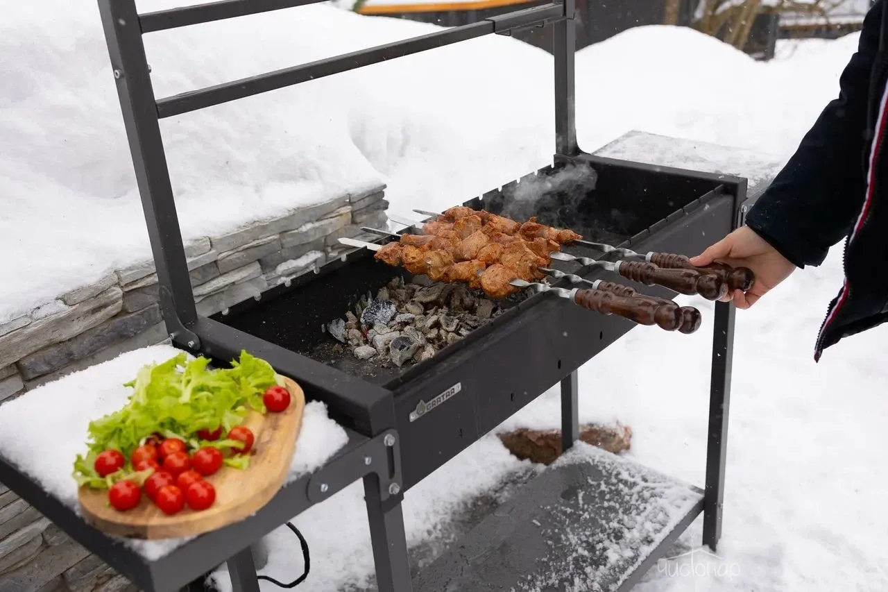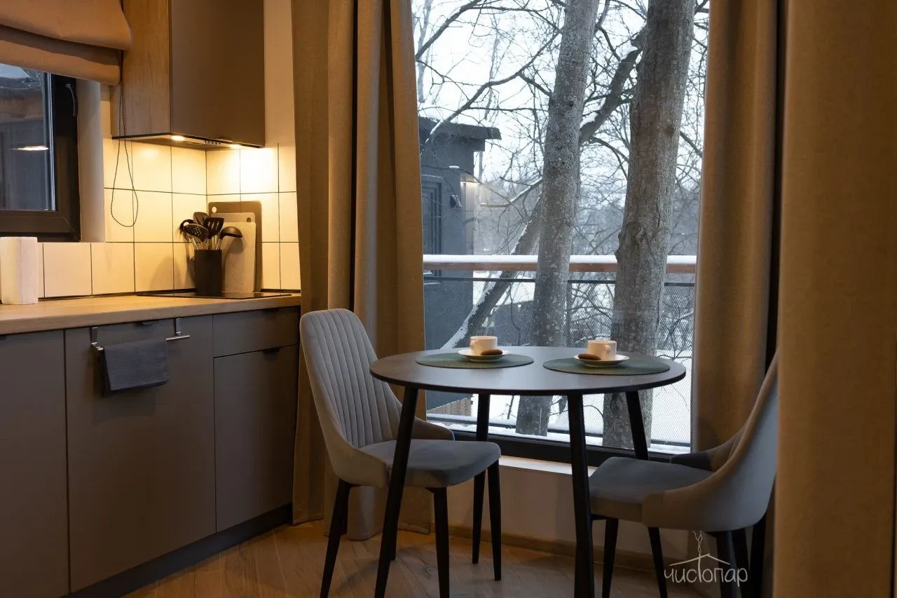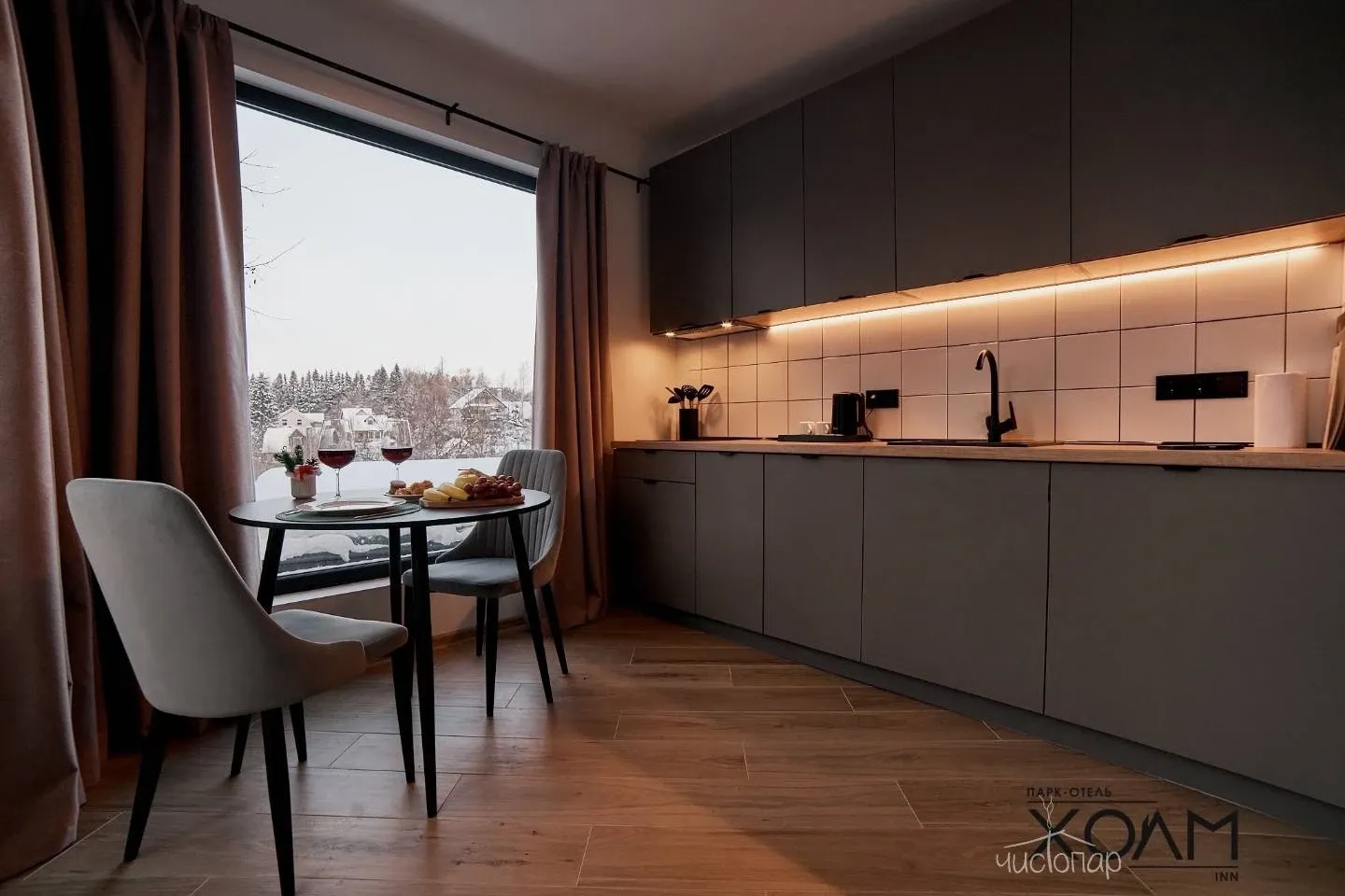 Кухня включает в себя современные электроприборы и набор посуды, что помогает гостям готовить еду самостоятельно. Более того, присутствует мангальная зона, где можно пожарить мясо и овощи. Уголь, розжиг, шампуры и решетки гриль предоставляются бесплатно.