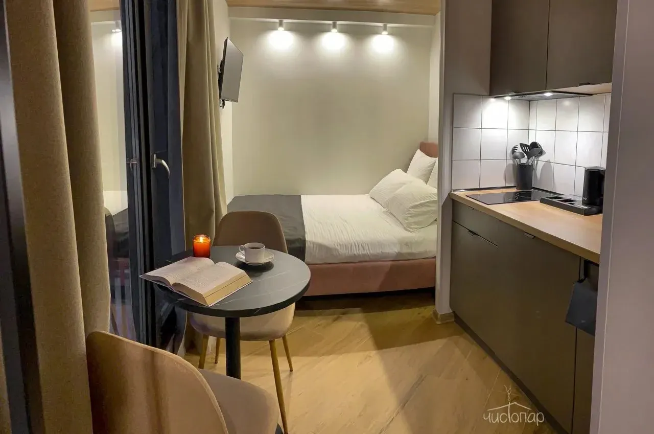Оснащение: Просторная двуспальная кровать с ортопедическим матрасом/ Современная кухня/ Ванная комната с душем и туалетом/ Фен и гигиенические принадлежности/ Полотенца, халаты и тапочки/ Кондиционер/ Электрический чайник/ Электрическая плита/ Микроволновая печь/ ЖК телевизор с основными каналами/ Высокоскоростной Wi-Fi/ Мини-холодильник/ Кухонный инвентарь/ Кухонная посуда (тарелки, стаканы и др.)/ Меблированная террасаЧитать далее