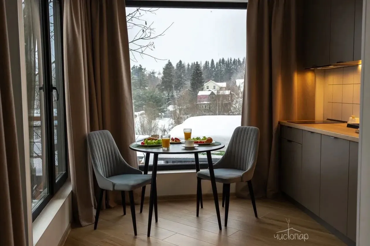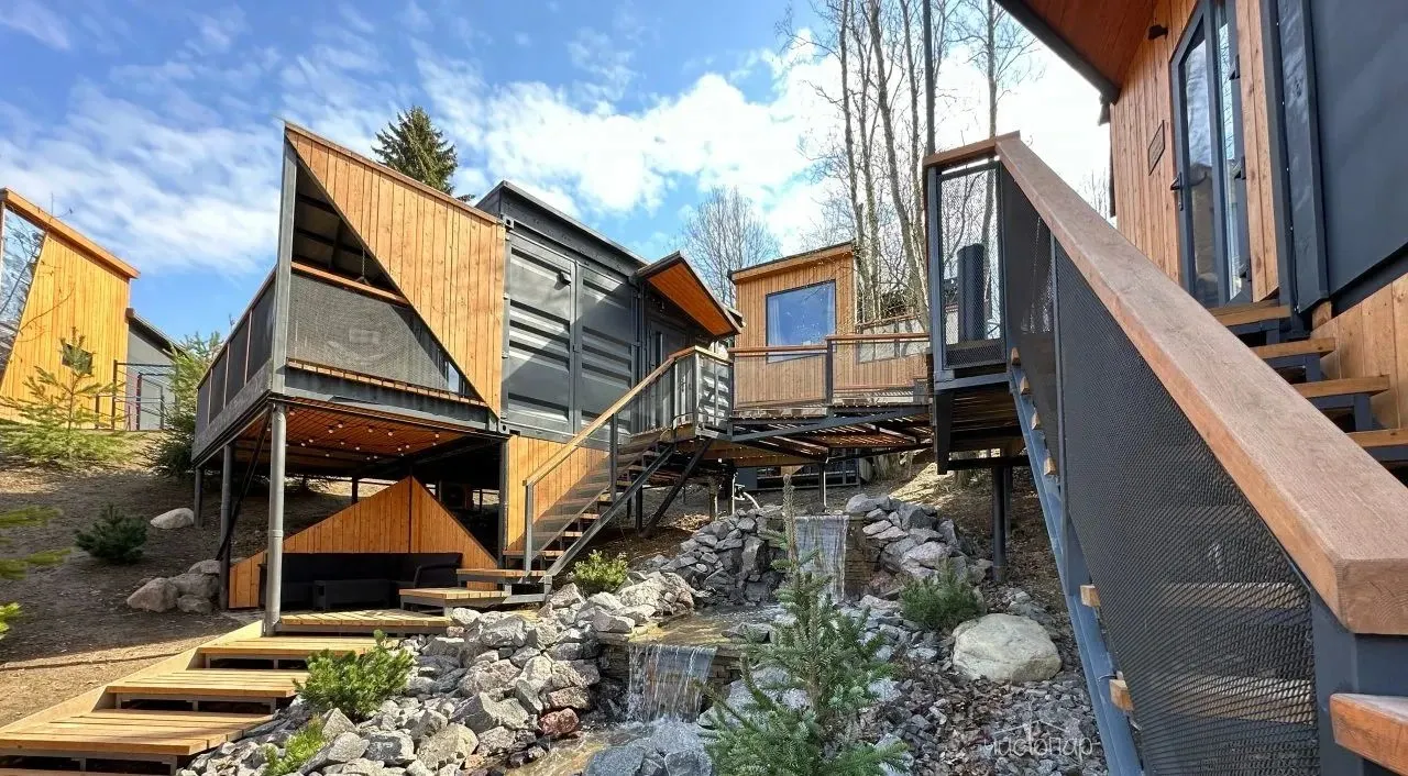 Основной стиль коттеджей - эко-минимализм, компактные, с эргономичным интерьером в спокойных тонах с панорамными окнами, из которых открывается чудесный вид на окрестности.