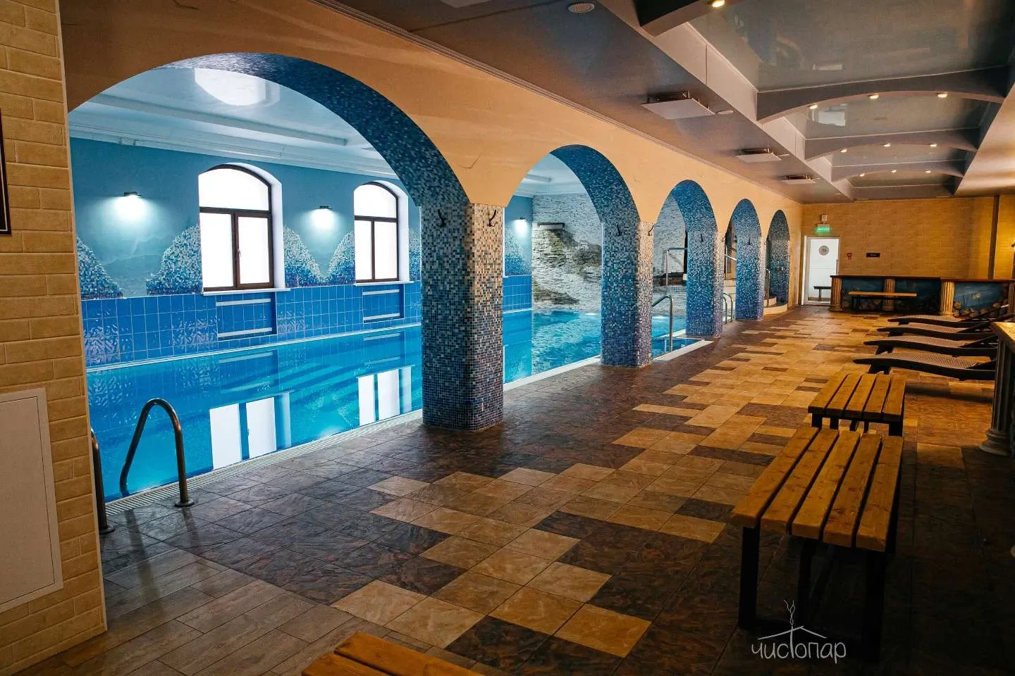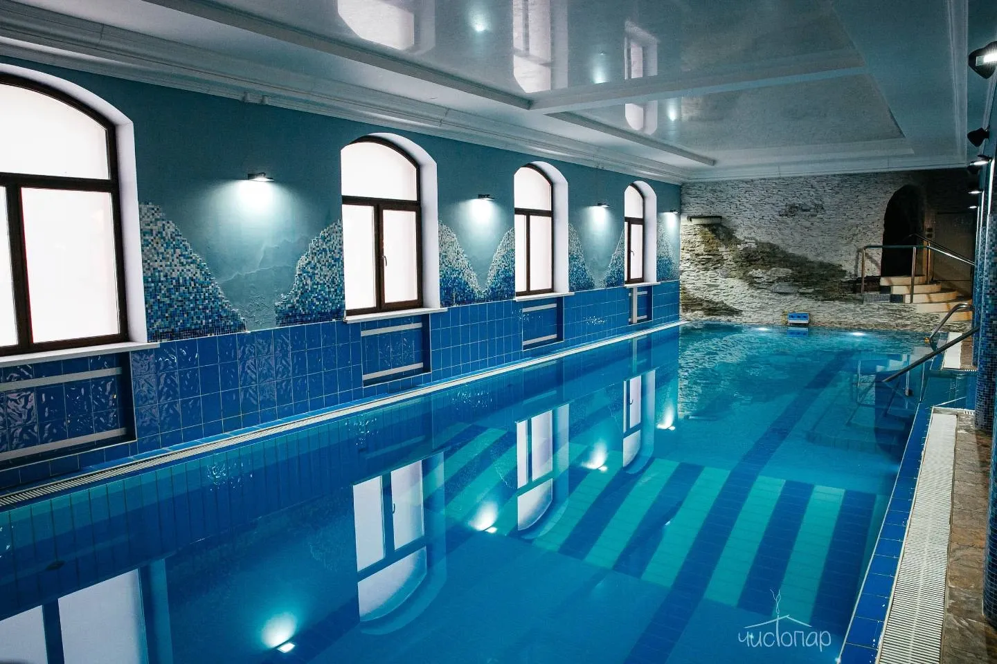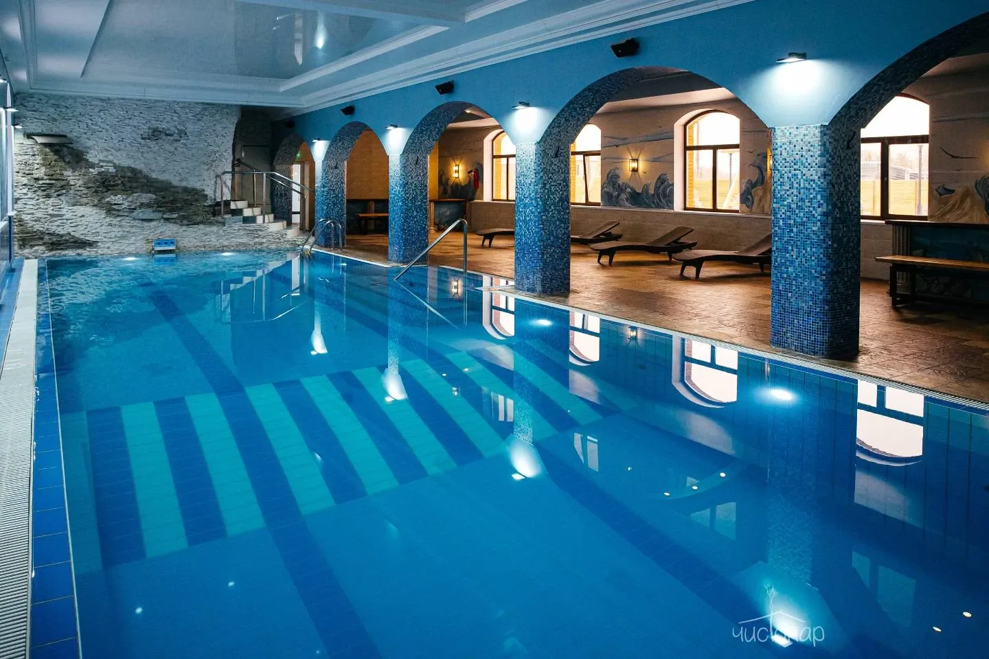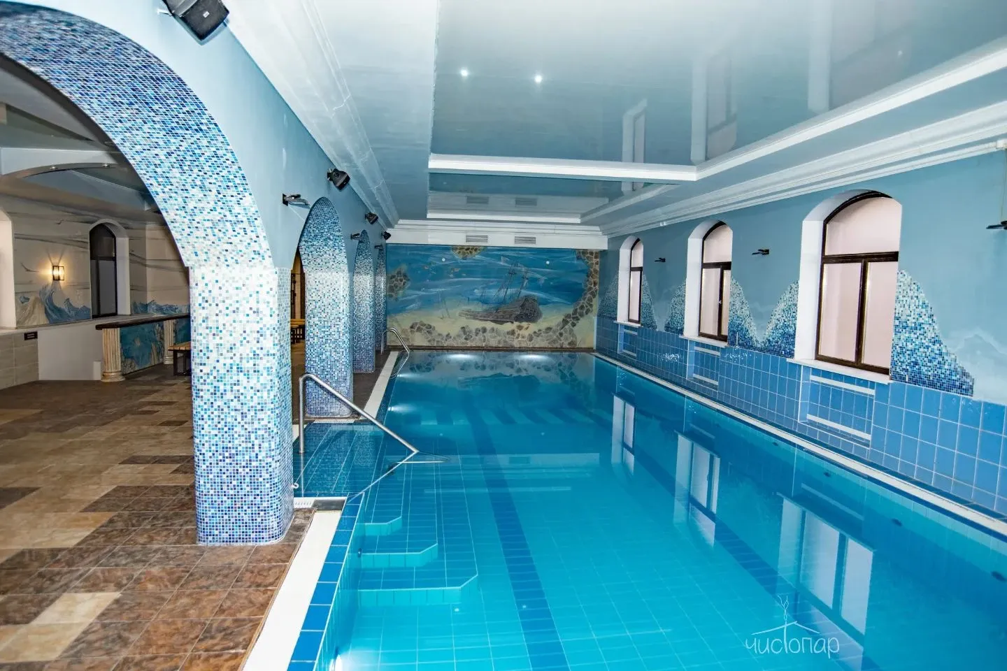 - Плавательный бассейн 90 кв.м., температура воды 25,5 ℃