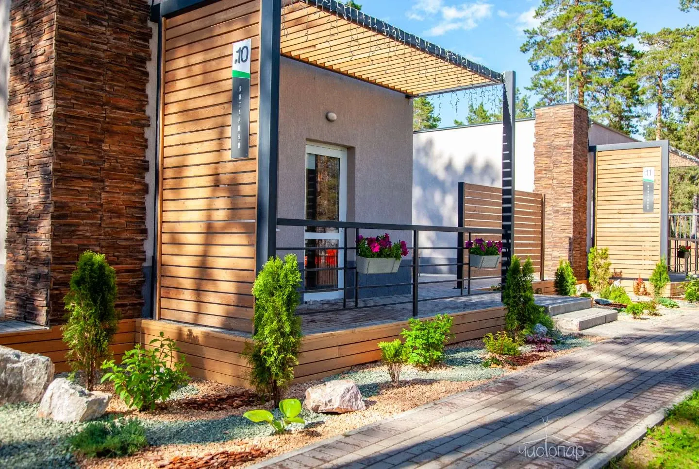 «Причал» 1-этажный двухкомнатный комфортабельный коттедж (№ 15)Комфортабельный одноэтажный двухкомнатный коттедж «Причал» с размещением от 2 до 4 человек и собственной зоной барбекю на улице.