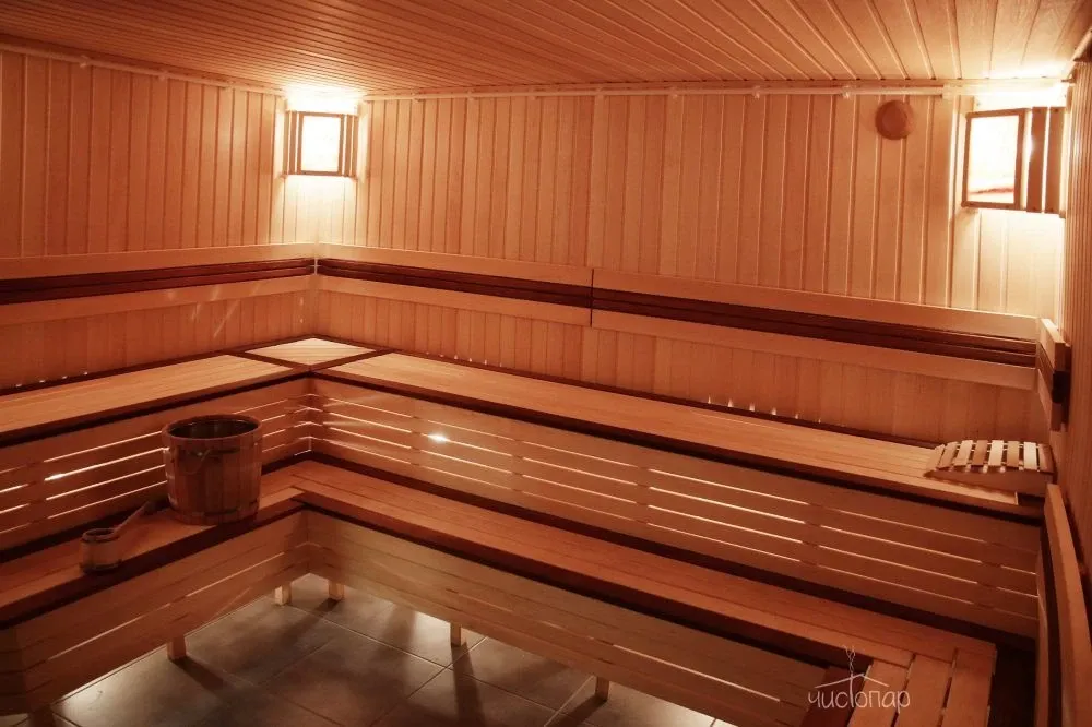 Баня и бассейн - роскошная сауна на 14+ персон с банкетным залом. Открытый бассейн на территории отдыха.