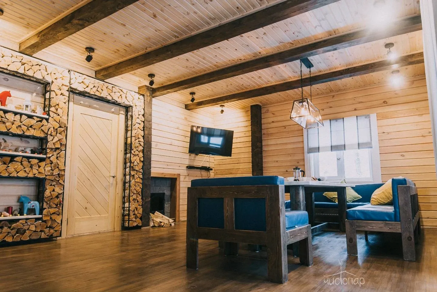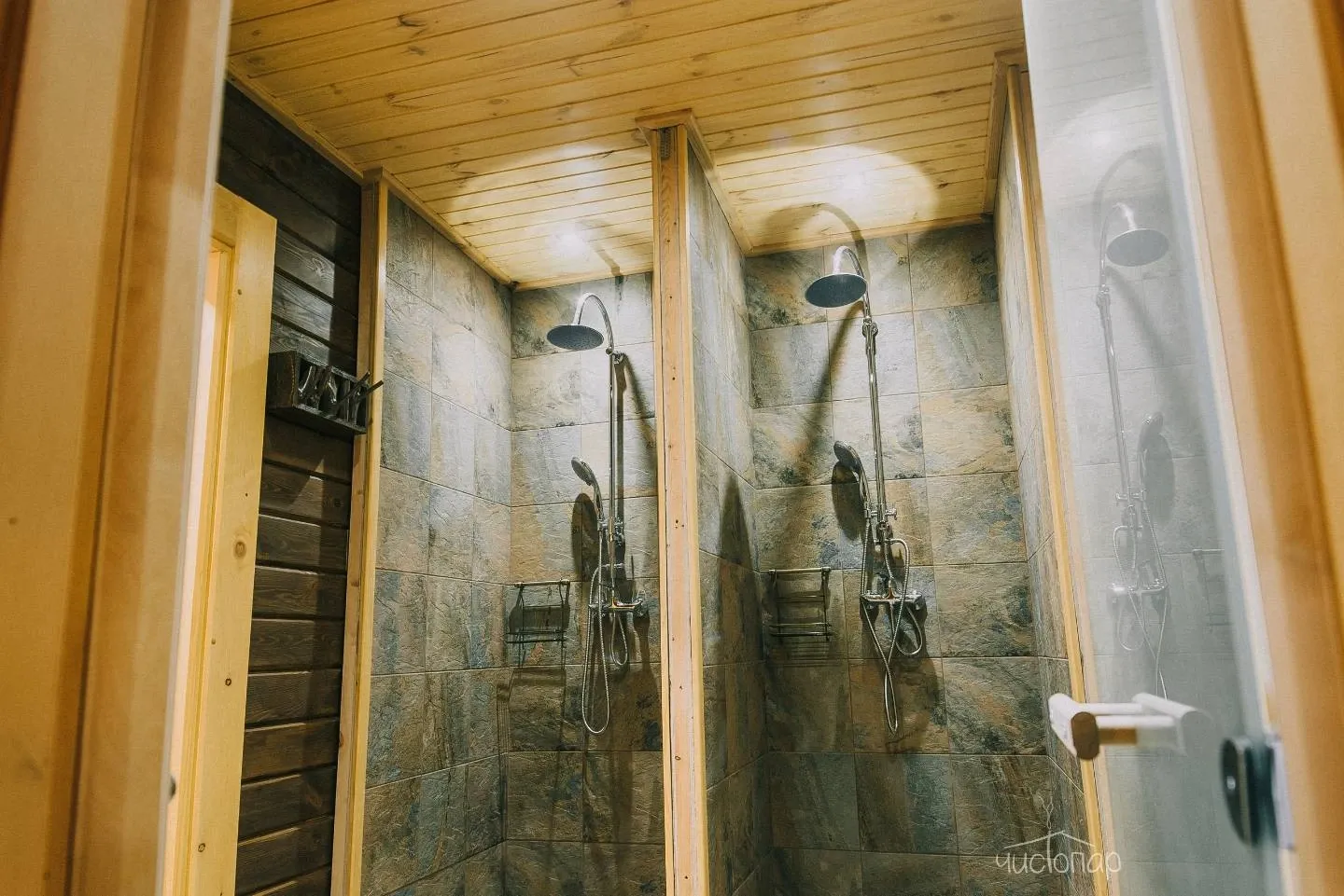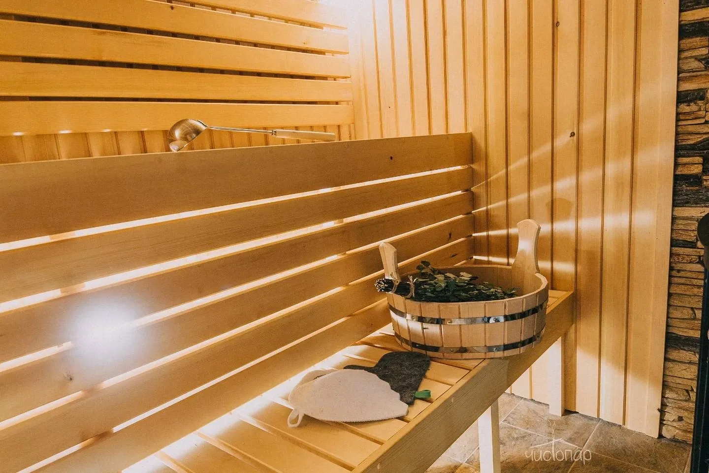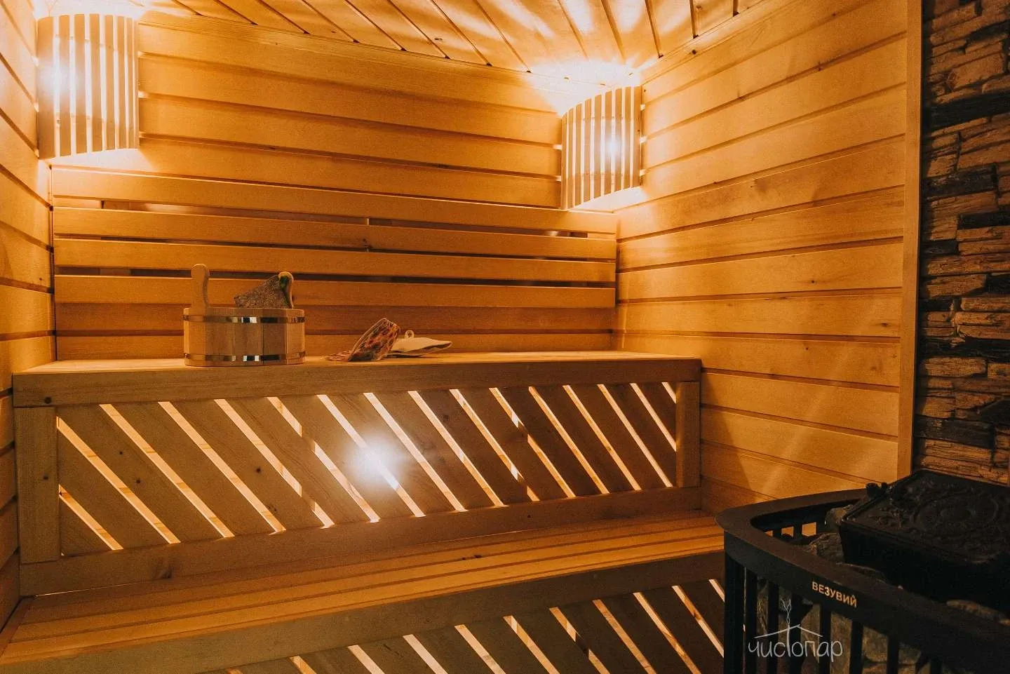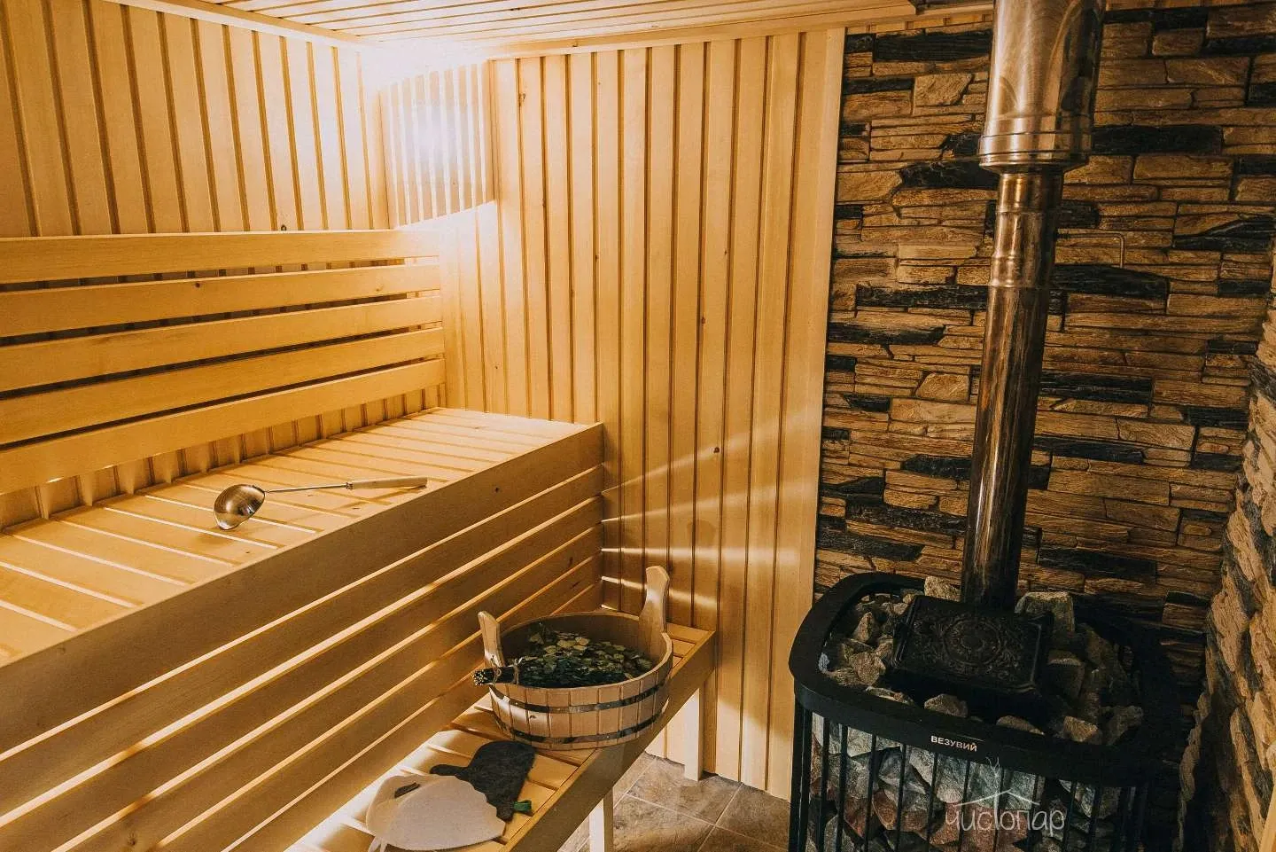 - Просторная парная из кедра с печью на дровах;