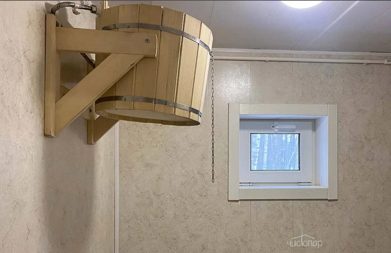Дровяная баня расположена возле большого водоема, где есть возможность после парения окунуться в озере.