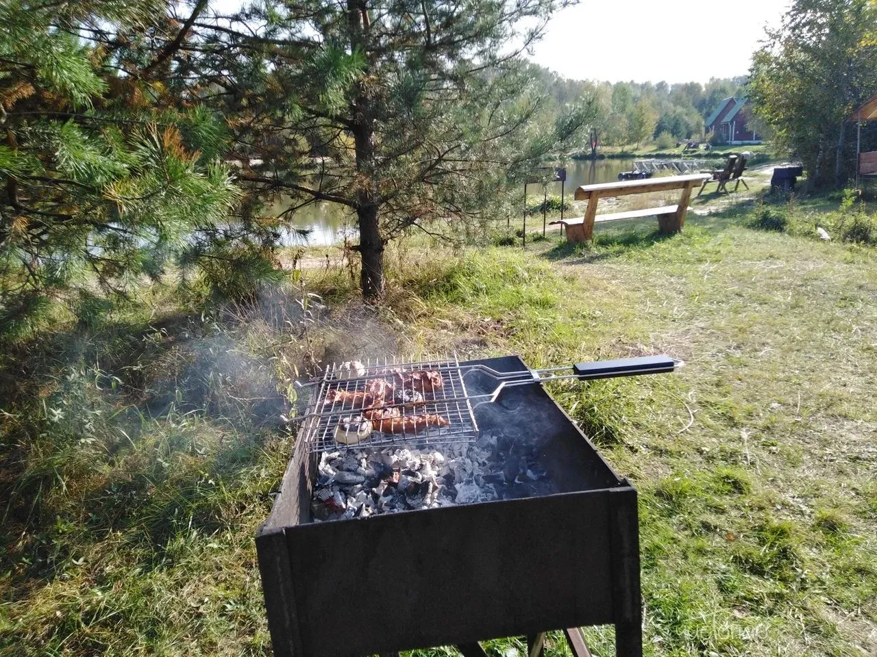 На базе отдыха есть ресторан, но есть возможность устроить и свое застолье за деревянными столами и лавками на берегу пруда.