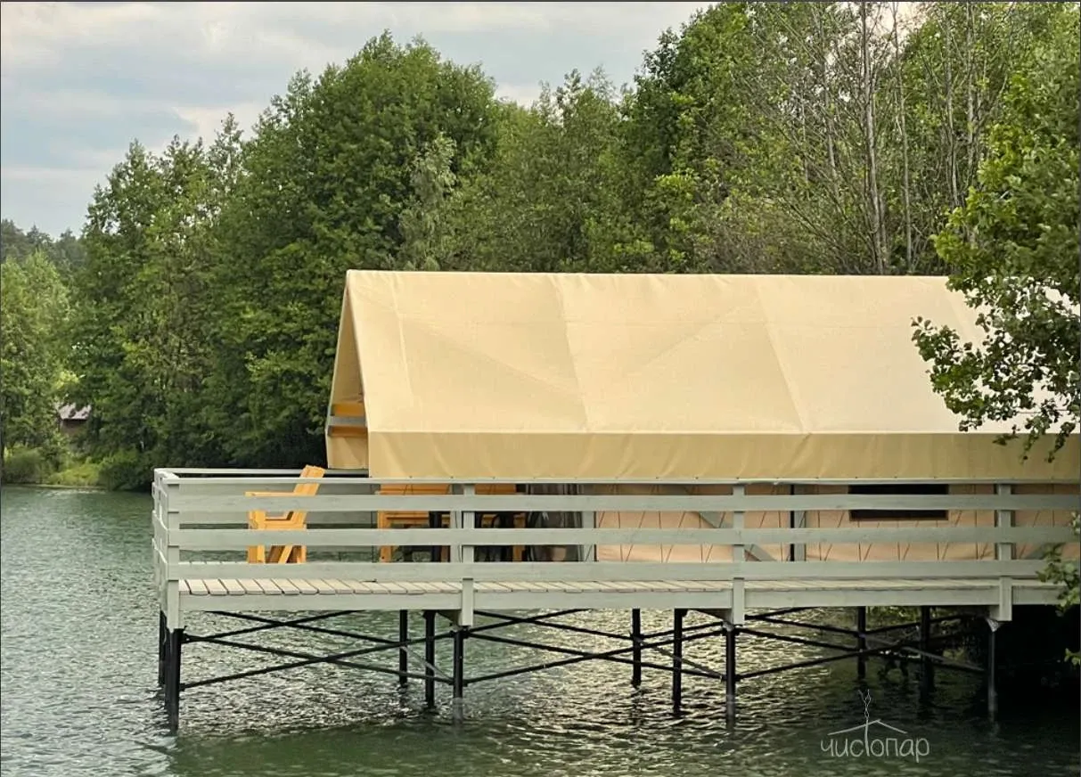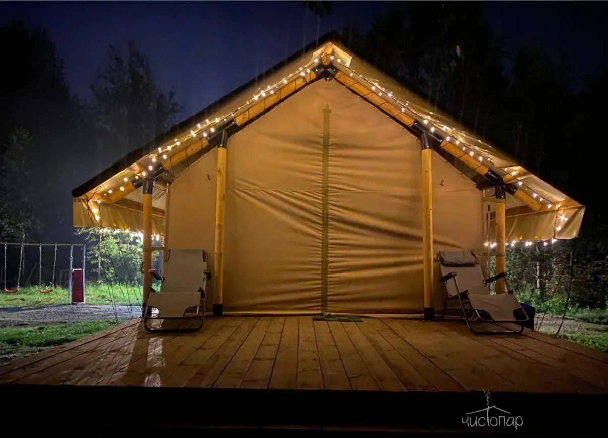 Гостей ждут вместительные сафари-тенты. Туалет и душ — в отдельном блоке. Любители сочного ароматного шашлыка могут воспользоваться мангалом с дровяной плитой.
