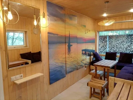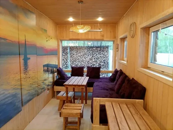 Территория глэмпинга располагает русской баней с панорамным окном и уютной зоной отдыха.