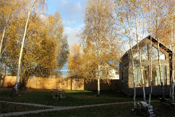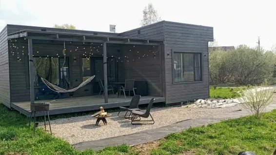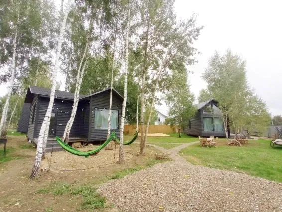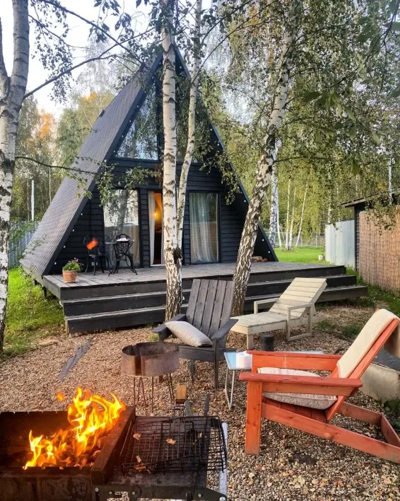 Крытая терраса и костровая и мангальная зона у каждого дома — вечера у огня, душевные разговоры, звёзды, которых не видно в городе. Гамаки, пледы и никакой суеты.