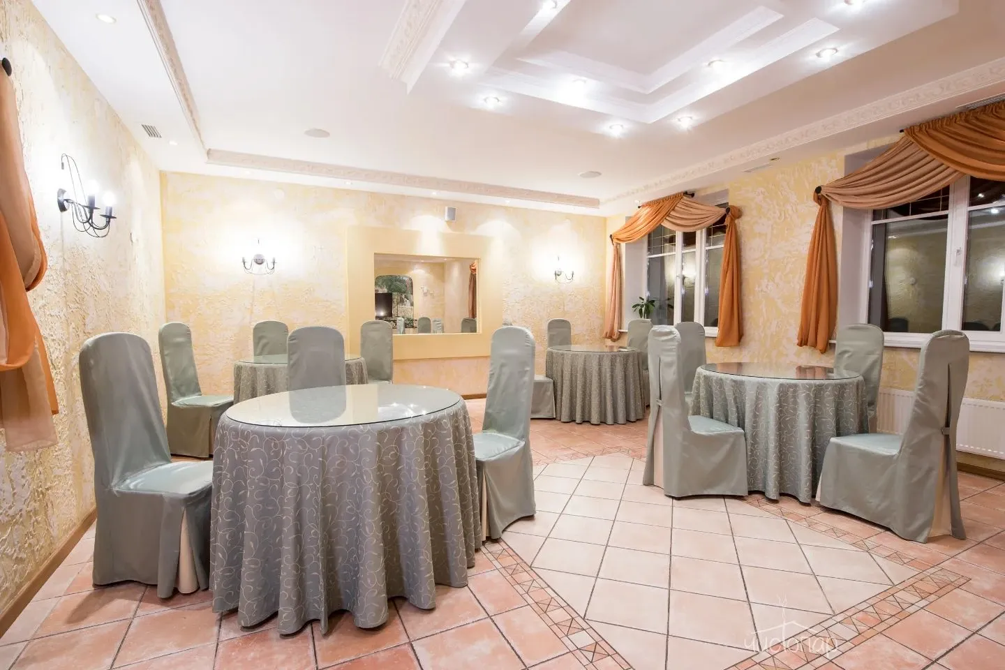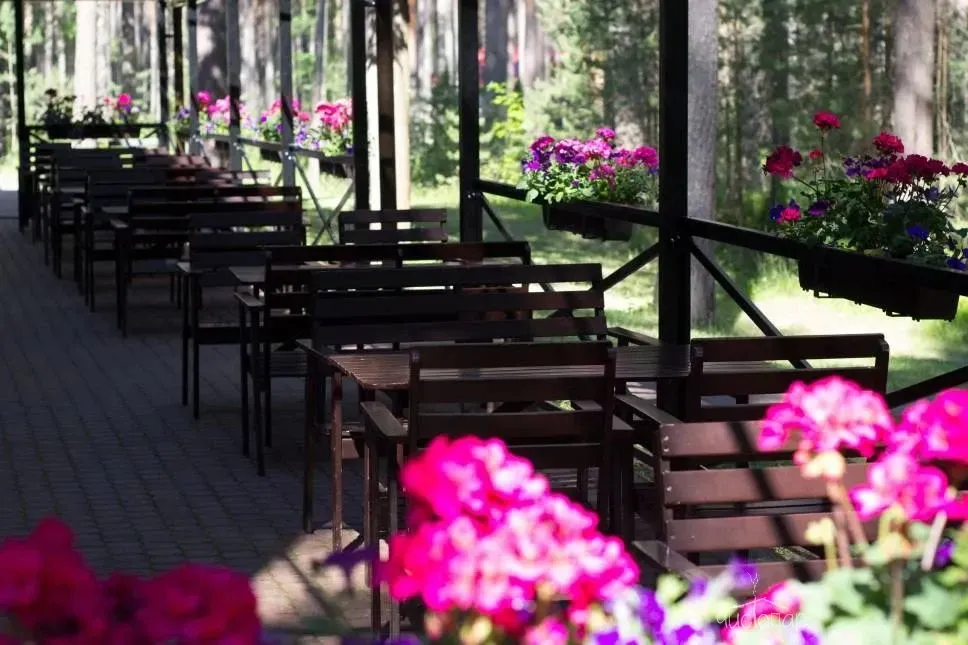 Загородный ресторан с видовой террасой и отдельными залами, командные игры, шатер на берегу озера, места для романтических прогулок, бревенчатые коттеджи и отель с видом на лес.