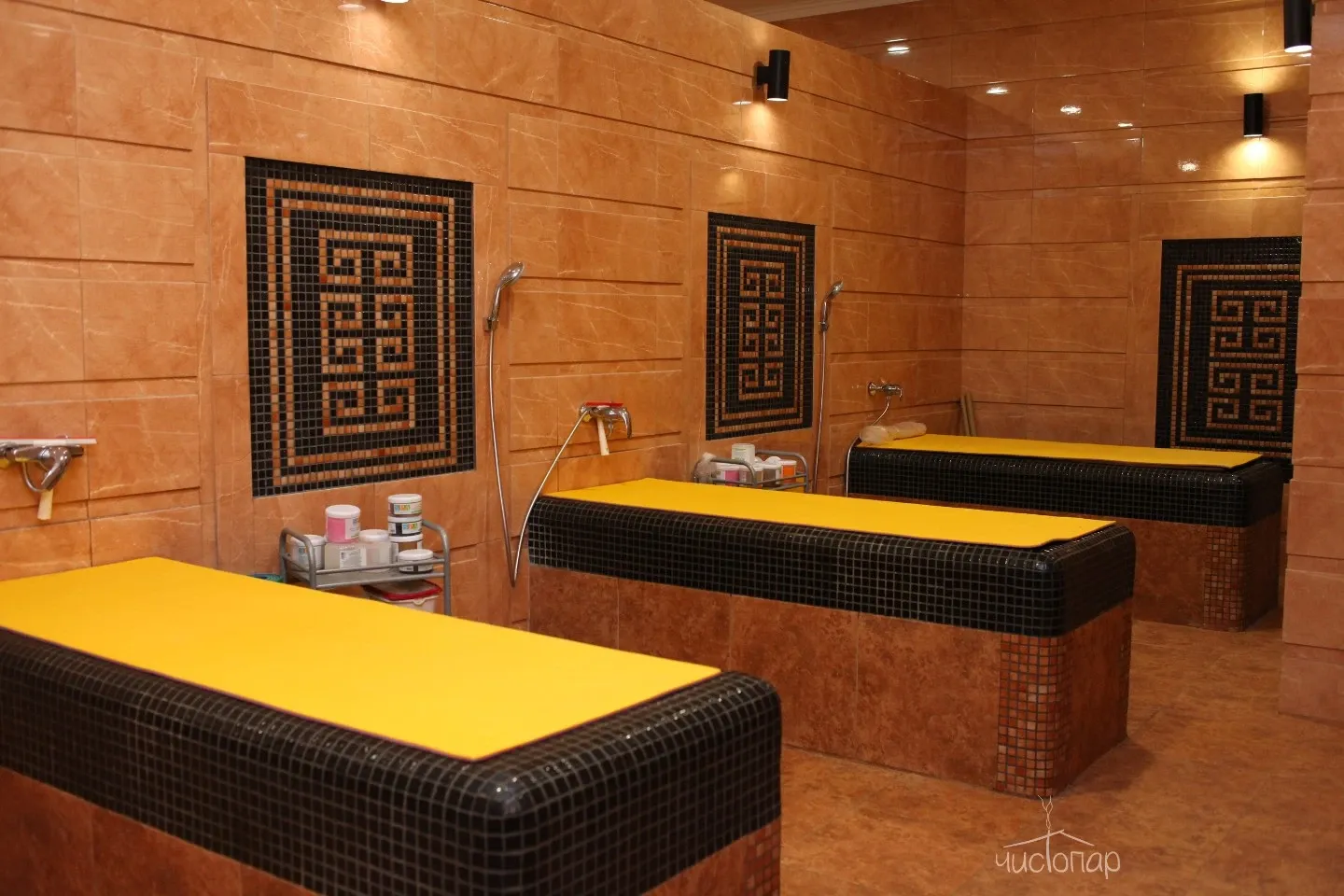 Дополнительные услуги — парение и пилинг, а также ресторан с обширным меню.
