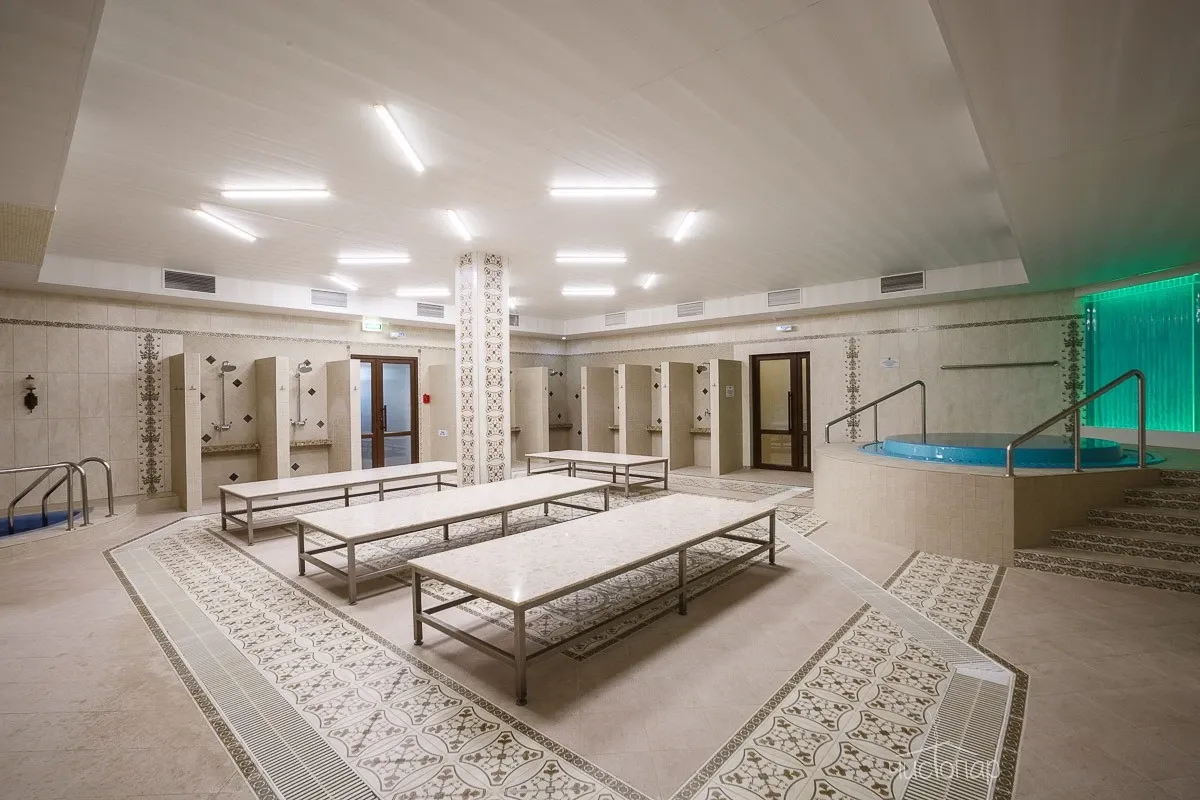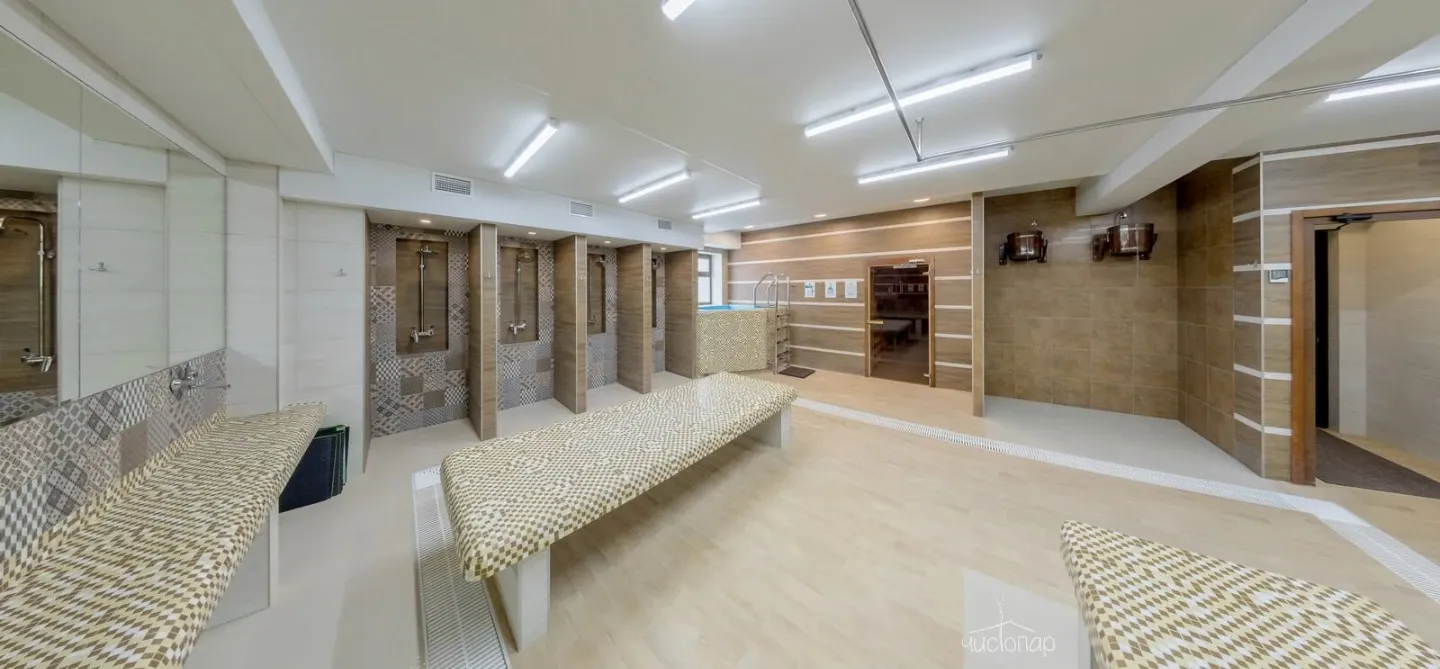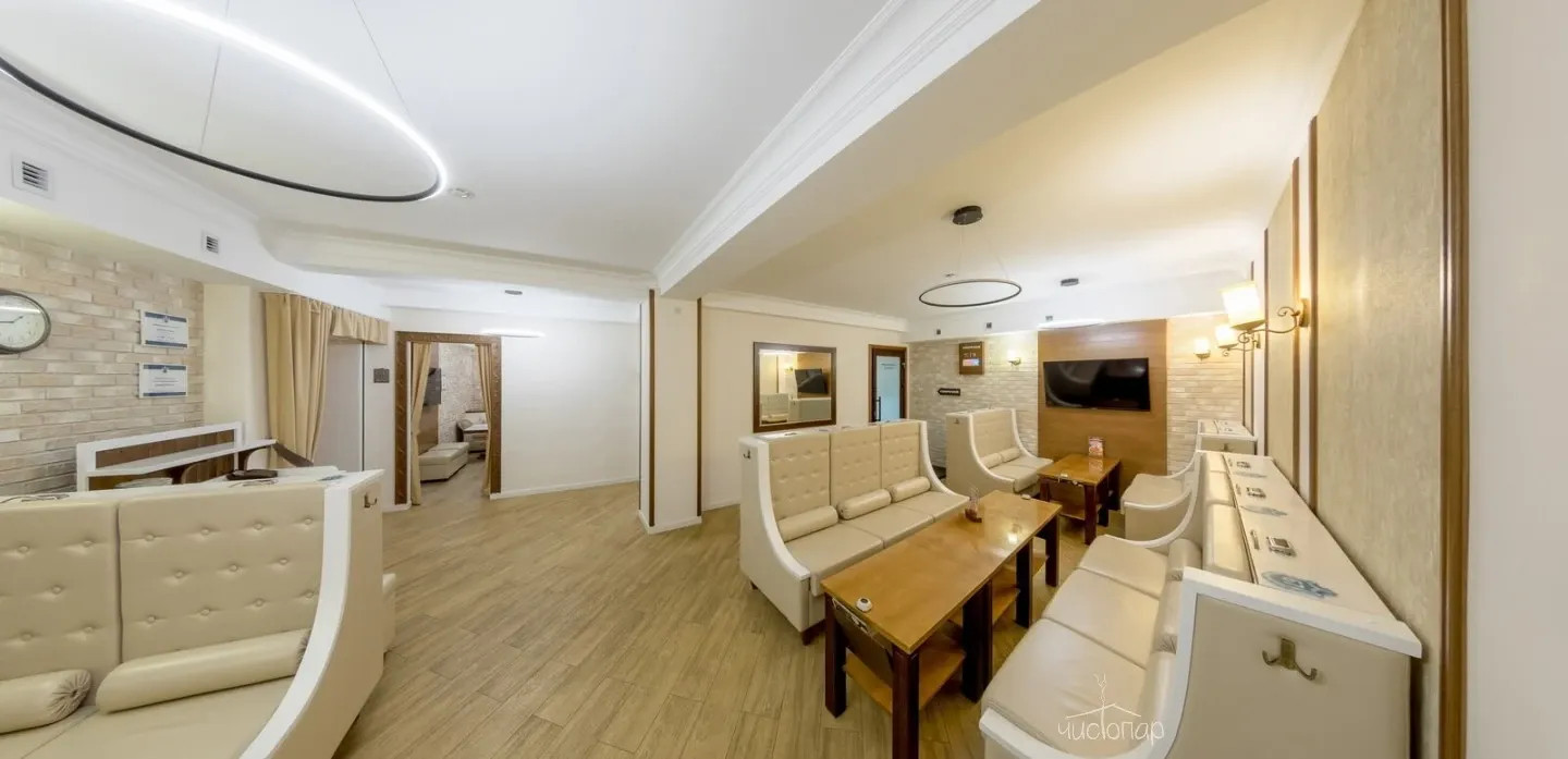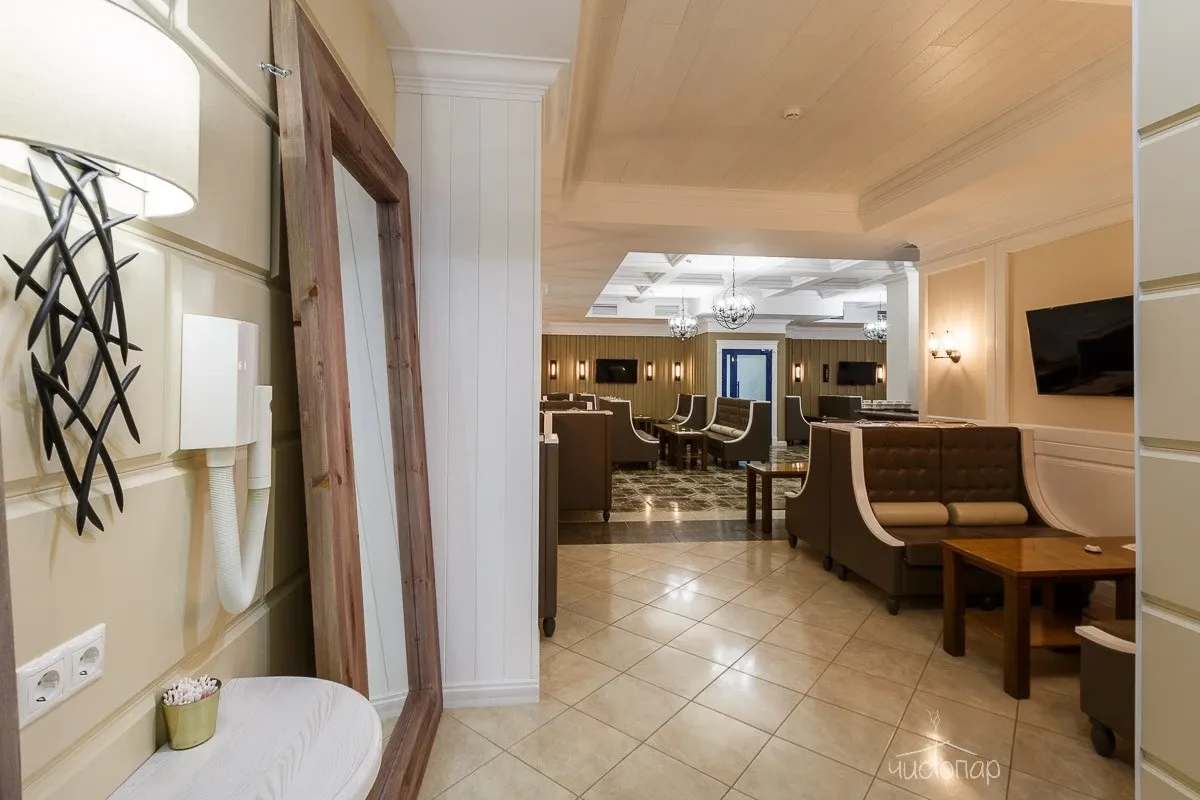 Первый этаж – просторный ресепшн, оборудованная зона отдыха с комфортными диванами, специально отведенное место для курения, бар; мегапарная, купель, джакузи, душевая, оборудованная зона процедур.