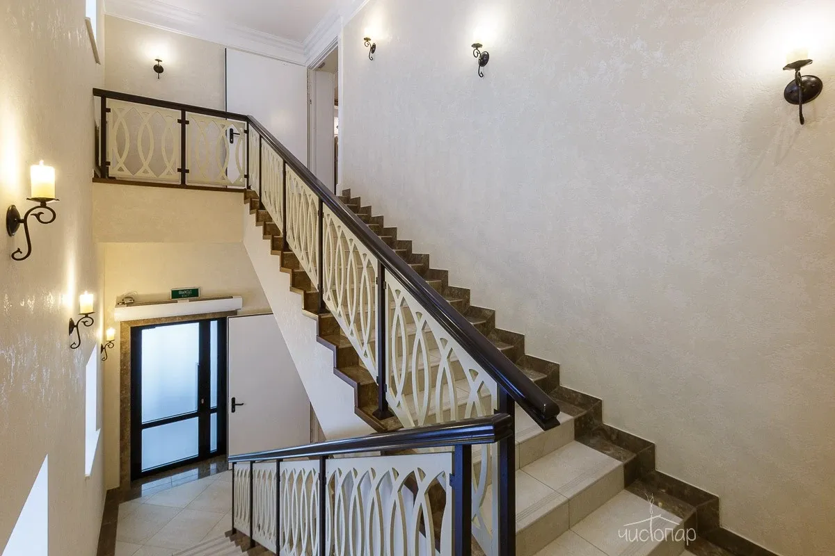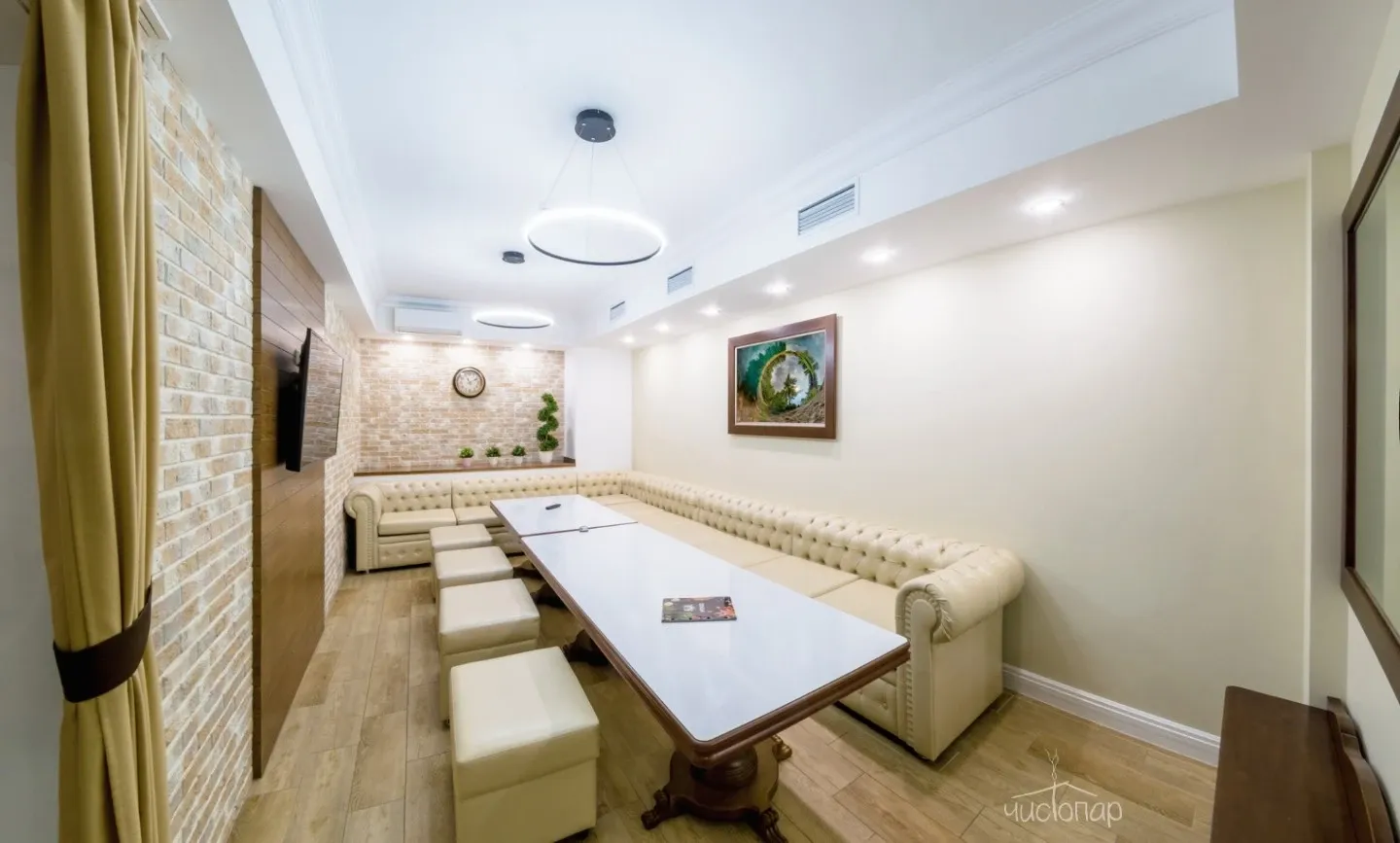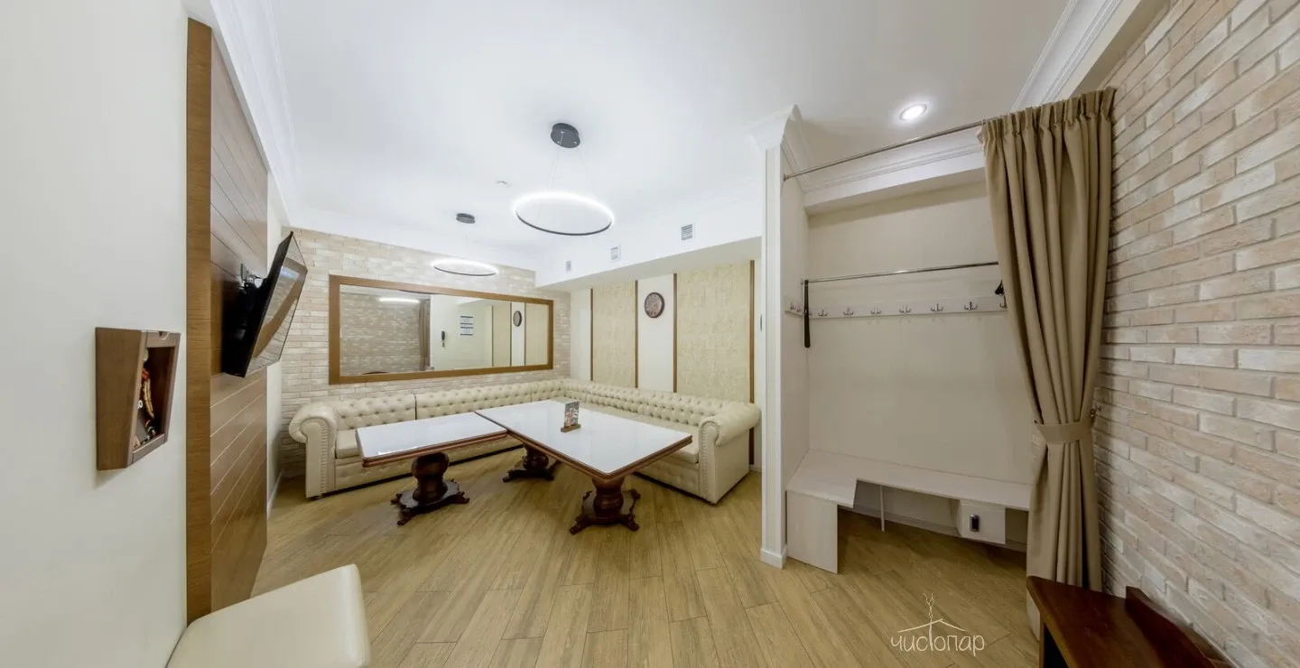 Первый этаж – просторный ресепшн, оборудованная зона отдыха с комфортными диванами, специально отведенное место для курения, бар; мегапарная, купель, джакузи, душевая, оборудованная зона процедур.