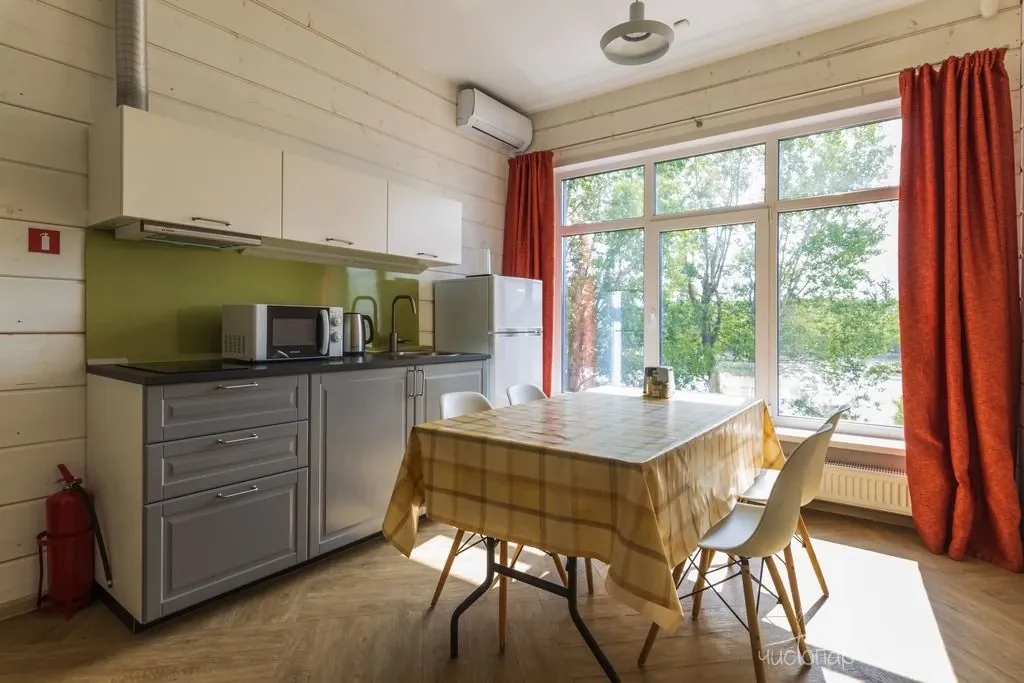 • Гостиная-кухня с большим удобным столом и необходимыми столовыми приборами и техникой