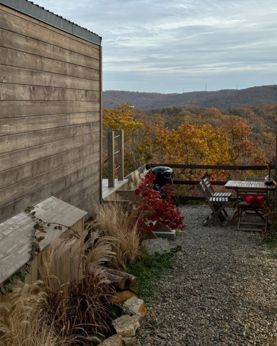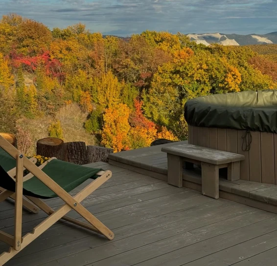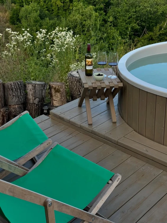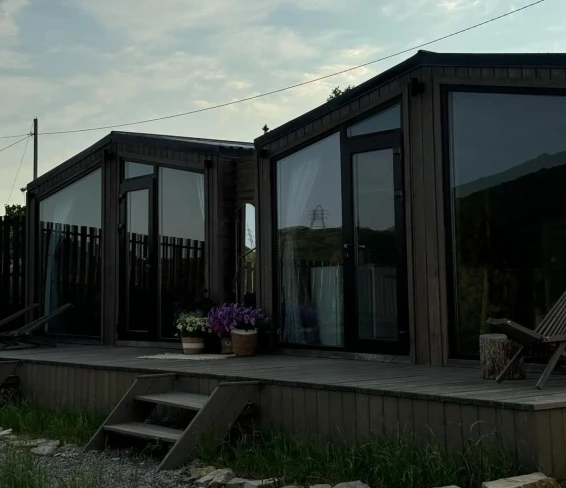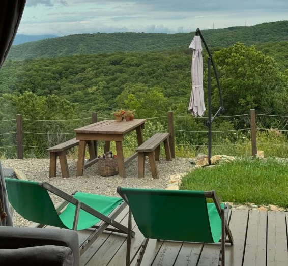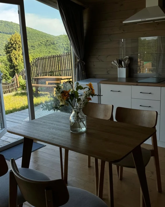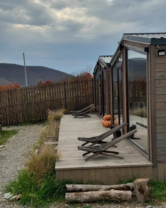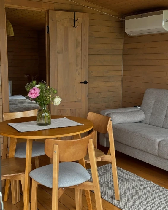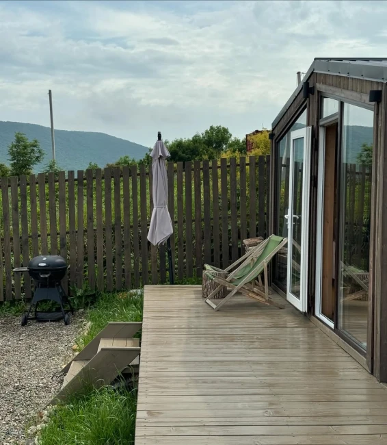 На территории отеля всего три домика. 2 домика расположены рядом друг с другом на одной террасе. У каждого домика, есть свой уличный столик, своя зона барбекю. 3 домик расположен отдельно, со своей террасой и зоной барбекю. Также в общем пользовании имеется русская баня на дровах, и купель.