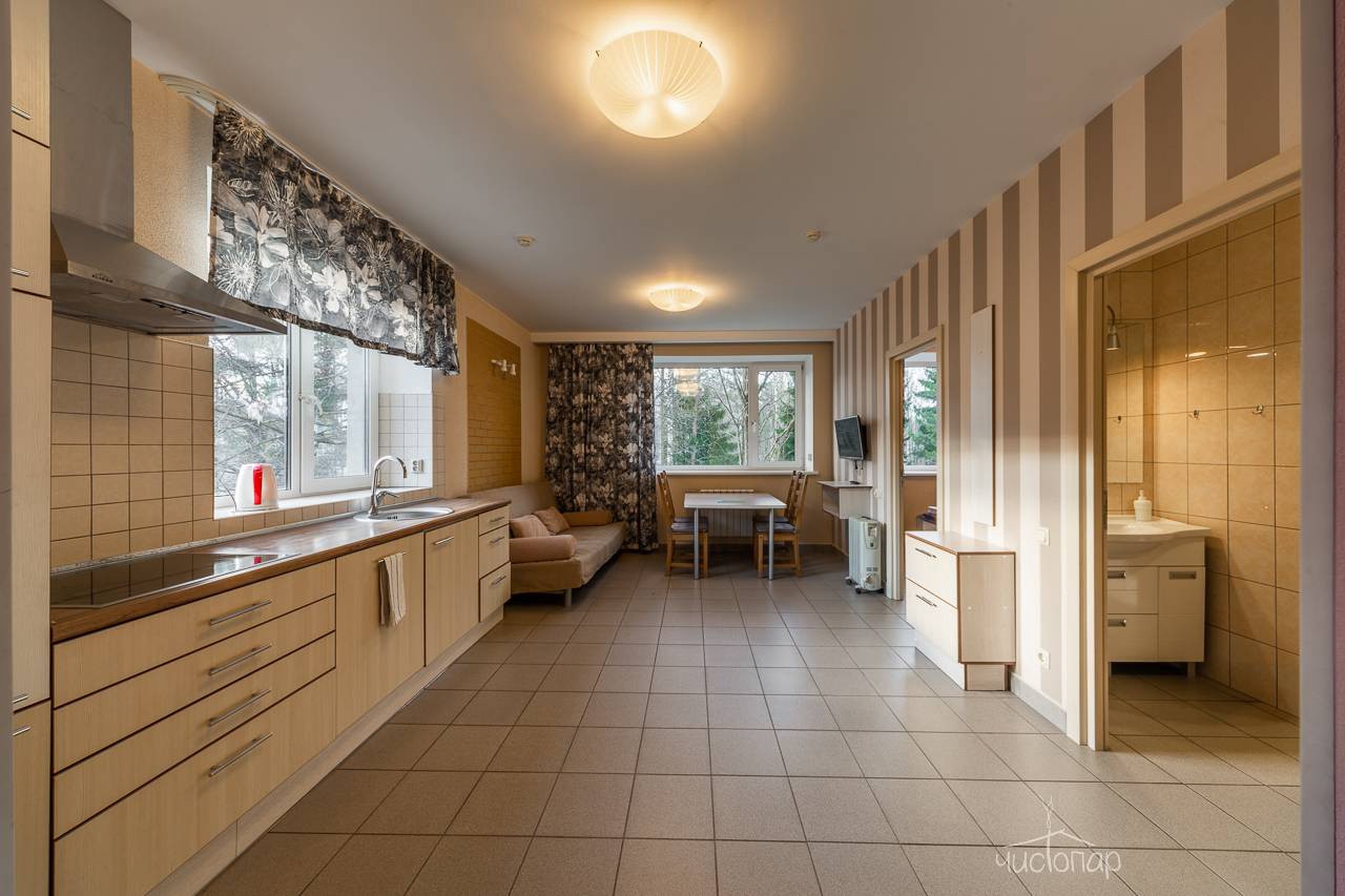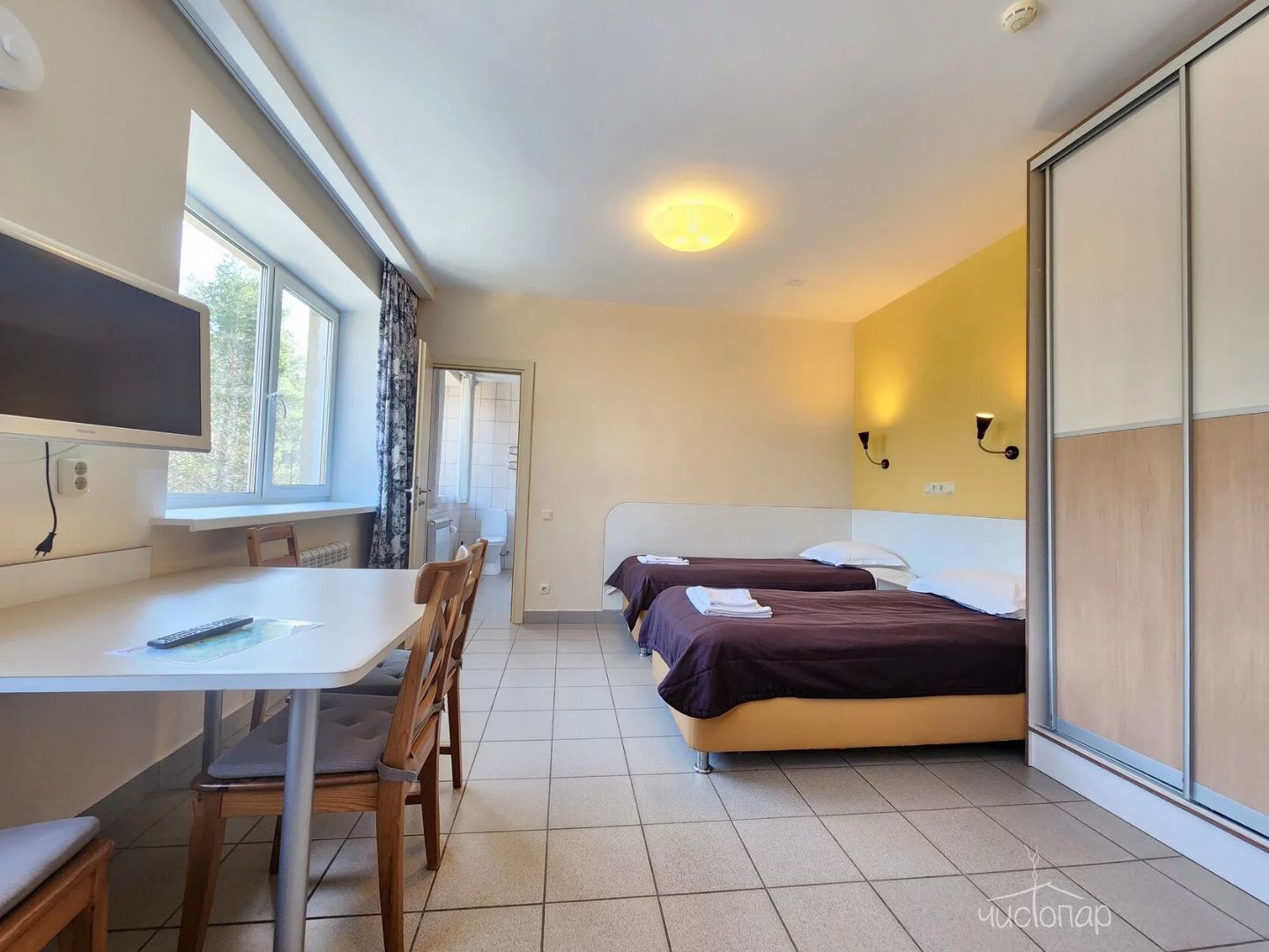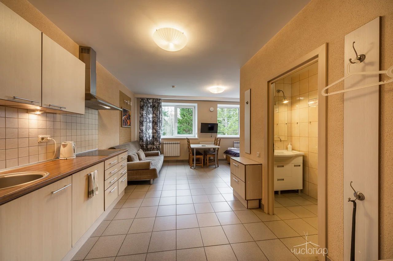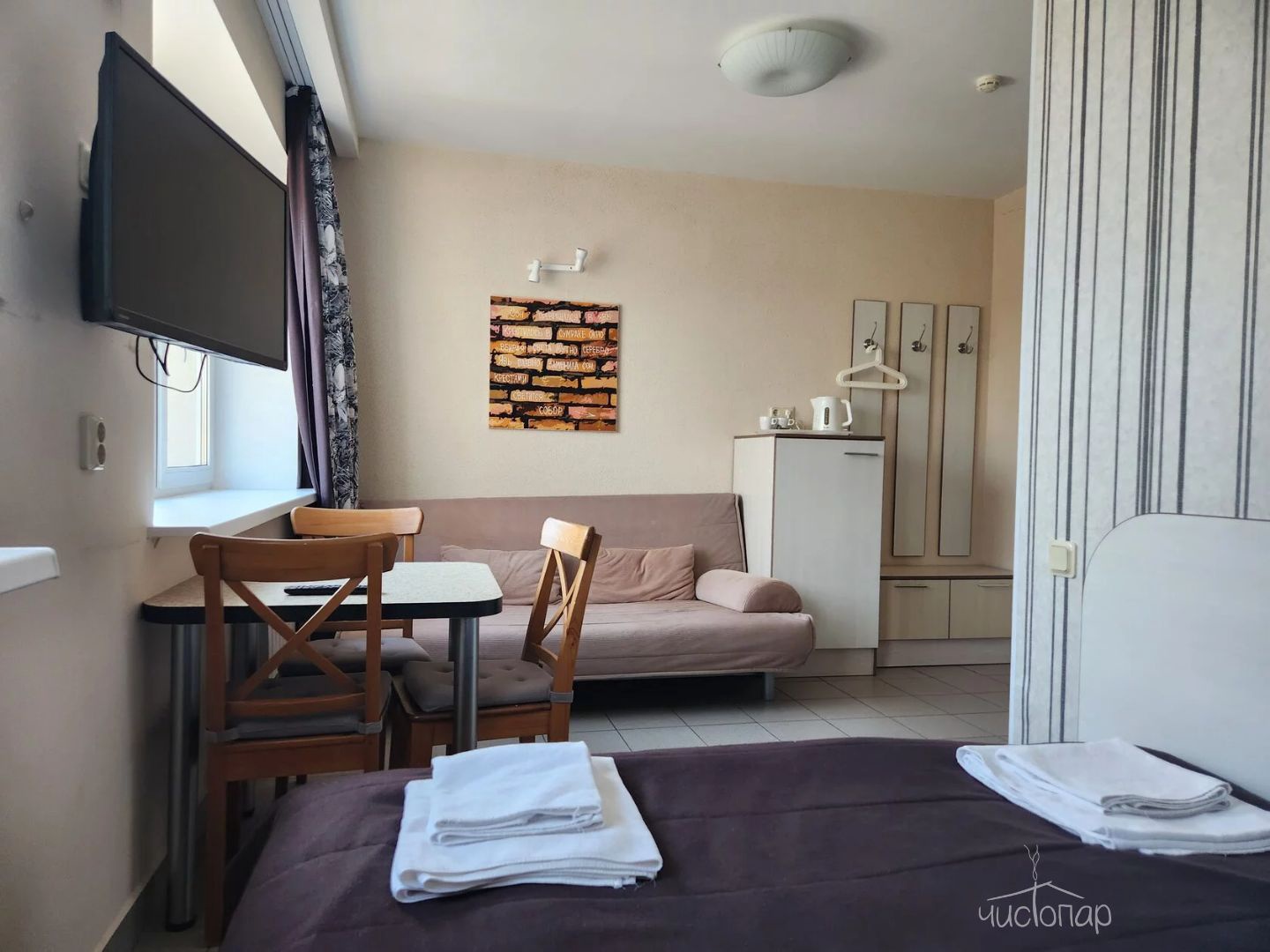 К вашим услугам: 2 телевизора, чайник, холодильник, фен, шкаф, кухонная мебель, варочная поверхность, набор кухонной посуды на 4 персоны.