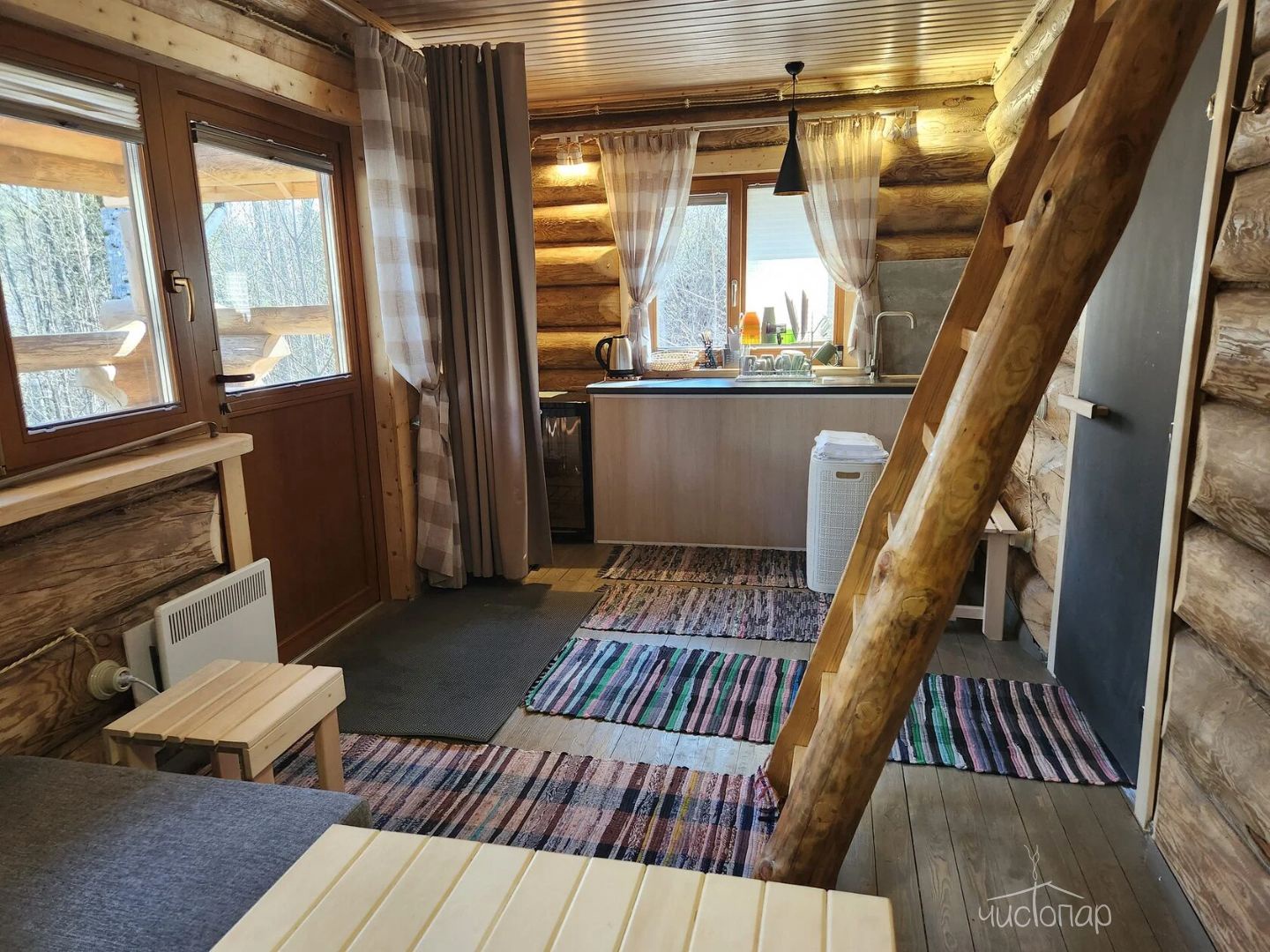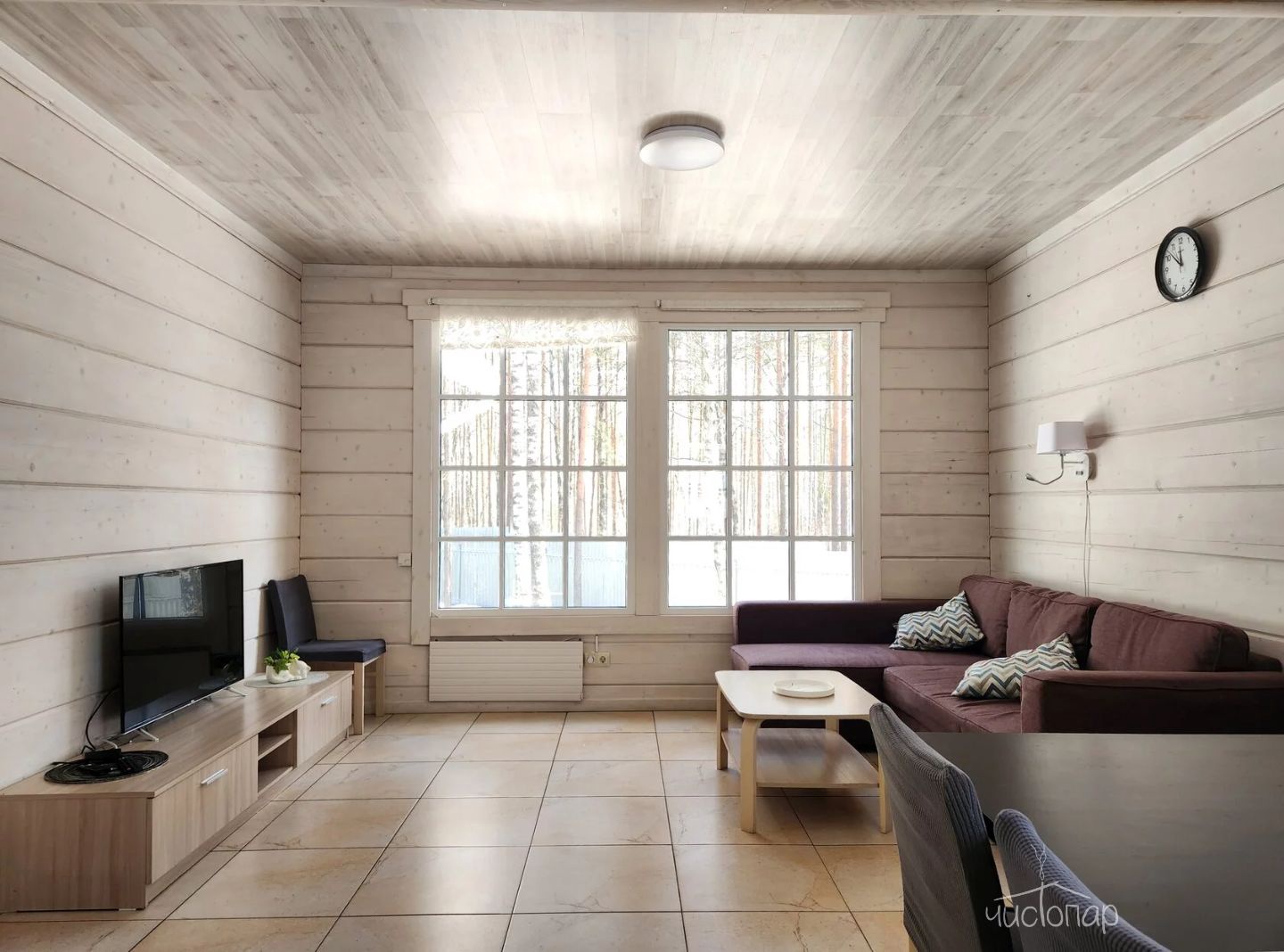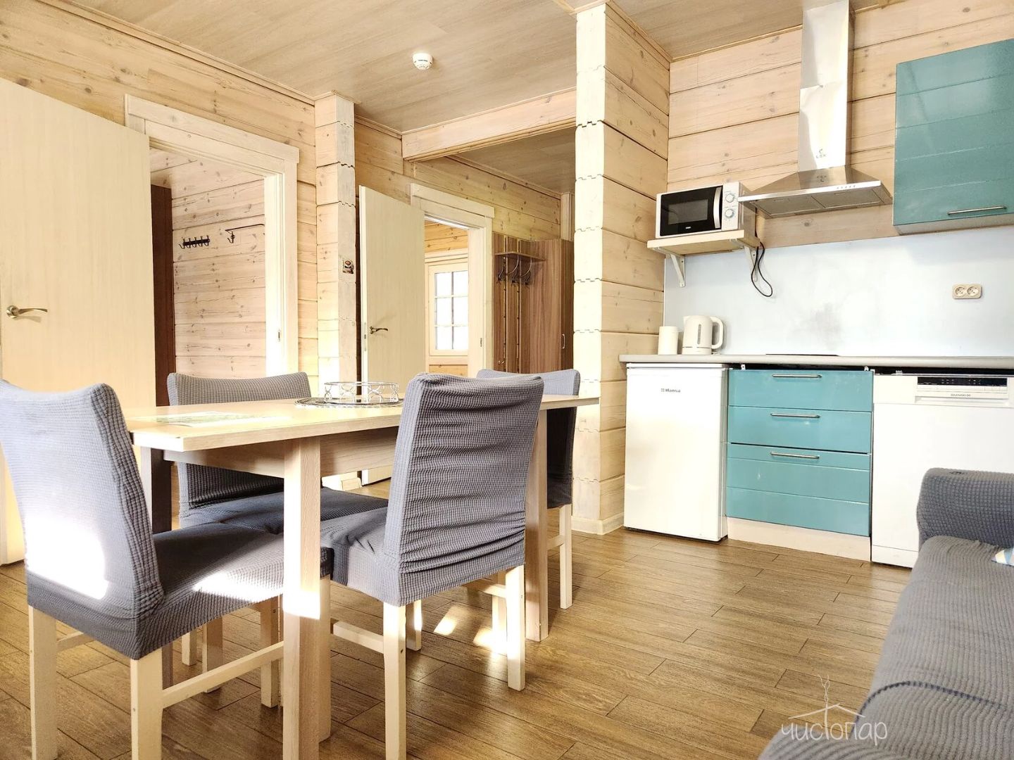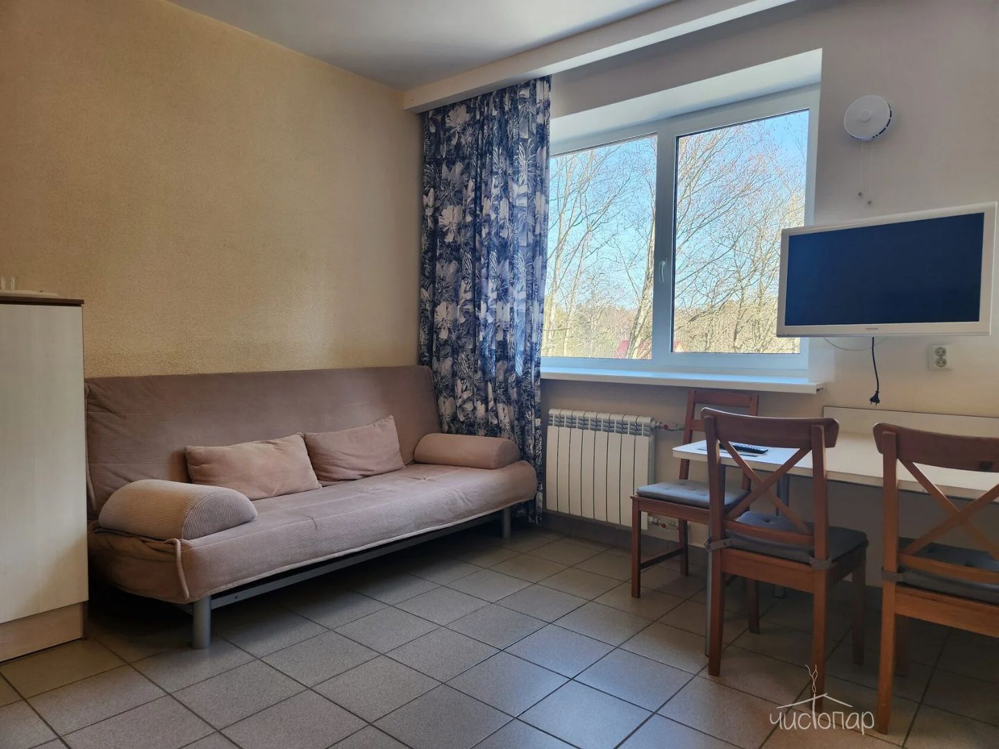К вашим услугам: 2 телевизора, чайник, холодильник, фен, шкаф, кухонная мебель, варочная поверхность, набор кухонной посуды на 4 персоны.
